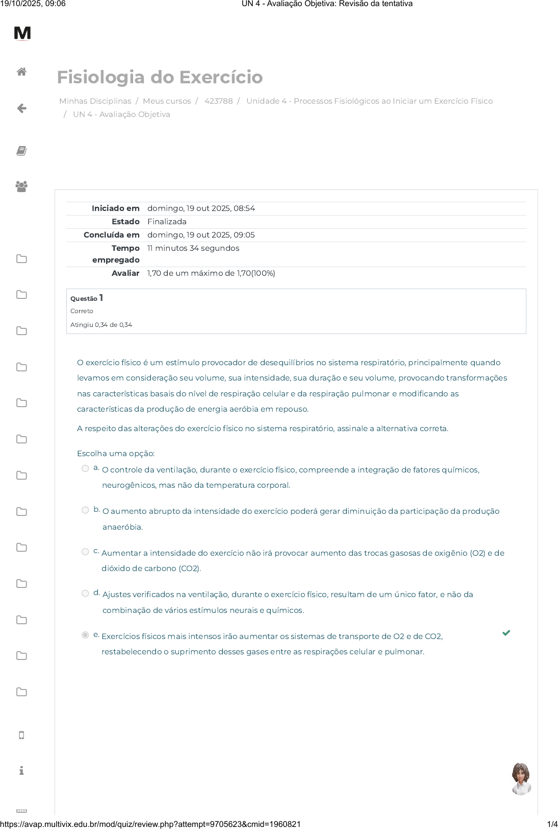 Minhas Disciplinas / Meus cursos / 423788 / Unidade 4 - Processos Fisiológicos ao Iniciar um Exercício Físico / UN 4 - Avaliação Objetiva Fisiologia do Exercício Iniciado em domingo, 19 out 2025, 08:54 Estado Finalizada Concluída em domingo, 19 out 2025, 09:05 Tempo empregado 11 minutos 34 segundos Avaliar 1,70 de um máximo de 1,70(100%) Questão 1 Correto Atingiu 0,34 de 0,34 O exercício físico é um estímulo provocador de desequilíbrios no sistema respiratório, principalmente quando levamos em consideração seu volume, sua intensidade, sua duração e seu volume, provocando transformações nas características basais do nível de respiração celular e da respiração pulmonar e modificando as características da produção de energia aeróbia em repouso. A respeito das alterações do exercício físico no sistema respiratório, assinale a alternativa correta. Escolha uma opção: a. O controle da ventilação, durante o exercício físico, compreende a integração de fatores químicos, neurogênicos, mas não da temperatura corporal. b. O aumento abrupto da intensidade do exercício poderá gerar diminuição da participação da produção anaeróbia. c. Aumentar a intensidade do exercício não irá provocar aumento das trocas gasosas de oxigênio (O2) e de dióxido de carbono (CO2). d. Ajustes verificados na ventilação, durante o exercício físico, resultam de um único fator, e não da combinação de vários estímulos neurais e químicos. e. Exercícios físicos mais intensos irão aumentar os sistemas de transporte de O2 e de CO2, restabelecendo o suprimento desses gases entre as respirações celular e pulmonar. 19/10/2025, 09:06 UN 4 - Avaliação Objetiva: Revisão da tentativa https://avap.multivix.edu.br/mod/quiz/review.php?attempt=9705623&cmid=1960821 1/4 https://avap.multivix.edu.br/my/ https://avap.multivix.edu.br/course/view.php?id=36295 https://avap.multivix.edu.br/course/view.php?id=36295§ion=5 https://avap.multivix.edu.br/mod/quiz/view.php?id=1960821 https://avap.multivix.edu.br/my/ https://avap.multivix.edu.br/course/view.php?id=36295 https://avap.multivix.edu.br/user/index.php?id=36295 https://avap.multivix.edu.br/course/view.php?id=36295§ion=1 https://avap.multivix.edu.br/course/view.php?id=36295§ion=2 https://avap.multivix.edu.br/course/view.php?id=36295§ion=3 https://avap.multivix.edu.br/course/view.php?id=36295§ion=4 https://avap.multivix.edu.br/course/view.php?id=36295§ion=5 https://avap.multivix.edu.br/course/view.php?id=36295§ion=6 https://avap.multivix.edu.br/course/view.php?id=36295§ion=7 https://avap.multivix.edu.br/course/view.php?id=36295§ion=8 https://avap.multivix.edu.br/course/view.php?id=36295§ion=9 https://avap.multivix.edu.br/course/view.php?id=36295§ion=10 https://avap.multivix.edu.br/course/view.php?id=36295§ion=11 https://avap.multivix.edu.br/course/view.php?id=36295§ion=12 https://avap.multivix.edu.br/course/view.php?id=36295§ion=13 https://avap.multivix.edu.br/hooks/portal/ https://avap.multivix.edu.br/mod/page/view.php?id=1252%2F%22%20target%3D%22_blank https://avap.multivix.edu.br/calendar/view.php/ https://avap.multivix.edu.br/ https://avap.multivix.edu.br/ https://avap.multivix.edu.br/ https://avap.multivix.edu.br/ https://avap.multivix.edu.br/ Questão 2 Correto Atingiu 0,34 de 0,34 O sistema cardiovascular disponibiliza nutrientes e O2 para os diversos órgãos do nosso corpo, transporta hormônios das glândulas endócrinas para os receptores-alvo, remove CO2 e metabólitos do metabolismo celular e, ainda, participa da manutenção da temperatura corporal e do equilíbrio acidobásico. A respeito das alterações do exercício nesse sistema, analise as afirmativas abaixo. I. As adaptações ao exercício são consideradas mudanças que acontecem em resposta ao estresse crônico do treinamento físico. II. Observam respostas agudas em relação ao volume de ejeção, à frequência cardíaca, ao débito cardíaco e à pressão arterial. III. A resposta dos ciclos cardíacos gera aumento da quantidade de trabalho que o coração irá requerer no atendimento ao aumento de demandas do organismo em exercício. É correto, apenas, o que se afirma em: Escolha uma opção: a. II e III. b. I, II e III. c. I. d. I e II. e. III. 19/10/2025, 09:06 UN 4 - Avaliação Objetiva: Revisão da tentativa https://avap.multivix.edu.br/mod/quiz/review.php?attempt=9705623&cmid=1960821 2/4 https://avap.multivix.edu.br/my/ https://avap.multivix.edu.br/course/view.php?id=36295 https://avap.multivix.edu.br/user/index.php?id=36295 https://avap.multivix.edu.br/course/view.php?id=36295§ion=1 https://avap.multivix.edu.br/course/view.php?id=36295§ion=2 https://avap.multivix.edu.br/course/view.php?id=36295§ion=3 https://avap.multivix.edu.br/course/view.php?id=36295§ion=4 https://avap.multivix.edu.br/course/view.php?id=36295§ion=5 https://avap.multivix.edu.br/course/view.php?id=36295§ion=6 https://avap.multivix.edu.br/course/view.php?id=36295§ion=7 https://avap.multivix.edu.br/course/view.php?id=36295§ion=8 https://avap.multivix.edu.br/course/view.php?id=36295§ion=9 https://avap.multivix.edu.br/course/view.php?id=36295§ion=10 https://avap.multivix.edu.br/course/view.php?id=36295§ion=11 https://avap.multivix.edu.br/course/view.php?id=36295§ion=12 https://avap.multivix.edu.br/course/view.php?id=36295§ion=13 https://avap.multivix.edu.br/hooks/portal/ https://avap.multivix.edu.br/mod/page/view.php?id=1252%2F%22%20target%3D%22_blank https://avap.multivix.edu.br/calendar/view.php/ https://avap.multivix.edu.br/ https://avap.multivix.edu.br/ https://avap.multivix.edu.br/ https://avap.multivix.edu.br/ https://avap.multivix.edu.br/ Questão 3 Correto Atingiu 0,34 de 0,34 Questão 4 Correto Atingiu 0,34 de 0,34 Realizar exercícios físicos compreende um estresse fisiológico para o nosso organismo, principalmente em função do aumento da demanda energética em relação ao repouso, provocando liberação de calor e intensa modific