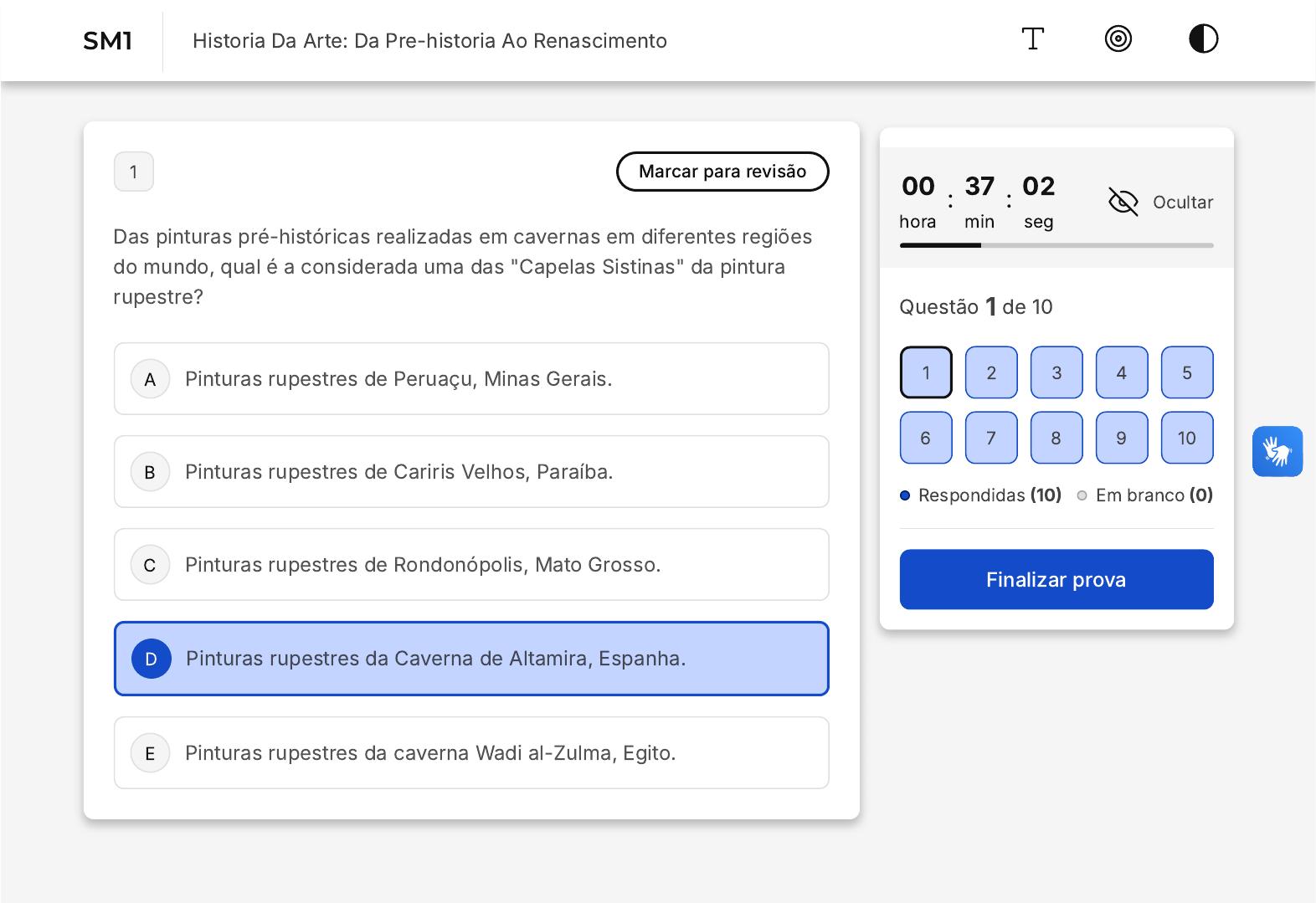 A B C D E 1 Marcar para revisão Das pinturas pré-históricas realizadas em cavernas em diferentes regiões do mundo, qual é a considerada uma das "Capelas Sistinas" da pintura rupestre? Pinturas rupestres de Peruaçu, Minas Gerais. Pinturas rupestres de Cariris Velhos, Paraíba. Pinturas rupestres de Rondonópolis, Mato Grosso. Pinturas rupestres da Caverna de Altamira, Espanha. Pinturas rupestres da caverna Wadi al-Zulma, Egito. 00 hora : 37 min : 02 seg Ocultar Questão 1 de 10 Respondidas (10) Em branco (0) Finalizar prova 1 2 3 4 5 6 7 8 9 10 SM1 Historia Da Arte: Da Pre-historia Ao Renascimento A B C D E 2 Marcar para revisão No que diz respeito ao estudo da História da Arte, podemos afirmar que cabe ao conhecimento sobre as artes plásticas e arquitetônicas: Estudar registros, objetos e obras localizados por meio de escavações arqueológicas, que estão em coleções de museus e/ou particulares ou que são monumentos históricos (nacionais ou estrangeiros), bem como a historiografia da arte (Literatura artística). Estudar objetos apenas de coleções particulares, nacionais ou estrangeiras. Não estreitar diálogo com as escavações arqueológicas, pois na História da Arte importa apenas aquilo que é contemporâneo. Estudar apenas as obras encontradas em museus. Estudar apenas os momumentos históricos nacionais. A B C D E 3 Marcar para revisão Stonehenge, no Reino Unido, é considerada: Uma estrutura de madeira, organizada para realização de rituais religiosos no período neolítico. Uma estrutura, com círculos concêntricos de pedra, organizadas entre 3.100 e 2.700 a.C., para observações astronômicas e religiosas. Uma estrutura de pedra organizada para moradia, construída entre o período de 3.000 e 1.000 a.C. Uma estrutura de pedra, com mais de 20 metros de altura, para realização de rituais de cura. Uma estrutura de madeira e pedra, com círculos concêntricos, para observações astronômicas. A B C D E 4 Marcar para revisão Sobre os objetos de estudo da História da Arte, podemos afirmar que: Foram estudadas somente pinturas do Renascimento. As bases constituintes das pesquisas em História da Arte se devem ao colecionismo, aos museus, aos achados arqueológicos, aos artistas e à literatura artística. Encontram-se somente nos museus públicos especializados em pintura e escultura. Refere-se às pinturas e esculturas realizadas a partir do século XV, ou seja, do Renascimento. São obras primas de pintores e escultores de grande destaque na Itália. 5 Marcar para revisão A B C D E O que é a Vênus de Willendorf? Um artefato pré-histórico representando uma mulher, esculpida em calcário de cor avermelhado, encontrado em 1908, em um sítio arqueológico na Áustria. Um artefato pré-histórico representando um animal, esculpido em calcário e localizado por meio de escavações arqueológicas na França. Um artefato pré-histórico representando um homem, esculpido em marfim de mamute, que fora localizado em um sítio arqueológico na Espanha. Um artefato pré-histórico, localizado em 1908, em um sítio arqueológico na Espanha. Um artefato pré-histórico representando um animal que se encontra no Museu do Louvre, na França. 6 Marcar para revisão A B C D E Quatro quesitos/preceitos nos ajudam a compreender a arte egípcia, a saber: A lei da frontalidade ou ângulo de maior visibilidade, a arte do complemento, a cor e os materiais e a flexibilidade. A lei da frontalidade ou ângulo de maior visibilidade e a arte do complemento. A arte do complemento e a flexibilidade. O ângulo de maior visibilidade e a cor e os materiais. A lei da frontalidade ou ângulo de maior visibilidade. 7 Marcar para revisão O que é a Vitória de Samotrácia e onde ela se encontra? A B C D E É a representação de uma deusa grega, exemplar representativo do período helenístico, e encontra-se exposta no Museu do Louvre, em Paris, França. É a representação de um deus grega, exemplar representativo do período clássico, e encontra-se exposta no Museu Nacional de Arte Antiga, em Lisboa, Portugal. É a representação de um esportista grego, exemplar representativo do período clássico, e encontra-se exposta no Museu de Atenas, em Atenas, Grécia. É a representação de uma mulher, carregando flores, exemplar representativo do período arcaico, e encontra-se exposta no Museu do Prado, em Madri, Espanha. É a representação de um deus, representativo do período arcaico, e encontra-se exposta no Museu do Louvre, em Paris, França. 8 Marcar para revisão Sabe-se que grande parte da história do Egito é conhecida pelas construções das pirâmides. Sobre as funções das pirâmides podemos A B C D E afirmar que: As pirâmides eram os túmulos reais do Império Antigo e também Médio, tendo a função tumular para o corpo do faraó. A função das pirâmides era constituir uma morada segura para os escravos. As pirâmides eram espaços de culto e também morada da população. As pirâmides serviam de abrigo para a população quando as enchentes do Rio Nilo ocorriam. As pirâmides eram a morada da família real e dos escribibas. 9 Marcar para revisão A respeito da pintura romana do período da Antiguidade, assinale a alternativa correta: A B C D E Na pintura romana há um diálogo entre a pintura e a arquitetura - a pintura adorna os ambientes internos e/ou reservados (tumulares e residências) mas também os espaços públicos (afrescos em arquiteturas religiosas, termas, templos, entre outros). Pintura e Arquitetura estão completamente dissociadas, de modo que se verifica a pintura apenas em tela durante o período. Verifica-se a presença da pintura romana apenas nos ambientes internos e/ou reservados (residências e túmulos). A pintura romana adorna apenas a Arquitetura religiosa. Observa-se a presença da pintura apenas no ambiente interno das residências e em alguns templos religiosos. 10 Marcar para revisão A respeito da arte egípcia do período da Anti