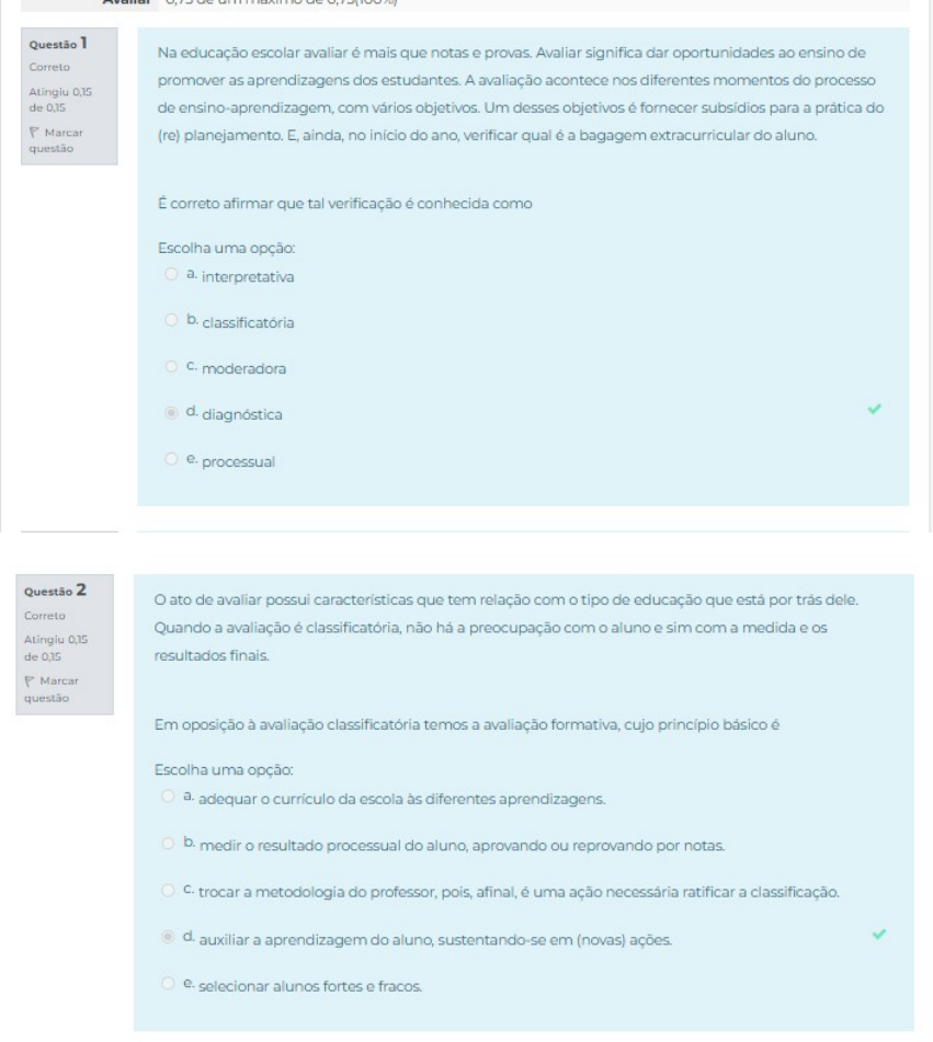Na educacao escolar avaliar é mais que notas e provas. Avaliar significa dar oportunidades ao ensino de promover as aprendizagens dos estudantes. A avaliação acontece nos diferentes momentos do processo de ensino-aprendizagem, com vários objetivos. Um desses objetivos é fornecer subsidios para a prática do (re) planejamenta. E, ainda, no inicio do ano, verificar qual é a bagagem extracurricular do aluno. É correto afirmar que tal verificação é conhecida como a. interpretativa b. classificatória c. moderadora d. diagnóstica e. processual