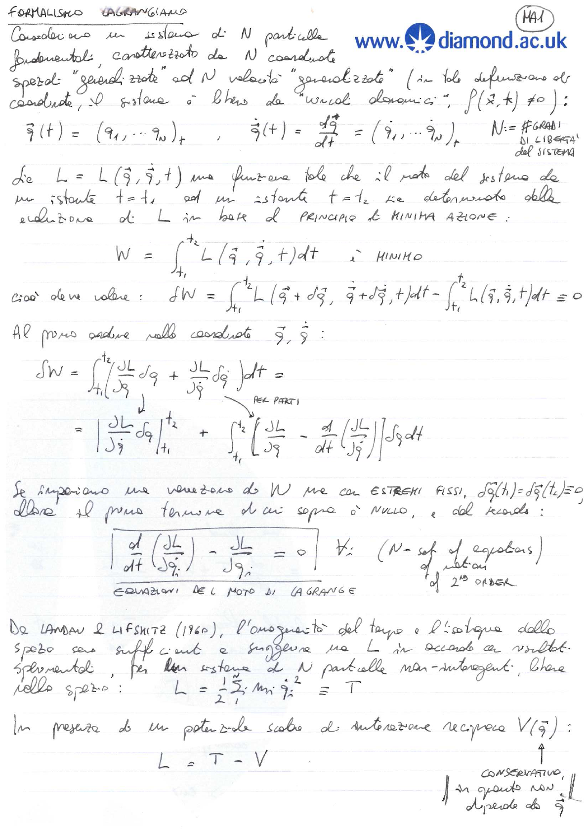 FORMALISMO MA1 N particulle diamond.ac.uk de N N of de ) : = (91, / = dt = N:= = DI LIBERTA' del SISTEMA L = L me il del de in istante ed Le able L in d PRINCIPLE MINIMA W = t2 dt i MINIMO = + Al tz JL JL = + = PER PARTI t2 of + - dt t, Se the do me can ESTREMI FISSI, d NULLO, e del ) - JL = 0 (N- of ) of MOTO DI of ORDER De LANDAN & LIFSHITZ (1960), del suff e L in or per d N : L = T do in V(9) : = - CONSERVATIVO, in NON doh del do : JL = JV = - JV EQ. DEL 01 NEWTON JL = e FORZA = - JV In i do tale DI GENERALIZZATO = JL Dollo def / = = of JL = Jr. JL = L in del TEMPO dt d L = JL + JL + JL = = JL + Jg: ) JL + = at of JL ) at JL - ) = - It JL If me to L = V, me dt ( 2 - T+V) + = dt (T + = - JL 2T ad IF L does NOT depend from T+V= + = ENERGA del E = JL ) - L = + loscie L in wel in => energeFORMALISRO MA2 Le LEGENDRE L e diamond.ac.uk 9, 9 in d HAMILTONIANA del H = - per L = T Dolle H JH = DEL DI 2N - set del dd JH = - JL = A JL = - dp: = - p; dt DI LIOUVILLE : d M.Weiss (DISPENSE) TRASFORMAZIONI legg Q: = PN) = N P. = in, PN) Eye date se delle = done = = dt e d POIN es: 11 PHASE SPACE VOLUME N SS 2 SS of PHASE SPACE AREAS the let- 162 - A SHORT DEMONSTRATION OF LIOUVILLE'S THEOREM* M. Weiss CERN, Geneva, Switzerland ABSTRACT A brief demonstration of Liouville's Theorem is given by applying the Hamiltonian. An ensemble of particles evolving in a system of external forces (space and velocity dependent) and self forces (space charge) is described by two families of canonically con- jugated variables (coordinates) q and p. The equations of motion form a system of first- order differential equations of the coordinates q and , where the dot indicates derivatives with respect to time. If the system is non-dissipative, one can obtain the equations of motion from a function called Hamiltonian: q = p = . The Hamiltonian is in general also a function of time: H(q,p,t) . An ensemble of particles, at a given moment t, occupies a volume V(t) in the (q,p) space called the phase space. P V(t+At) V(t) ... vector of surface element w(t) df w(t) ... phase space velocity of surface element: = p q * Derivation shown at a discussion session- 163 - At the time t + the particles occupy another volume It can easily be shown that these volumes are the same: dV(t) dt = + = + = + др p) dv = 0 surface + volume integral integral ( - = 0 (Gauss Theorem) (Hamilton) The volume V(t) remains constant, if the motion can be represented by a Hamiltonian. This is true also when H is an explicit function of time. We conclude: In non-dissipative systems, the particles move like an incompressible fluid in phase space. This is Liouville's Theorem.EQUAZIONI HILL 30 do FORMALISMO SIF PROVAN E dt = + is 120 ANNI 1897-2017 DI MAXWELL wel ) E = - - Jt JA = x LAGRANG(ANA D' PARTICELLA Dd della Rel. Sp. he Principio determine in debbe esthe INVARIANTE DI t.c. = 9 Allone il dene W = = = INV. = dt 8 TEMPO un = INV. ph 1) 2) di d psin depende do rL - DIMOSTRA che del a Lp =- F ( of = 0 ; of dt - = = 2 = + = is + at dr of atLAGRANGIANA DI SINGOLA PARTICELLA 3) Ip ph = =0 LINEARE CARICA 5) LINEARE in L = - r - + 6) are LINEARE in N.B.: queste d. L = i) H esseciate ii) le d MOMENTO P. = JL = + e = + = CINETICO H " = in dolla def. ) is = = eA) = J = + = rmo + r + e - = 1 - + ] + e = + c + = C + E. PARTICELLA LIBERA : he = - = + r = + = + = + = + =FORMALISMO HAMILTONIAND : EQ. HILL : 31 LINEARI, TRASVERSI Ax = Ay = 0 A2 = 2) ADIABATICA = di dol SR CARTESIANO e - SERRAT) P 0 X Dolla del P C = - e Yc = tc = GENERATRICE f che d. = MOMENT. CONIUGATI Px, Ps = - - - che essa be : Xc = = tc) Spe e Px = Pxc + P = - JF = = = Ps = Pxc + (1+ P Ptc come: Ps =+(1+ P - Pxc ] Pz le component del A = = Atc fn Are, = (Ax, Ar,HAMILTOMANA 32 H = - + + = (Ps = C - 2 + + + dolla e H - = - Ps = - (1+ + P X ) [ H - Px2 - - - As = = - (1+ + P + = - + + eAs che descrive e As = Ps e [ P k) 2 + = By = = " + - e = (1+ P - strong Bx = = - e = - SY = JX = dx dt = Jpx 1 dpx = = = ps Ps Ps Jx J the - ) + e [ Pt Ps + X ( 1 p2 k) + k 2 ] = + P 2 ix - - k) = per d ds = Ps 1 ds = - = - psky = - ky " is + ky =0MATRICE SIMPLETTICKE e INVARIANII able Hill e he di = 1. cho il d tole one he ME conditions NECESSARIA e SUFFICIENTE, l 9 = - up 9 1 = = on -1 0 Can J = -1 9, JH P. J= -1 ) J9, 92 01 PH = JH P2 -1 0 Jp, JA V2 = Mv, 2> V2 = = = DH L per M=1 = + + = = MJDH MJM+ = V2 = JDH ; = J at det J = = deh - def J. 1 N.B. : se M le condizione d 1) VINCOLI di M INDIPENDENTI. Ex., M=1 TEO d = = on = = & Suptes il mello delle for do d (= in d use di in me se = = ! 2 : se = Lawlle ! (wed 3 : rl i in INSIEME INVARLANTI - CARTAN): = + + = = + + dydz = const. SE ; - gli (Ex, FLAT BEAM (= Ex + = Ey => Ex = k = CAUPLINGROUND BEAM (LINAC) k in coordinate rel 2 move - so COSTANTE MATRICE del m=2 = (x'> 6x ) : " che R(s) = R(s) R SIMPLETTICA Y , M2 y' R-1) Oxy = TX = = -1 e D(s) = 9 : 11 0 Gxy = = (R/R = Eeig = e E2 = 1 EIGEN- EMITTANCES In > E2 E+, E2:= (Ex + Ey = = (E+ + = + = = E+ E. = e =det 6xy = = det D = Eeig H L = X-Y H L Epg = 2-D Eig 0 E+ (x 2 = E+ E+E- 2 2 + = E. + L² = = + L + = 2 ( 2 + L²) (E+ + 4 E+