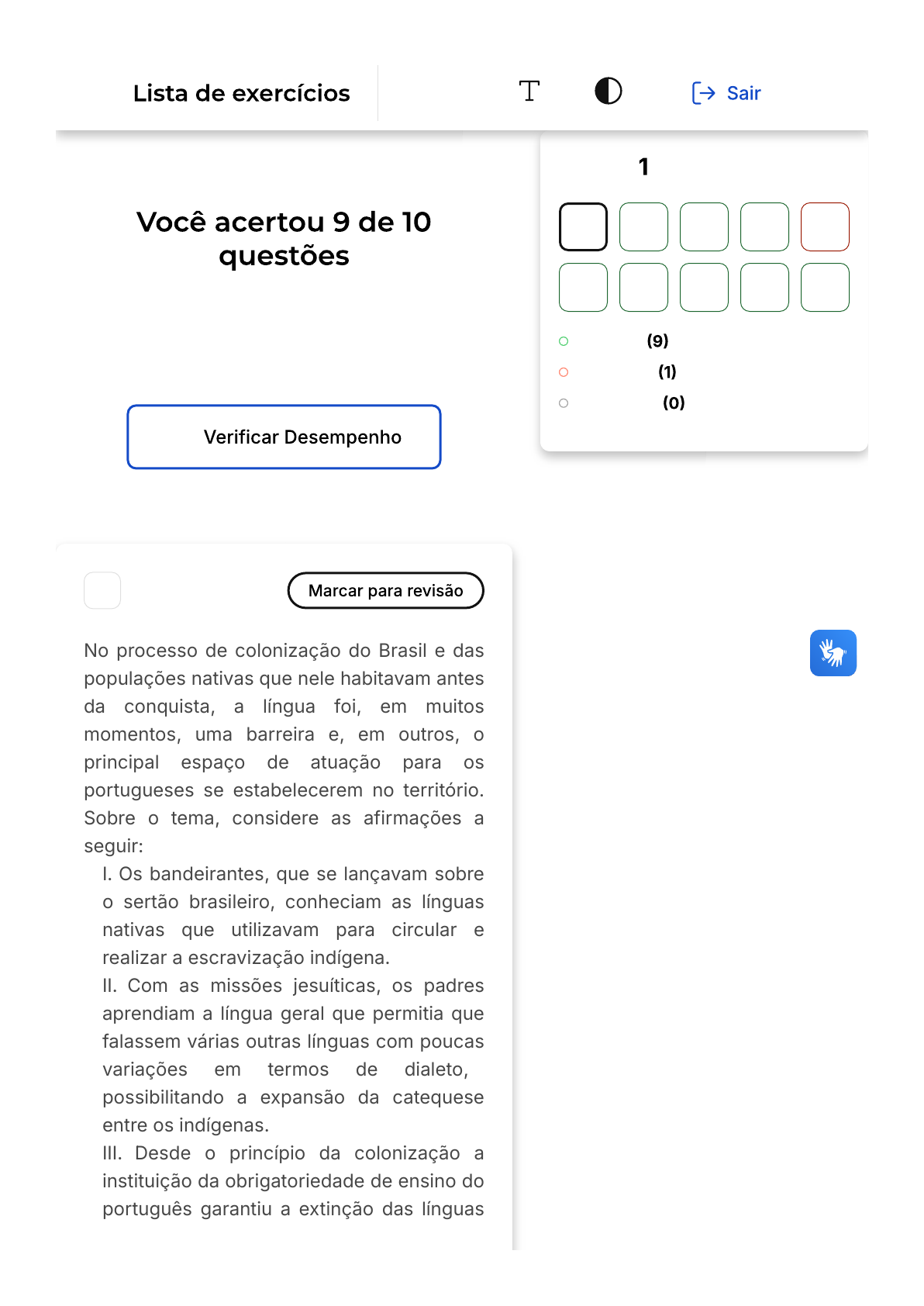 Verifique o seu desempenho e continue treinando! Você pode refazer o exercício quantas vezes quiser. 1 No processo de colonização do Brasil e das populações nativas que nele habitavam antes da conquista, a língua foi, em muitos momentos, uma barreira e, em outros, o principal espaço de atuação para os portugueses se estabelecerem no território. Sobre o tema, considere as afirmações a seguir: I��Os bandeirantes, que se lançavam sobre o sertão brasileiro, conheciam as línguas nativas que utilizavam para circular e realizar a escravização indígena. II� �Com as missões jesuíticas, os padres aprendiam a língua geral que permitia que falassem várias outras línguas com poucas variações em termos de dialeto, possibilitando a expansão da catequese entre os indígenas. III� �Desde o princípio da colonização a instituição da obrigatoriedade de ensino do português garantiu a extinção das línguas Questão de 10 Corretas Incorretas Em branco 1 2 3 4 5 6 7 8 9 10 Negros D… Firefox https://estacio.saladeavaliacoes.com.br/exercicio/68f4ea6... 1 of 15 19/10/2025, 10:17 A B C D E nativas. Qual(is) afirmativa(s) está(ão) correta(s)? Somente I está correta. Somente II está correta. Somente III está correta. Somente I e II estão corretas. Somente II e III estão corretas. Parabéns, você selecionou a alternativa correta. Confira o gabarito comentado! Apesar do esforço dos religiosos que se envolveram em missões nas florestas e nos aldeamentos próximos às cidades na América Portuguesa, as línguas nativas e suas variantes executaram importante função no processo colonizador do Brasil. Juntamente a esse processo institucional de catequese em língua geral tupi - a mais falada na costa, mesmo que considerando suas variações dialetais - é possível observar que as incursões de sertanistas impactavam na aprendizagem desses idiomas nativos ao passo que permitiam maior mobilidade aos bandeirantes no Firefox https://estacio.saladeavaliacoes.com.br/exercicio/68f4ea6... 2 of 15 19/10/2025, 10:17 A B C D E território. 2 A História pode ser entendida sob diversos aspectos, mas para tanto, é preciso ter uma posição crítica. Nesse sentido, a História deve ser compreendida como: Um discurso sobre a verdade do tempo. Como a mestra da vida. Como uma apresentação do passado. Como um conjunto de memórias. Como um discurso relacionado ao tempo. Parabéns, você selecionou a alternativa correta. Confira o gabarito comentado! A História é uma disciplina que busca estudar as relações do homem com o tempo. A alternativa correta é a letra E, que afirma que a História é um "discurso Firefox https://estacio.saladeavaliacoes.com.br/exercicio/68f4ea6... 3 of 15 19/10/2025, 10:17 A B C D E relacionado ao tempo". Isso significa que a História não é apenas uma apresentação do passado ou um conjunto de memórias, mas sim uma análise crítica e reflexiva sobre como o homem se relaciona com o tempo e como isso influencia a sociedade e a cultura. A ideia de que o tempo é o "mestre da vida" é uma concepção eurocêntrica que simplifica a complexidade da relação entre homem e tempo, conforme a filosofia da história atualmente entende. 3 A antropologia e a arqueologia têm estimulado novos olhares para a historicidade das populações nativas. Em destaque, a arqueologia tem produzido escavações que têm atuado nas: Tradições de moradia. Tradições linguísticas. Tradições de cerâmicas. Tradições etnográficas. Tradições de assentamento. Firefox https://estacio.saladeavaliacoes.com.br/exercicio/68f4ea6... 4 of 15 19/10/2025, 10:17 Parabéns, você selecionou a alternativa correta. Confira o gabarito comentado! A arqueologia tem desempenhado um papel crucial na exploração e compreensão das tradições de cerâmica, especialmente as de Aratu, originárias do Nordeste brasileiro, e Uru, da região Amazônica. Essas escavações e estudos são de grande importância para a datação e o mapeamento de deslocamentos das populações nativas. Através dessas descobertas, é possível traçar um panorama mais preciso da história e cultura desses povos, contribuindo para um maior entendimento da nossa própria história enquanto nação. 4 As aldeias têm sido um lugar comum no debate sobre os indígenas. Entretanto novas considerações têm lançado luz sobre os assentamentos das populações nativas. Avalie as assertivas, verificando V para verdadeira F para falsa. ( ) Todas as aldeias eram circulares. ( ) As habitações nas aldeias se davam em formato de Oca. ( ) É verificado que as diferentes populações nativas possuíam assentamento conforme uma aldeia. ( ) A aldeia é um modelo de assentamento e habitação, dentre outras possibilidades, Firefox https://estacio.saladeavaliacoes.com.br/exercicio/68f4ea6... 5 of 15 19/10/2025, 10:17 A B C D E tendo em vista a heterogeneidade dos povos originários. ( ) Os povoamentos anelares estão identificados com as regiões do Alto Xingu. Marque a alternativa correta: V� V� F� F �F F� V� F� V� V F� F� V� F�V F� F� F� V� V V� F� V� F� V Parabéns, você selecionou a alternativa correta. Confira o gabarito comentado! As formas de assentamentos das populações nativas são marcadas pela heterogeneidade. A aldeia é o lugar comum dos povos nativos, além disso é costumeiramente pensada em formato anelar. Entretanto as disposições anelares das aldeias são identificadas na região do Alto Xingu, e há indícios de outros tipos de habitação, como fortificações. É provável que a disposição anelar tenha se expandido Firefox https://estacio.saladeavaliacoes.com.br/exercicio/68f4ea6... 6 of 15 19/10/2025, 10:17 A B C D E com o passar do tempo e com os deslocamentos dos grupos nativos. 5 Os discursos religiosos tiveram uma tônica marcante do olhar europeu a respeito dos povos indígenas. Os jesuítas, nesse aspecto, tiveram importância na medida em que repr