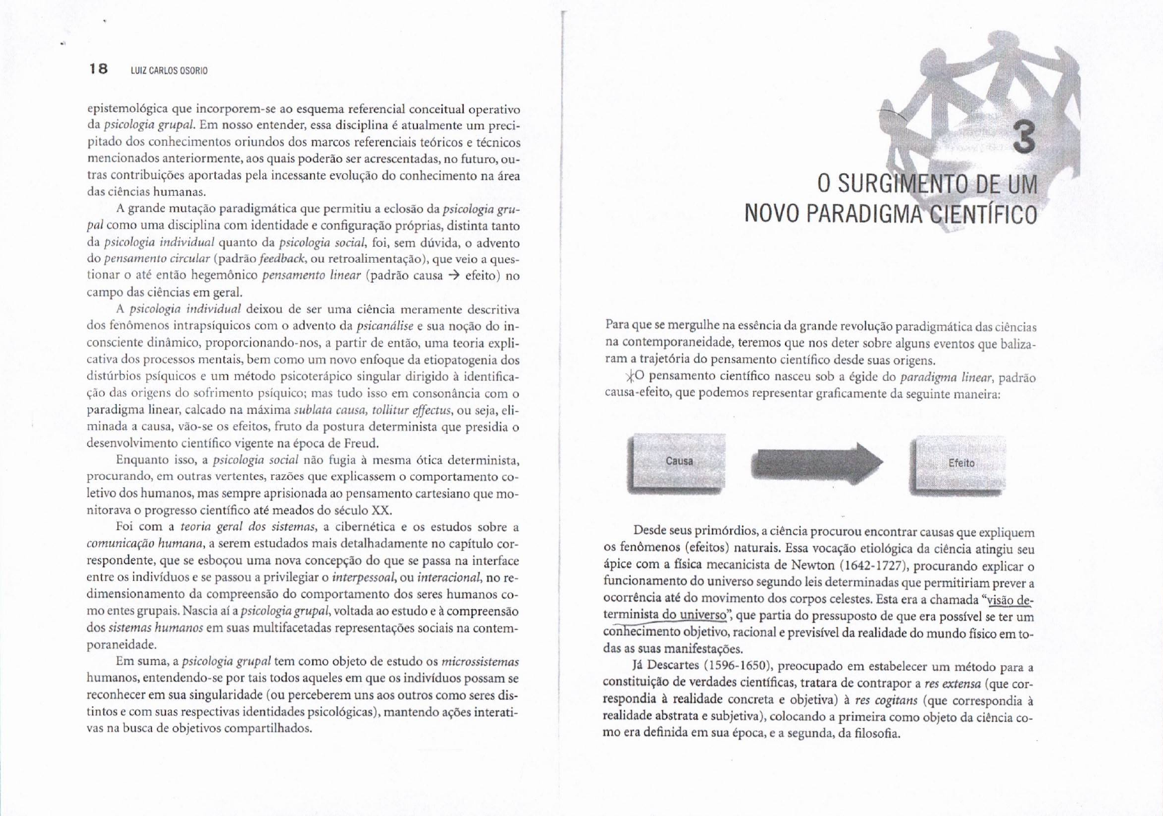 18 LUIZ CARLOS OSORIO epistemológica que incorporem-se ao esquema referencial conceitual operativo da psicologia grupal. Em nosso entender, essa disciplina é atualmente um preci- pitado dos conhecimentos oriundos dos marcos referenciais teóricos e técnicos 3 mencionados anteriormente, aos quais poderão ser acrescentadas, no futuro, ou- tras contribuições aportadas pela incessante evolução do conhecimento na área das ciências humanas. 0 SURGIMENTO DE UM A grande mutação paradigmática que permitiu a eclosão da psicologia gru- NOVO PARADIGMA CIENTÍFICO pal como uma disciplina com identidade e configuração próprias, distinta tanto da psicologia individual quanto da psicologia social, foi, sem dúvida, o advento do pensamento circular (padrão feedback, ou retroalimentação), que veio a ques- tionar o até então hegemônico pensamento linear (padrão causa efeito) no campo das ciências em geral. A psicologia individual deixou de ser uma ciência meramente descritiva dos fenômenos intrapsíquicos com o advento da psicanálise e sua noção do in- Para que se mergulhe na essência da grande revolução paradigmática das ciências consciente dinâmico, proporcionando-nos, a partir de então, uma teoria expli- na contemporaneidade, teremos que nos deter sobre alguns eventos que baliza- cativa dos processos mentais, bem como um novo enfoque da etiopatogenia dos ram a trajetória do pensamento científico desde suas origens. distúrbios psíquicos e um método psicoterápico singular dirigido à identifica- pensamento científico nasceu sob a égide do paradigma linear, padrão ção das origens do sofrimento psíquico; mas tudo isso em consonância com causa-efeito, que podemos representar graficamente da seguinte maneira: paradigma linear, calcado na máxima sublata causa, tollitur effectus, ou seja, eli- minada a causa, vão-se os efeitos, fruto da postura determinista que presidia desenvolvimento científico vigente na época de Freud. Enquanto isso, a psicologia social não fugia à mesma ótica determinista, Causa Efeito procurando, em outras vertentes, razões que explicassem o comportamento co- letivo dos humanos, mas sempre aprisionada ao pensamento cartesiano que mo- nitorava o progresso científico até meados do século XX. Foi com a teoria geral dos sistemas, a cibernética e os estudos sobre a Desde seus primórdios, a ciência procurou encontrar causas que expliquem comunicação humana, a serem estudados mais detalhadamente no capítulo cor- fenômenos (efeitos) naturais. Essa vocação etiológica da ciência atingiu seu respondente, que se esboçou uma nova concepção do que se passa na interface ápice com a física mecanicista de Newton (1642-1727), procurando explicar o entre os indivíduos e se passou a privilegiar o interpessoal, ou interacional, no re- funcionamento do universo segundo leis determinadas que permitiriam prever a dimensionamento da compreensão do comportamento dos seres humanos co- ocorrência até do movimento dos corpos celestes. Esta era a chamada "visão de- mo entes grupais. Nascia aí a psicologia grupal, voltada ao estudo e à compreensão terminista do universo", que partia do pressuposto de que era possível se ter um dos sistemas humanos em suas multifacetadas representações sociais na contem- conhecimento objetivo, racional e previsível da realidade do mundo físico em to- poraneidade. das as suas manifestações. Em suma, a psicologia grupal tem como objeto de estudo os microssistemas Já Descartes (1596-1650), preocupado em estabelecer um método para a humanos, entendendo-se por tais todos aqueles em que os indivíduos possam se constituição de verdades científicas, tratara de contrapor a res extensa (que cor- reconhecer em sua singularidade (ou perceberem uns aos outros como seres dis- respondia à realidade concreta e objetiva) à res cogitans (que correspondia à tintos e com suas respectivas identidades psicológicas), mantendo ações interati- realidade abstrata e subjetiva), colocando a primeira como objeto da ciência co- vas na busca de objetivos compartilhados. mo era definida em sua época, e a segunda, da filosofia.20 LUIZ CARLOS OSORIO COMO TRABALHAR COM SISTEMAS HUMANOS 21 primeiro grande passo para o advento da revolução paradigmática das Enquanto Einstein revolucionava a física clássica, o campo emergente da ciências em direção ao pensamento relacional-sistêmico foi dado por Darwin microfísica, a partir da teoria quântica, ia semeando noções que apontavam pa- (1809-1882), ao elaborar sua teoria evolucionista, propondo a ideia de que as es- ra a grande mudança paradigmática em perspectiva no campo das ciências em pécies sobrevivem à medida que melhor se adaptam ao meio ambiente, ou seja, geral. admitindo implicitamente que é dos vetores da interação do indivíduo com o Assim, Niels Bohr (1885-1962), físico dinamarquês, propôs o princípio da meio ambiente que resulta a evolução das espécies. Mas, até então, a ótica darwi- complementaridade, que diz que a descrição completa de um fenômeno obser- niana era a do paradigma linear, padrão causa (meio ambiente) efeito (adapta- vado requer o conhecimento completo de duas qualidades complementares, co- ção ou sobrevivência das espécies). mo momento e posição, por exemplo. Em cima dessa observação, e como co- A discussão estabelecida entre criacionistas (partidários da ideia de que o rolário dela, Werner Heisenberg estabeleceu, em 1927, o princípio da incerteza, universo era fruto de uma única vontade divina, a de seu criador, Deus) e os afirmando ser impossível determinar simultaneamente a posição e a velocida- evolucionistas (que se apoiavam nas teorias de Darwin) pontuou a discrimina- de de uma partícula com precisão absoluta, pois quanto mais precisa é uma de- ção gradativa entre fé e razão no âmbito científico. E esse confronto também las, mais incerta se torna a outra, o que evidencia que, no c