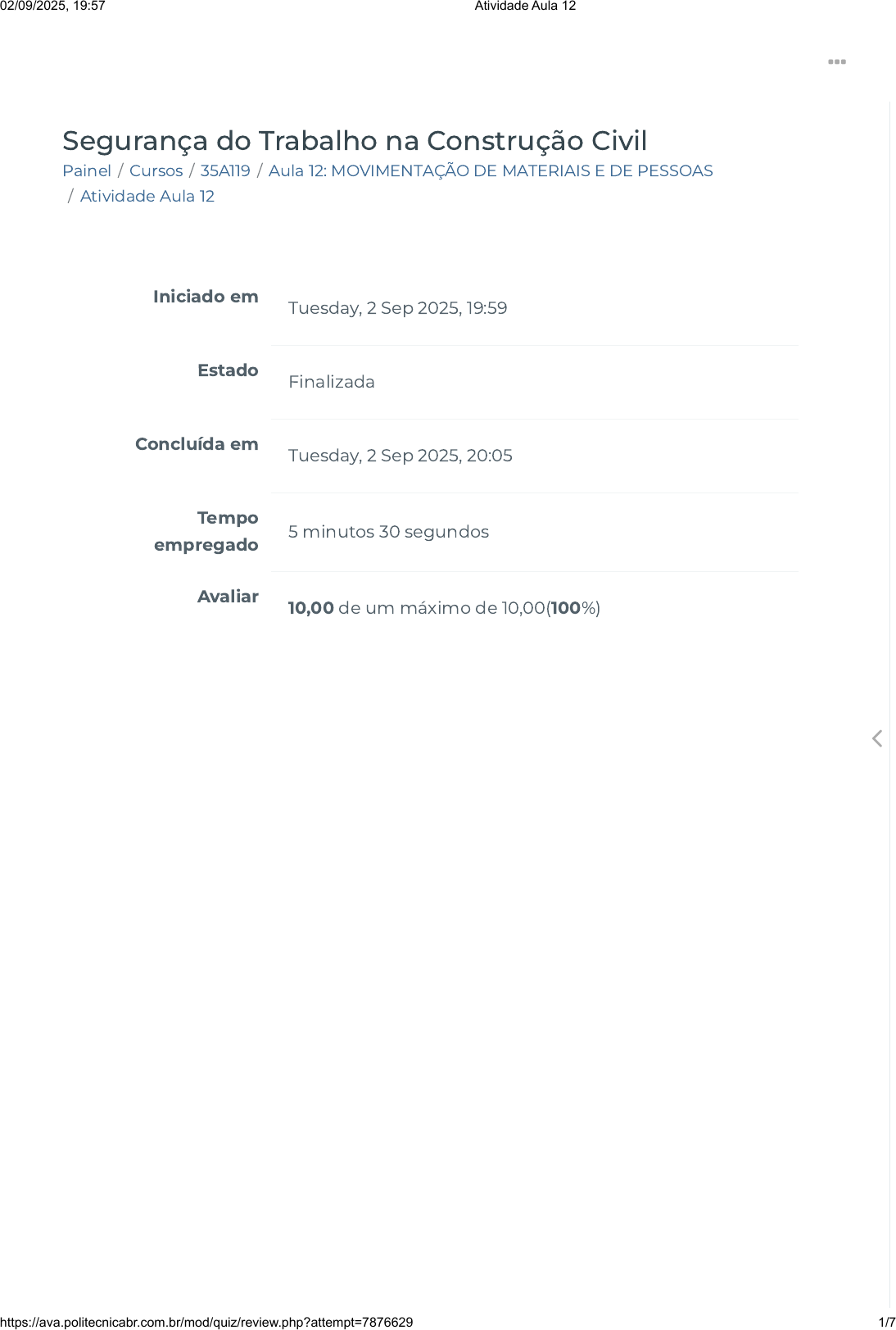 Painel / Cursos / 35A119 / Aula 12: MOVIMENTAÇÃO DE MATERIAIS E DE PESSOAS / Atividade Aula 12 Segurança do Trabalho na Construção Civil Iniciado em Tuesday, 2 Sep 2025, 19:59 Estado Finalizada Concluída em Tuesday, 2 Sep 2025, 20:05 Tempo empregado 5 minutos 30 segundos Avaliar 10,00 de um máximo de 10,00(100%) 02/09/2025, 19:57 Atividade Aula 12 https://ava.politecnicabr.com.br/mod/quiz/review.php?attempt=7876629 1/7 https://ava.politecnicabr.com.br/my/ https://ava.politecnicabr.com.br/my/ https://ava.politecnicabr.com.br/course/index.php https://ava.politecnicabr.com.br/course/view.php?id=1041 https://ava.politecnicabr.com.br/course/view.php?id=1041#section-13 https://ava.politecnicabr.com.br/mod/quiz/view.php?id=32307 https://ava.politecnicabr.com.br/ Questão 1 Correto Atingiu 2,00 de 2,00 No tocante ao local de implantação, quando aplicável, marque a alternativa incorreta. Escolha uma opção: a. Atenção especial deverá ser dedicada à preparação das fundações (base em que será assente a grua), as condições de acesso para caminhões de cargas a serem deslocadas pelas gruas etc. b. Ater cuidados para assegurar os envoltórios de segurança (áreas de projeção da operação do equipamento) para que não haja interferências com as próprias obras em execução (ou montagem) e as estruturas circunvizinhas em geral (outras gruas e edificações, p. ex.). c. Evitar zonas de fragilidade do terreno (taludes, aterros e desterros ou sobre redes e canalizações). d. Assegurar o devido afastamento das redes elétricas. e. Todas as alternativas estão corretas. 02/09/2025, 19:57 Atividade Aula 12 https://ava.politecnicabr.com.br/mod/quiz/review.php?attempt=7876629 2/7 https://ava.politecnicabr.com.br/ Questão 2 Correto Atingiu 2,00 de 2,00 Dentre os erros de operação mais comuns em procedimentos com operação em grua, marque a alternativa correta. Escolha uma opção: a. balançar a carga suspensa para depositá-la além do alcance de atuação da grua. b. transportar cargas com içamento inferior a 2 metros de altura. c. ultrapassar a velocidade de operação recomendada, para içamento e/ou deslocamento horizontal da carga. d. causar rotação da carga desde o solo por cabo-guia (intervenção auxiliar). e. todas as alternativas. 02/09/2025, 19:57 Atividade Aula 12 https://ava.politecnicabr.com.br/mod/quiz/review.php?attempt=7876629 3/7 https://ava.politecnicabr.com.br/ Questão 3 Correto Atingiu 2,00 de 2,00 Assinale (V) Verdadeiro ou (F) Falso. ( ) Para a instalação de uma grua, se faz necessário conhecer os dois requisitos de sua utilização: o alcance da lança ou raio de atuação e a carga máxima (na posição extrema da lança).TEM MAIS ( ) Importante ressaltar que a PT tem uma vida definida. Ou seja, não pode ser emitida e transcorrer tempo significativo entre a sua emissão e a realização da operação nela orientada, vez que as condições, para as quais foi autorizada e prescrita, podem se alterar de tal maneira que não faça qualquer sentido realizá-la de acordo com aquela. ( ) Ainda que a equipe anseie pela execução da tarefa e concorde com a emissão da permissão, mesmo assim, baseando seu julgamento em sua experiência e prática, o autorizador pode negar-se a autorizá-la e emiti-la, já que, ao autorizar a realização da tarefa, não há a “transferência” da segurança da mesma aos executantes e repousa sobre ele a autoridade maior do evento. ( ) As gruas (ou elevadores de torre) são equipamentos constituídos por uma torre ou mastro, lança (e contralança) e contrapeso (e lastro). Seu funcionamento é bastante simples, comportando-se como uma alavanca de 1o grau (interfixa), mantendo-se a equação entre a carga atuante sobre a lança (braço maior da alavanca), em função da distância em que essa se encontra aplicada em relação ao ponto fixo. Escolha uma opção: a. F, F, V, V b. F, V, V, V c. V, V, V, V 02/09/2025, 19:57 Atividade Aula 12 https://ava.politecnicabr.com.br/mod/quiz/review.php?attempt=7876629 4/7 https://ava.politecnicabr.com.br/ Questão 4 Correto Atingiu 2,00 de 2,00 Assinale (V) Verdadeiro ou (F) Falso. ( ) Estropos, eslingas ou laços de cabos de aço são elementos auxiliares utilizados para a elevação e movimentação de cargas, geralmente fixados a essas por olhais. Escolha uma opção: d. F, F, F, F Verdadeiro Falso 02/09/2025, 19:57 Atividade Aula 12 https://ava.politecnicabr.com.br/mod/quiz/review.php?attempt=7876629 5/7 https://ava.politecnicabr.com.br/ Questão 5 Correto Atingiu 2,00 de 2,00 Assinale (V) Verdadeiro e (F) Falso. ( ) grua fixa: caracteriza-se por ter a base da torre lastreada em um bloco de concreto ao qual está fixada. Sua ascensão e ancoragem são feitas de acordo com a necessidade da obra, sendo que a ancoragem e a altura livre serão limitadas pela capacidade do equipamento, conforme estabelecido por cada fabricante. ( ) grua móvel: normalmente instalada dentro do poço do elevador e fixada entre lajes por meio de gravatas metálicas. ( ) grua ascencional: promove a sua automontagem e posicionamento, em único movimento. Bastante útil quando se dispõe de reduzido prazo para instalação e para seu uso. Sendo, em geral, menor que as demais, demanda menor área para a operação, o que também contribui para minimizar o tempo de montagem e desmontagem da estrutura. ( ) grua automotante: montada sobre base metálica que suporta o lastro e rodantes de translação instalados sobre trilhos; permite que todo o conjunto disponha de mobilidade horizontal. Escolha uma opção: a. V, V, V, V b. V, V, F, V c. V, F, F, F d. F, F, F, F 02/09/2025, 19:57 Atividade Aula 12 https://ava.politecnicabr.com.br/mod/quiz/review.php?attempt=7876629 6/7 https://ava.politecnicabr.com.br/ © 2022 - Escola Politécnica Brasileira Entre em Contato https://www.politecnicabr.com.br 0800 084 2627 0800 084 2627 Links Úteis Dicas da nossa Diretora Acadêmica Planner de Estudos Declaração de Matrícu