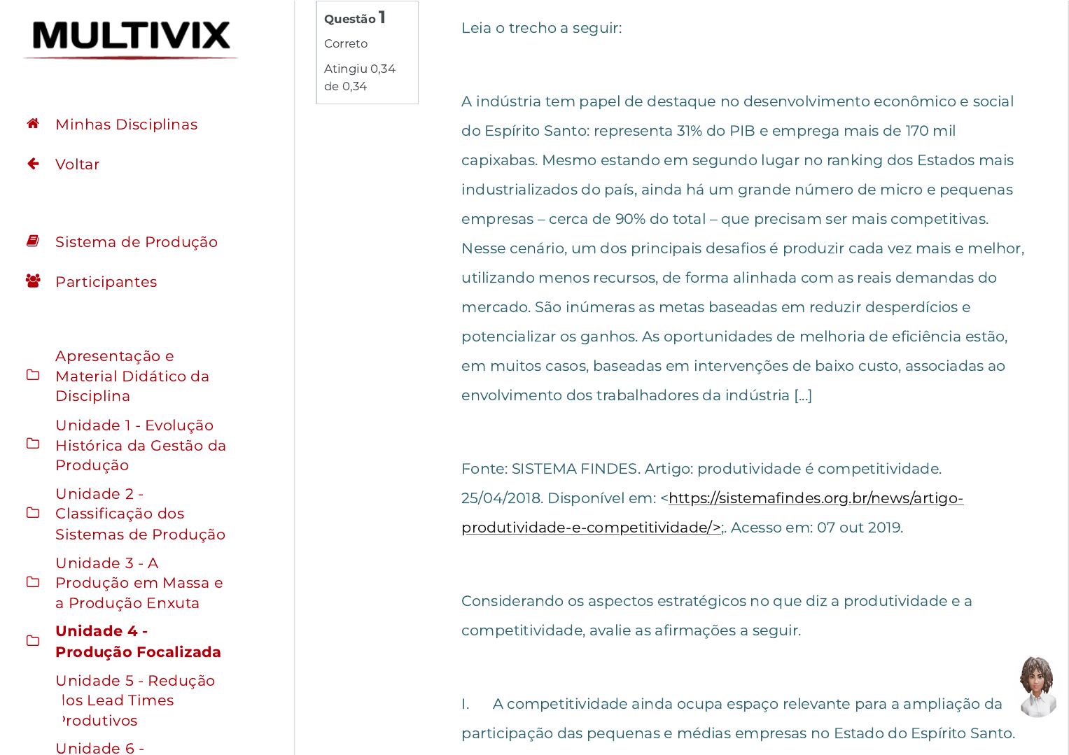 Questão 1 Correto Atingiu 0,34 de 0,34 Leia o trecho a seguir: A indústria tem papel de destaque no desenvolvimento econômico e social do Espírito Santo: representa 31% do PIB e emprega mais de 170 mil capixabas. Mesmo estando em segundo lugar no ranking dos Estados mais industrializados do país, ainda há um grande número de micro e pequenas empresas – cerca de 90% do total – que precisam ser mais competitivas. Nesse cenário, um dos principais desafios é produzir cada vez mais e melhor, utilizando menos recursos, de forma alinhada com as reais demandas do mercado. São inúmeras as metas baseadas em reduzir desperdícios e potencializar os ganhos. As oportunidades de melhoria de eficiência estão, em muitos casos, baseadas em intervenções de baixo custo, associadas ao envolvimento dos trabalhadores da indústria [...] Fonte: SISTEMA FINDES. Artigo: produtividade é competitividade. 25/04/2018. Disponível em: ;. Acesso em: 07 out 2019. Considerando os aspectos estratégicos no que diz a produtividade e a competitividade, avalie as afirmações a seguir. I. A competitividade ainda ocupa espaço relevante para a ampliação da participação das pequenas e médias empresas no Estado do Espírito Santo. Minhas Disciplinas Voltar Sistema de Produção Participantes Apresentação e Material Didático da Disciplina Unidade 1 - Evolução Histórica da Gestão da Produção Unidade 2 - Classificação dos Sistemas de Produção Unidade 3 - A Produção em Massa e a Produção Enxuta Unidade 4 - Produção Focalizada Unidade 5 - Redução dos Lead Times Produtivos Unidade 6 - https://sistemafindes.org.br/news/artigo-produtividade-e-competitividade/%3E https://sistemafindes.org.br/news/artigo-produtividade-e-competitividade/%3E https://avap.multivix.edu.br/my/ https://avap.multivix.edu.br/course/view.php?id=36067 https://avap.multivix.edu.br/user/index.php?id=36067 https://avap.multivix.edu.br/course/view.php?id=36067§ion=1 https://avap.multivix.edu.br/course/view.php?id=36067§ion=2 https://avap.multivix.edu.br/course/view.php?id=36067§ion=3 https://avap.multivix.edu.br/course/view.php?id=36067§ion=4 https://avap.multivix.edu.br/course/view.php?id=36067§ion=5 https://avap.multivix.edu.br/course/view.php?id=36067§ion=6 https://avap.multivix.edu.br/course/view.php?id=36067§ion=7 https://avap.multivix.edu.br/ https://avap.multivix.edu.br/ https://avap.multivix.edu.br/ https://avap.multivix.edu.br/ https://avap.multivix.edu.br/ https://avap.multivix.edu.br/ https://avap.multivix.edu.br/ https://avap.multivix.edu.br/ https://avap.multivix.edu.br/ https://avap.multivix.edu.br/ https://avap.multivix.edu.br/ https://avap.multivix.edu.br/ II. Produzir mais e com qualidade evita o atendimento da real demanda do mercado. III. Aumentar a melhoria reduzindo potenciais ganhos é uma meta baseada na intervenção de baixo custo no efeito top-down. É correto o que se afirma em Escolha uma opção: a. II e III, apenas. b. I, apenas. c. II, apenas. d. I e II, apenas. e. III, apenas. Minhas Disciplinas Voltar Sistema de Produção Participantes Apresentação e Material Didático da Disciplina Unidade 1 - Evolução Histórica da Gestão da Produção Unidade 2 - Classificação dos Sistemas de Produção Unidade 3 - A Produção em Massa e a Produção Enxuta Unidade 4 - Produção Focalizada Unidade 5 - Redução dos Lead Times Produtivos Unidade 6 - https://avap.multivix.edu.br/my/ https://avap.multivix.edu.br/course/view.php?id=36067 https://avap.multivix.edu.br/user/index.php?id=36067 https://avap.multivix.edu.br/course/view.php?id=36067§ion=1 https://avap.multivix.edu.br/course/view.php?id=36067§ion=2 https://avap.multivix.edu.br/course/view.php?id=36067§ion=3 https://avap.multivix.edu.br/course/view.php?id=36067§ion=4 https://avap.multivix.edu.br/course/view.php?id=36067§ion=5 https://avap.multivix.edu.br/course/view.php?id=36067§ion=6 https://avap.multivix.edu.br/course/view.php?id=36067§ion=7 https://avap.multivix.edu.br/ https://avap.multivix.edu.br/ https://avap.multivix.edu.br/ https://avap.multivix.edu.br/ https://avap.multivix.edu.br/ https://avap.multivix.edu.br/ https://avap.multivix.edu.br/ https://avap.multivix.edu.br/ https://avap.multivix.edu.br/ https://avap.multivix.edu.br/ https://avap.multivix.edu.br/ https://avap.multivix.edu.br/ Questão 2 Correto Atingiu 0,34 de 0,34 O foco da produção enxuta é alcançar um fluxo de materiais, informações ou clientes que ofereça exatamente o que os clientes desejam, em quantidades exatas, exatamente quando for necessário, onde for necessário e com o menor custo possível. Esse é um conceito muito semelhante ao just-in-time, ao Sistema Toyota de Produção e a “sincronização enxuta”. Disponível em: SLACK, N.; JONES, A. B.; JOHNSTON, R. Administração da Produção. 8. ed. São Paulo: Atlas, 2018 (Adaptado) Considerando o conceito de produção enxuta, avalie as afirmações a seguir. I. É uma filosofia de trabalho de como conduzir a produção. II. Visa atender a demanda, com a qualidade do produto em inspeção. III. É um conjunto de ferramentas que melhora o desempenho das operações. IV. É um conjunto de procedimentos e método de planejar e controlar a produção. É correto apenas o que se afirma em Escolha uma opção: a. I, III e IV. Minhas Disciplinas Voltar Sistema de Produção Participantes Apresentação e Material Didático da Disciplina Unidade 1 - Evolução Histórica da Gestão da Produção Unidade 2 - Classificação dos Sistemas de Produção Unidade 3 - A Produção em Massa e a Produção Enxuta Unidade 4 - Produção Focalizada Unidade 5 - Redução dos Lead Times Produtivos Unidade 6 - https://avap.multivix.edu.br/my/ https://avap.multivix.edu.br/course/view.php?id=36067 https://avap.multivix.edu.br/user/index.php?id=36067 https://avap.multivix.edu.br/course/view.php?id=36067§ion=1 https://avap.multivix.edu.br/course/view.php?id=36067§ion=2 https://avap.multivix.edu.br/course/vi