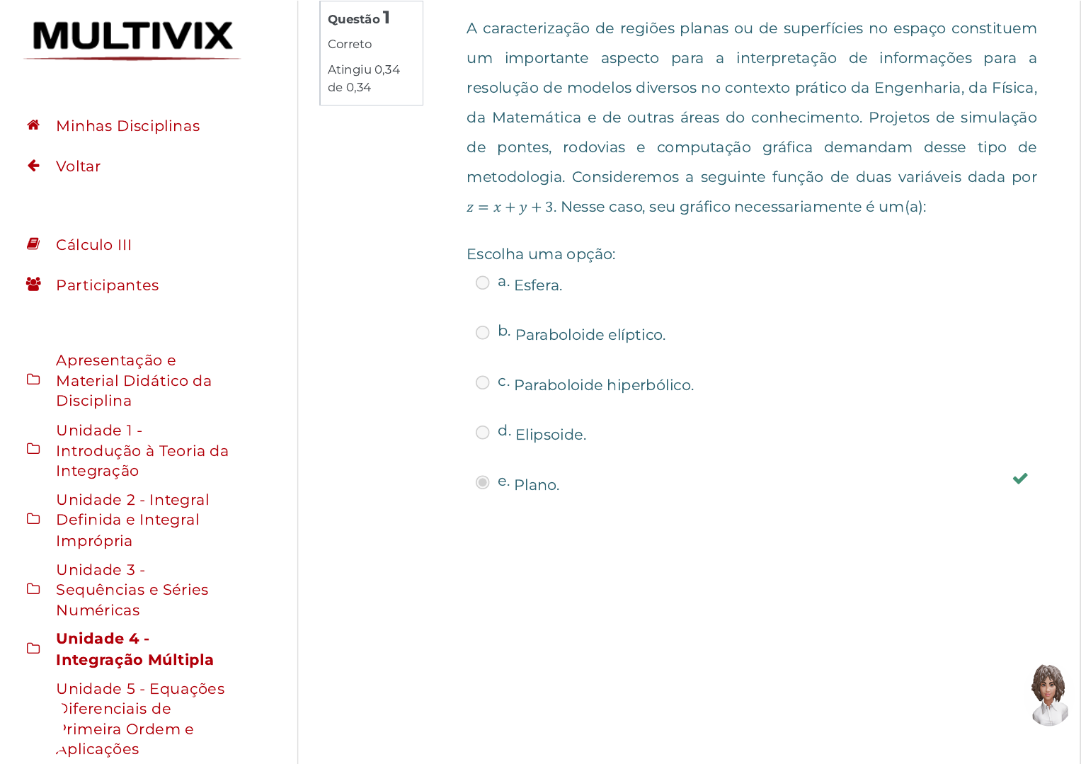 Questão 1 Correto Atingiu 0,34 de 0,34 A caracterização de regiões planas ou de superfícies no espaço constituem um importante aspecto para a interpretação de informações para a resolução de modelos diversos no contexto prático da Engenharia, da Física, da Matemática e de outras áreas do conhecimento. Projetos de simulação de pontes, rodovias e computação gráfica demandam desse tipo de metodologia. Consideremos a seguinte função de duas variáveis dada por 𝑧 = 𝑥 + 𝑦 + 3. Nesse caso, seu gráfico necessariamente é um(a): Escolha uma opção: a. Esfera. b. Paraboloide elíptico. c. Paraboloide hiperbólico. d. Elipsoide. e. Plano. Minhas Disciplinas Voltar Cálculo III Participantes Apresentação e Material Didático da Disciplina Unidade 1 - Introdução à Teoria da Integração Unidade 2 - Integral Definida e Integral Imprópria Unidade 3 - Sequências e Séries Numéricas Unidade 4 - Integração Múltipla Unidade 5 - Equações Diferenciais de Primeira Ordem e Aplicações https://avap.multivix.edu.br/my/ https://avap.multivix.edu.br/course/view.php?id=36085 https://avap.multivix.edu.br/user/index.php?id=36085 https://avap.multivix.edu.br/course/view.php?id=36085§ion=1 https://avap.multivix.edu.br/course/view.php?id=36085§ion=2 https://avap.multivix.edu.br/course/view.php?id=36085§ion=3 https://avap.multivix.edu.br/course/view.php?id=36085§ion=4 https://avap.multivix.edu.br/course/view.php?id=36085§ion=5 https://avap.multivix.edu.br/course/view.php?id=36085§ion=6 https://avap.multivix.edu.br/ https://avap.multivix.edu.br/ https://avap.multivix.edu.br/ https://avap.multivix.edu.br/ https://avap.multivix.edu.br/ https://avap.multivix.edu.br/ https://avap.multivix.edu.br/ Questão 2 Correto Atingiu 0,34 de 0,34 Geometricamente falando podemos entender que uma superfície matemática nada mais é do que a medida que circunscreve a extensão e comprimento dos objetos, ou ainda, a extensão das faces de um objeto. São exemplos de superfícies, paraboloide, elipsoide e esfera. Neste sentido, uma condição necessária para que uma superfície S qualquer do espaço tridimensional represente o gráfico de uma função é: Escolha uma opção: a. Que qualquer reta perpendicular ao plano xOy corte S em dois pontos. b. Que qualquer reta perpendicular ao plano xOy corte S em mais de dois pontos. c. Que qualquer reta perpendicular ao plano xOy corte S em quatro pontos. d. Que qualquer reta perpendicular ao plano xOy corte S em três pontos. e. Que qualquer reta perpendicular ao plano xOy corte S em apenas um ponto. Minhas Disciplinas Voltar Cálculo III Participantes Apresentação e Material Didático da Disciplina Unidade 1 - Introdução à Teoria da Integração Unidade 2 - Integral Definida e Integral Imprópria Unidade 3 - Sequências e Séries Numéricas Unidade 4 - Integração Múltipla Unidade 5 - Equações Diferenciais de Primeira Ordem e Aplicações https://avap.multivix.edu.br/my/ https://avap.multivix.edu.br/course/view.php?id=36085 https://avap.multivix.edu.br/user/index.php?id=36085 https://avap.multivix.edu.br/course/view.php?id=36085§ion=1 https://avap.multivix.edu.br/course/view.php?id=36085§ion=2 https://avap.multivix.edu.br/course/view.php?id=36085§ion=3 https://avap.multivix.edu.br/course/view.php?id=36085§ion=4 https://avap.multivix.edu.br/course/view.php?id=36085§ion=5 https://avap.multivix.edu.br/course/view.php?id=36085§ion=6 https://avap.multivix.edu.br/ https://avap.multivix.edu.br/ https://avap.multivix.edu.br/ https://avap.multivix.edu.br/ https://avap.multivix.edu.br/ https://avap.multivix.edu.br/ https://avap.multivix.edu.br/ Questão 3 Correto Atingiu 0,34 de 0,34 A interpretação do conceito de derivada fundamentalmente é feita tendo como referência a ideia de taxa de variação. Problemas nas mais diversas áreas do conhecimento demandam da ideia de razão ou taxa de variação e, logicamente, necessitam do uso das derivadas ordinárias ou parciais. Nesse sentido, considerando as funções qual é a expressão para com Escolha uma opção: a. b. c. d. e. Minhas Disciplinas Voltar Cálculo III Participantes Apresentação e Material Didático da Disciplina Unidade 1 - Introdução à Teoria da Integração Unidade 2 - Integral Definida e Integral Imprópria Unidade 3 - Sequências e Séries Numéricas Unidade 4 - Integração Múltipla Unidade 5 - Equações Diferenciais de Primeira Ordem e Aplicações https://avap.multivix.edu.br/my/ https://avap.multivix.edu.br/course/view.php?id=36085 https://avap.multivix.edu.br/user/index.php?id=36085 https://avap.multivix.edu.br/course/view.php?id=36085§ion=1 https://avap.multivix.edu.br/course/view.php?id=36085§ion=2 https://avap.multivix.edu.br/course/view.php?id=36085§ion=3 https://avap.multivix.edu.br/course/view.php?id=36085§ion=4 https://avap.multivix.edu.br/course/view.php?id=36085§ion=5 https://avap.multivix.edu.br/course/view.php?id=36085§ion=6 https://avap.multivix.edu.br/ https://avap.multivix.edu.br/ https://avap.multivix.edu.br/ https://avap.multivix.edu.br/ https://avap.multivix.edu.br/ https://avap.multivix.edu.br/ https://avap.multivix.edu.br/ Questão 4 Correto Atingiu 0,34 de 0,34 A interpretação do conceito de derivada e da integral fundamentalmente é feita tendo como referência a ideia de taxa de variação. Problemas nas mais diversas áreas do conhecimento demandam da ideia de razão ou taxa de variação e, logicamente, necessitam do uso das derivadas ordinárias ou parciais, bem como da integração múltipla. Nesse contexto, qual é o valor do volume do sólido caracterizado pelo gráfico da função , inferiormente pela região R delimitada por x =0, x=2, y = 0, e lateralmente pelo cilindro vertical sendo a base o contorno de R? Escolha uma opção: a. 15/8 unidades de volume b. ½ unidades de volume c. 10 unidades de volume d. 5 unidades de volume e. 14 unidades de volume Minhas Disciplinas Voltar Cálculo III Participantes Apresentaçã