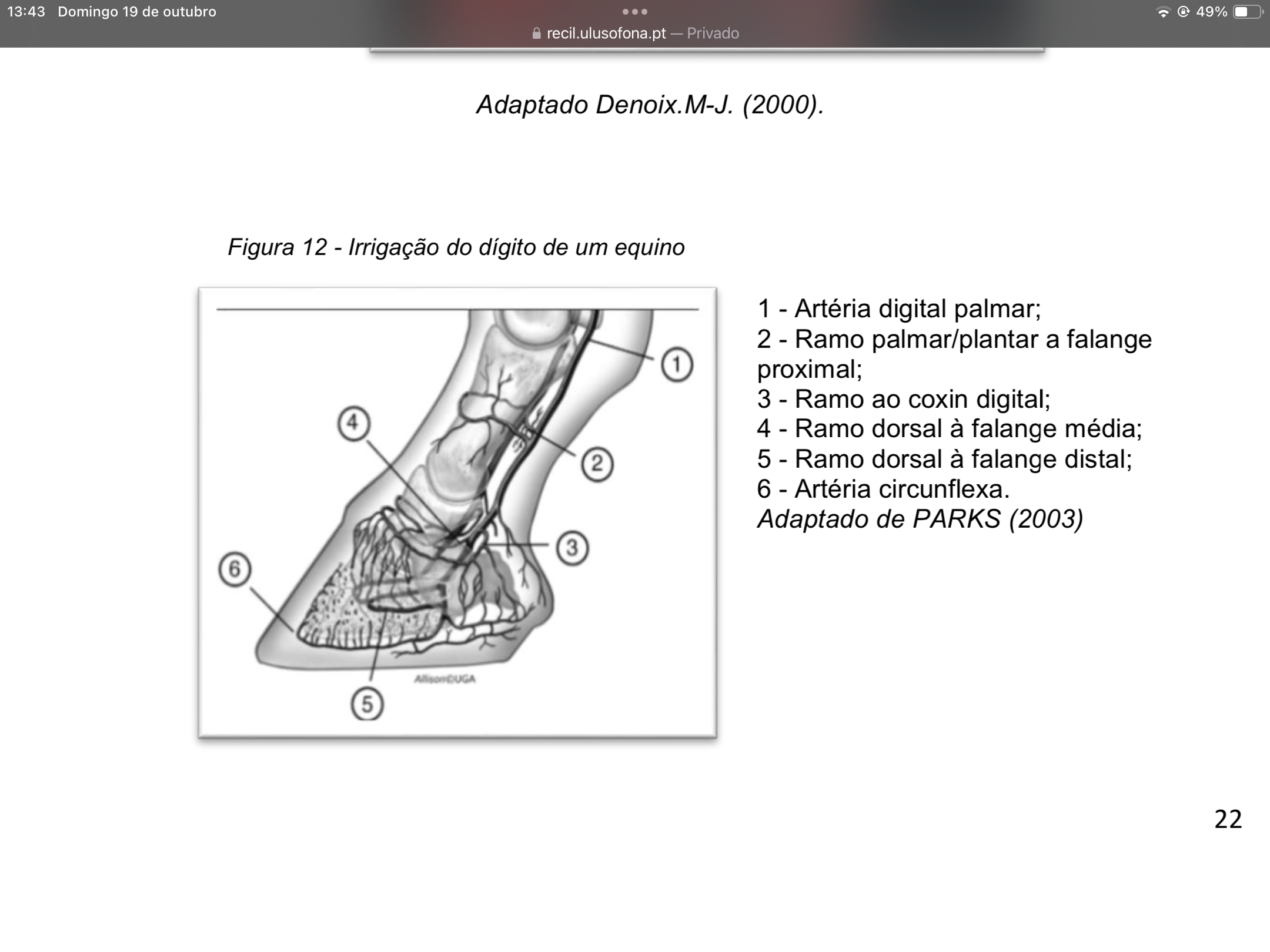 13:43 Domingo 19 de outubro 49% recil.ulusofona.pt Privado Adaptado Denoix.M-J. (2000). Figura 12 - Irrigação do dígito de um equino 1 - Artéria digital palmar; 2 - Ramo palmar/plantar a falange 1 proximal; 3 - Ramo ao coxin digital; 4 4 - Ramo dorsal à falange média; 2 5 - Ramo dorsal à falange distal; 6 - Artéria circunflexa. Adaptado de PARKS (2003) 3 6 5 22