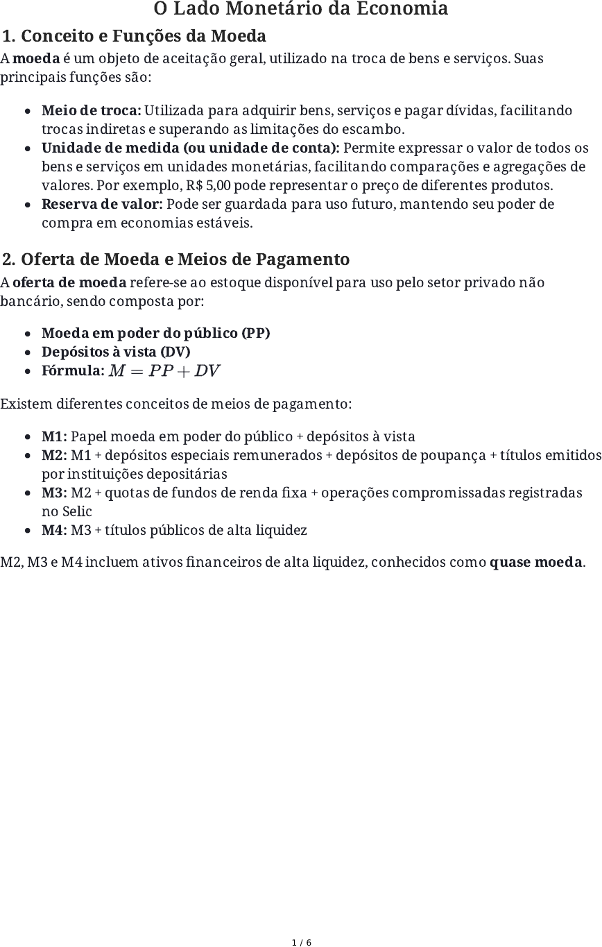 A moeda é um objeto de aceitação geral, utilizado na troca de bens e serviços. Suas principais funções são: Meio de troca: Utilizada para adquirir bens, serviços e pagar dívidas, facilitando trocas indiretas e superando as limitações do escambo. Unidade de medida (ou unidade de conta): Permite expressar o valor de todos os bens e serviços em unidades monetárias, facilitando comparações e agregações de valores. Por exemplo, R$ 5,00 pode representar o preço de diferentes produtos. Reserva de valor: Pode ser guardada para uso futuro, mantendo seu poder de compra em economias estáveis. A oferta de moeda refere-se ao estoque disponível para uso pelo setor privado não bancário, sendo composta por: Moeda em poder do público (PP) Depósitos à vista (DV) Fórmula: Existem diferentes conceitos de meios de pagamento: M1: Papel moeda em poder do público + depósitos à vista M2: M1 + depósitos especiais remunerados + depósitos de poupança + títulos emitidos por instituições depositárias M3: M2 + quotas de fundos de renda �xa + operações compromissadas registradas no Selic M4: M3 + títulos públicos de alta liquidez M2, M3 e M4 incluem ativos �nanceiros de alta liquidez, conhecidos como quase moeda. O Lado Monetário da Economia 1. Conceito e Funções da Moeda 2. Oferta de Moeda e Meios de Pagamento 1 / 6 Figura 1: Mapa-múndi formado por moedas, ilustrando a universalidade da moeda. Durante períodos de in�ação elevada, a participação de M1 diminui (desmonetização). Em períodos de in�ação baixa, a relação entre M1 e M4 aumenta (monetização). A criação ou destruição de moeda ocorre quando há alteração no saldo dos meios de pagamento M1: Criação: Exportadores trocam dólares por reais no Banco Central; empréstimos dos bancos comerciais ao setor privado. Destruição: Banco Central vende dólares aos importadores; resgate de empréstimos bancários; depósitos a longo prazo. Neutro: Depósitos à vista. O Banco Central controla a oferta de moeda utilizando instrumentos como: Emissão de moeda Reservas compulsórias: Percentual dos depósitos à vista que os bancos devem manter no Banco Central Open market: Compra e venda de títulos públicos Redescontos: Empréstimos do Banco Central aos bancos comerciais Regulamentação sobre crédito e taxa de juros Taxa Selic: Taxa básica de juros da economia O COPOM (Comitê de Política Monetária) considera fatores como in�ação, atividade econômica, cenário externo e contas públicas em suas decisões, realizando 8 reuniões anuais. 3. Criação e Destruição de Moeda 4. Política Monetária 2 / 6 Figura 2: Fatores considerados pelo COPOM em suas decisões de política monetária. Banco emissor: Monopólio da emissão de moeda. Banco dos bancos: Recebe depósitos dos bancos comerciais, realiza transferências e concede redescontos. Banco do governo: Canal para implementação da política monetária e administração dos fundos do governo. Banco depositário das reservas internacionais: Gerencia o câmbio e as reservas internacionais do país. Os bancos comerciais, mesmo sem poder de emissão, ampliam a oferta de moeda via o multiplicador monetário. Exemplo: Depósito inicial: R$ 100,00 Reserva obrigatória: 40% (R$ 40,00) Empréstimo: 60% (R$ 60,00) O processo se repete, formando uma progressão geométrica de razão 0,6. 5. Funções do Banco Central 6. Bancos Comerciais e o Multiplicador Monetário 3 / 6 Figura 3: Esquema do novo depósito, mostrando a divisão entre reservas e empréstimos. A soma dos depósitos gerados é dada por: onde é o primeiro termo e a razão da PG. No exemplo, o depósito inicial de R$ 100,00 gera R$ 250,00 em depósitos totais, multiplicando o valor inicial por 2,5. O valor do multiplicador depende da taxa de reservas dos bancos e da taxa de retenção do público, variando inversamente com ambas. Base monetária (B): Total de moeda com o público (PP) + reservas dos bancos comerciais (R) Fórmula: Multiplicador da base monetária: Taxa de retenção do público (c): Relação entre moeda com o público e depósitos à vista Taxa de reservas bancárias (r): Relação entre reservas e depósitos à vista Motivos para demanda de moeda: Transação: Relacionado à renda Precaução: Relacionado à renda Especulação: Relacionado à taxa de juros (quanto maior a taxa, menor a demanda por moeda para especulação) Clássica: Oferta de moeda é �xada institucionalmente, não afetada pela taxa de juros. 7. Base Monetária e Multiplicador 8. Demanda de Moeda 9. Equilíbrio Monetário: Visão Clássica e Keynesiana 4 / 6 Figura 4: Oferta de moeda �xa na visão clássica. Teoria Quantitativa da Moeda: , onde é a velocidade de circulação da moeda. Exemplo: Se e , então . Keynesiana: A taxa de juros resulta do equilíbrio entre oferta e demanda de moeda, a um dado nível de renda. Figura 5: Equilíbrio monetário na visão keynesiana. 5 / 6 Clássica: Aumento da oferta de moeda pode gerar in�ação se a economia estiver plenamente empregada; se houver desemprego, pode aumentar o emprego. Keynesiana: Aumento da moeda reduz a taxa de juros, estimula o investimento e aumenta a renda real, mantendo o nível de preços constante em situação de desemprego. Em depressão, a política monetária pode ser ine�caz se a taxa de juros estiver muito baixa. Política monetária: Mais rápida na implementação, mas seus efeitos sobre a atividade econômica não são imediatos. Política �scal: Mais profunda, pois altera diretamente custos e a estrutura produtiva, com impactos mais fortes sobre a distribuição de renda. 10. Efeitos da Política Monetária 11. E�cácia das Políticas Monetária e Fiscal 6 / 6