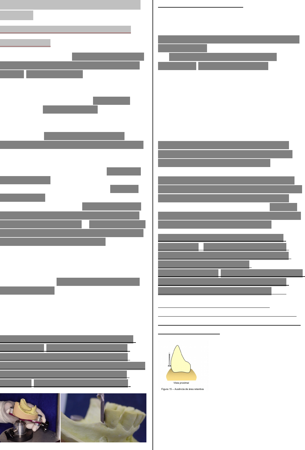 Delineador aulas práticas segundo bimestre PARALELSMO DAS FACES AXIAIS: Planos Guias Os planos guias são superfícies paralelas entre si, preparadas nas faces axiais de dentes pilares íntegros, restaurados ou com coroas protéticas. Para determinação dessas áreas paralelas, é necessária a utilização do delineador. Coloca-se a faca no mandril da haste vertical móvel e, em seguida, posiciona-se o modelo de estudo na platina, de modo que a superfície oclusal fique paralela à base horizontal do delineador. Posteriormente, o parafuso da junta universal da platina é fixado. Em seguida, deve-se posicionar a superfície lateral da faca, de modo que toque a superfície proximal dos dentes vizinhos aos espaços protéticos (Figura 10). É preciso ressaltar que a superfície lateral da faca deve tocar na região dos terços médio e oclusal/incisal. O terço cervical é sempre aliviado com o objetivo de evitar injúrias aos tecidos gengivais. Todavia, se não for obtido paralelismo das superfícies proximais, solta-se o parafuso da junta universal e se realiza movimentos na platina para anterior ou para posterior (Figura 11), até obter o paralelismo de todas as faces proximais vizinhas aos espaços protéticos. Em seguida, o parafuso da junta universal é novamente fixado. Não achei paralelelismo e agora ? Movimento a platina em sentido antero posterior na tentativa de achar o paralelismo das faces axiais do dente vizinho e fixo a platina aonde e achar mais paralelismo. ÁREAS RETENTIVAS : Durante o planejamento das próteses parciais removíveis, áreas retentivas são necessárias para que a função dos grampos de retenção seja corretamente estabelecida. A localização e o número de áreas retentivas dependem do grampo de retenção planejado, da inclinação dos dentes pilares e da quantidade de retenção exigida. Entretanto, freqüentemente, após criteriosa análise em delineador, essas áreas não são obtidas (Figura 15). Assim, vários métodos para a obtenção de áreas retentivas são sugeridos. Entre esses métodos, alguns são mais invasivos: preparos para coroas totais fresadas, restaurações Classe V de amálgama e desgastes seletivos em esmalte. Outros métodos, menos invasivos são: cimentação adesiva de facetas parcias em porcelana e recontornos dentais com restaurações em resinas compostas. Dos métodos sugeridos, o desgaste seletivo em esmalte e as restaurações em resina composta são os mais utilizados. Quando não encontramos áreas retentivas movimentamos patia latero lateral para tentar achar a área retentiva e nessa movimentação iremos fixar a platina na posição que irreos encontrar maisssssssss aes retentivas. No delieamento para ver se encontramos área retentiva se faz necessário o disco tocar no dente e a aste também. Guia de transferência face paralela plano guia · Preparos: realizados no modelo de gesso. · Guias: permitem que os preparos sejam corretamente transferidos para a boca do paciente. 1. Com a broca maxcut posicionamos no delineador e desgastamos a face Axial para formar o paralelismo onde vai ser o plano guia, conferimos com a faca no delineador se o desgaste já formou o paralelismo se não vamos com a broca novamente para desgastar de modo que fique paralelo. 2. Com a resina iremos fazer um capuz com resina vermelha de 5mm acima do nível da oclusal para vizualizar, coma a lapizeira pintamos aonde vai ser o plano guia e isso tudo fazemos no modelo de gesso, isolamos com ele laço, manipulamos a resina e colocamos o capuz , depois com ela já seca desgastamos a resina até mostrar a área que pintamos no modelo confeimos com a faca se o desgaste esta com a faca paralela, depois passamos para o dente e vemos o tanto que temos que desgastar. 3. Cimentação da guia na boca com cimento hidróxido de cal. 4. Encaixe da guia no dente, já vemos o tanto que é necessário desgastar para o plano guia. 5. Com a ponta diamantada cilíndrica paralela a guia iremos desgastar, desgastamos de lingual para vestibular. 6. Dente desgastado formando a face paralela pronto a área de plano guia. CRIANDO A ÁREA RETENTIVA 1. Com o pingador pegamos a cera de encrustação, passamos na lamparina e colocamos na área que vamos criar a área retentiva, acompanhando a anatomia do dente terminado a cera em 0 grau, e confiro com o disco depois. 2. Isolamos o dente com glicerina 3. Com a resina composta bioplic vamos fazer a guia de transferência, a bioplic vamos fazer uma capinha como se fosse uma faceta, aonde a resina pode passar para Oclusal/ incisal e fotopolimerizo, com a lapizeira faço uma bolinha aonde esta a cera, com essa capa fotopolimerizada tiro ela do dente do modelo e já vejo a área aonde iremos aplicar a resina composta. 4. Passamos glicerina na capinha 5. Isolamento absoluto no paciente 6. Condicionamento ácido -> leva -> seco 7. Condicionamento Adesivo -> fotopolimerizo 8. Posso a resina composta na área que circulei com a lapizeira -> colocou em posição -> fotopolimerizo. 9. Retiro a guia -> acabamento e polimento -> Cuidado para não deformar a área retentiva que criei -> sem degrau na resina. · OBS: Com o modelo do antagonista já vemos a oclusão se o dente antagosta ira ocluir nessa área retentiva criada. Nichos Definição Cavidades preparadas sobre as superfícies funcionais dos dentes pilares para acomodar os apoios oclusais. Contato entre dois planos inclinados: o triângulo superior, que representa o apoio oclusal, e o triângulo inferior, que representa a superfície dental não preparada. A força F (força mastigatória), incidindo sobre os planos inclinados, é transmitida, em parte, no mesmo sentido da atuação (F1), porém, também é decomposta em resultantes laterais (F2 e F3). A mesma situação ocorre clinicamente, gerando forças horizontais ao dente pilar. Essas forças não são suportadas pelos dentes naturais, ao contrário daquelas direcionadas no sentido do seu longo eixo, podendo gerar pr