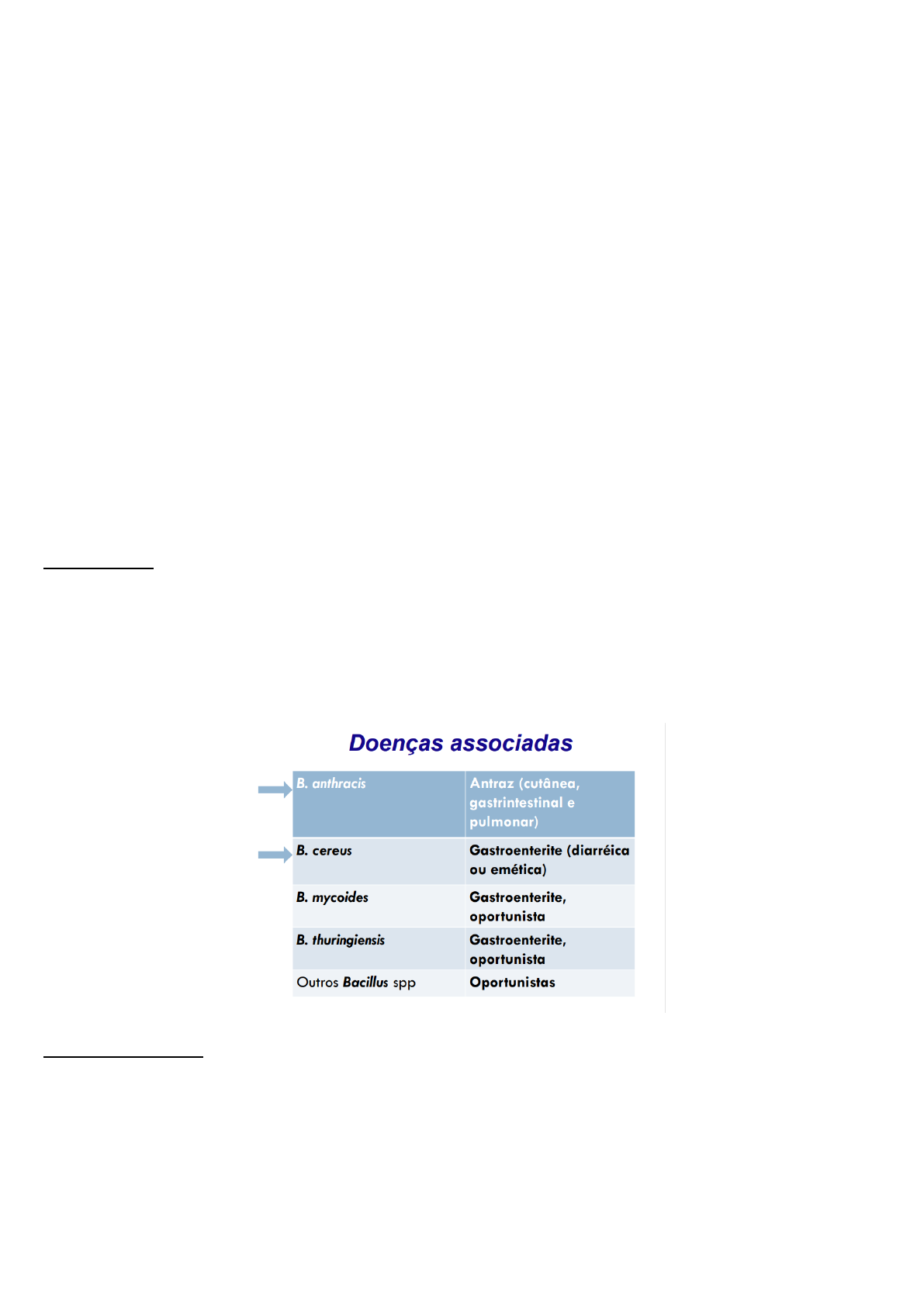 MICROBIOLOGIA BACILOS GRAM POSITIVOS Formadores de esporos ● Bacillus spp ❖ Bacillus cereus: intoxicação alimentar ❖ Bacillus anthracis: zoonose ● Clostridium spp ❖ Clostridium perfringens: infecções teciduais e intoxicação alimentar ❖ Clostridium difficile: colite ❖ Clostridium tetani: tétano ❖ Clostridium botulinum: botulismo. Não formadores de esporos ● Listeria spp ❖ Listeriose: septicemia e meningite ❖ 10% população: portadores Corynebacterium spp Corynebacterium diphtheriae Características gerais: Bacillus spp 60 espécies, maioria saprófitas • Bacillus anthracis: importância histórica • primeira bactéria a que foi associada uma doença, em 1877 por Koch Produzem endósporos, ubíquos Aeróbicos ou anaeróbios facultativos Catalase positiva (maioria) • Termófilos (75°C) e psicrófilos(5-8°C) • Sobrevivem em alterações extremas de pH (pH 2 - 10) Bacillus anthracis ➢ Zoonose: ovelhas, cabras, cavalos • Humanos: inoculação subcutânea ou inalação ➢ Formas clínicas • Antraz cutâneo: pústulas malignas (mais comum - 95%) • Antraz pulmonar: inflamação de linfonodos (mais fatal) • Forma gastrintestinal: incomum, ingestão de esporos ➢Uso em bioterrorismo • Principais ocorrências: II Guerra Mundial, Guerra do Golfo (1991) e intimidação de dirigentes norte americanos (2001) Diagnóstico e tratamento Diagnóstico laboratorial ● Material: secreções de lesões, secreções pulmonares, sangue ● Microscopia: BGP com endósporos, crescimento em agar sangue, imóvel ● Tratamento: Penicilinas, ciprofloxacina ● Bacillus cereus Morfologia Bacilos gram positivos grande, aeróbio ou anaeróbio facultativo com flagelos e esporos centrais e subterminais. Habitat: Solo, vegetais e alimentos processados Características bioquímicas ● Aeróbio, anaeróbio facultativo; ● Fermenta vários carboidratos ● Catalase positiva; ● Todas as cepas são produtoras de hemolisina ● Temperatura ótima para crescimento: 28 a 35 °C Características da Doença ● A- Síndrome diarréica: Período de incubação varia de 8 a 16 h. ● Sintomas: diarréia intensa, dores abdominais, náuseas e vômitos (raro). Duração de 12 a 24 h. ● B- Síndrome emética: de 1 a 5 h. ● Sintomas: vômitos, náuseas e mal-estar geral ● Alimentos: farináceos, principalmente arroz. Síndrome do restaurante chinês Características Gerais ✓ Bastonetes gram positivos. ✓ Anaeróbios. ✓ Móveis. ✓ Habitat natural: Solo ou trato intestinal de animais e seres humanos, onde vivem como saprófitas. Morfologia e identificação ✓Cultura ➢ Só crescem em condições anaeróbias: Tubos de cultura ou placas de ágar num recipiente fechado, com remoção do ar. Clostridium botulinum ✓ Neurotoxina (um dos venenos mais potentes conhecido) ➢ Liberação durante crescimento e autólise. ➢ Existem 7 variedades antigênicas ( A-G ). ➢ São destruídas pelo calor a 100 ºC, durante 20 minutos. ➢Doses diminutas: uso terapêutico (botox). Clostridium tetani ✓ Responsável pelo TÉTANO. ✓ Distribuição mundial. ✓ Encontrado no solo e nas fezes de cavalos e outros animais. ✓Foco típico: farpa de madeira ✓ Produz neurotoxina, a tetanospasmina. ✓Morte: paralisia mm. respiratórios Clostridium perfringens Toxinas ➢ Toxina teta exerce efeitos hemolíticos e necrotizantes:gangrena ➢ Enterotoxina promove hipersecreção acentuada no jejuno e íleo, com perda de líquido e eletrólitos. C. perfringens Tratamento ● Remoção do tecido necrosado ● Exposição ao oxigênio ● Amputação Não formadores de esporos Listeria spp •Cocobacilo Gram-positivo (0,5-2m por 0,4-05 m ) •Intracelular • Anaeróbio facultativo • Oxidase - Catalase + • Não esporulado • Móvel • Esculina + Taxa de mortalidade na listeriose ● Meningite - superior a 70%; ● Septicemia - 50% ● Infecção perinatal/neonatal maior que 80%. ● Em infecções durante a gestação a mãe normalmente sobrevive. Tratamento e controle: ● Penicilina (ampicilina) só ou em combinação com gentamicina tem mostrado efetividade. ● Trimetoprim+sulfametoxazol para alérgicos a penicilina ● Pode ser usada a eritromicina ou tetraciclina. Corynebacterium spp Corynebacterium diphtheriae Habitat: garganta e nasofaringe Produção de toxina: ação em coração e nervos periféricos Significado clínico: infecção trato respiratório superior. Formação de pseudomembrana C. diphtheriae Diagnóstico: Cultura Imunização: DTP (não confere imunização definitiva) Tratamento: Anti toxina, Antibióticos: penicilina ou eritromicina. DIAGNÓSTICO LABORATORIAL DAS INFECÇÕES FÚNGICAS Micoses superficiais ● São afecções produzidas por fungos, limitadas às camadas superficiais queratinizadas ou semi queratinizadas da pele, aos pêlos e unhas, sem lesar o tecido subcutâneo, ossos, articulações e órgãos internos. ● Fatores que Contribuem para o Aparecimento de Micoses superficiais ➢ Endógenos (diabetes, AIDS imunodeprimido, doenças sistêmicas) ➢ Exógenos (umidade, má higiene, distrofias). Principais Tipos ● Pitiríase Versicolor Infecção crônica da camada córnea. ➢Prevalente em climas tropicais ➢ Na maioria das vezes assintomáticas. Fatores responsáveis pelo rompimento do desequilíbrio Malassezia furfur- hospedeiro: ➢Diminuição do Tunover das células escamosas. ➢ Predisposição genética. ➢ Estado nutricional precário. ➢ Infecções crônicas. ➢ Sudorese excessiva. ● Tinea nigra Agente etiológico: Exophiala werneckii Característica: Fungo dimórfico produtor de melanina. Diagnóstico da Tinea nigra ➢Visualização das células leveduriforme. ➢Fragmentos de hifas de raspados tratados com KOH. ● Piedras negra e branca Piedra Negra ● Agente etiológico: Piedraia hortae ● Característica: Fungo teleomórfico quando coloniza a haste do pêlo. Piedra Branca ● Agente etiológico: Trichosporon beigelii ●