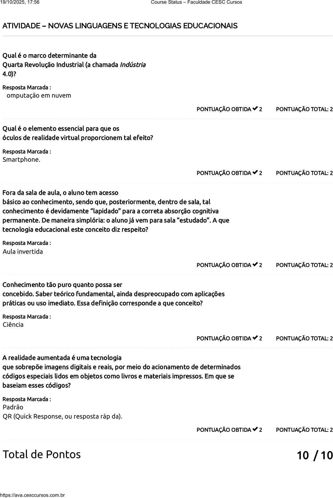 10 / 10 ATIVIDADE – NOVAS LINGUAGENS E TECNOLOGIAS EDUCACIONAIS PONTUAÇÃO TOTAL: 2PONTUAÇÃO OBTIDA 2 Qual é o marco determinante da Quarta Revolução Industrial (a chamada Indústria 4.0)? Resposta Marcada : Computação em nuvem PONTUAÇÃO TOTAL: 2PONTUAÇÃO OBTIDA 2 Qual é o elemento essencial para que os óculos de realidade virtual proporcionem tal efeito? Resposta Marcada : Smartphone. PONTUAÇÃO TOTAL: 2PONTUAÇÃO OBTIDA 2 Fora da sala de aula, o aluno tem acesso básico ao conhecimento, sendo que, posteriormente, dentro de sala, tal conhecimento é devidamente “lapidado” para a correta absorção cognitiva permanente. De maneira simplória: o aluno já vem para sala “estudado”. A que tecnologia educacional este conceito diz respeito? Resposta Marcada : Aula invertida PONTUAÇÃO TOTAL: 2PONTUAÇÃO OBTIDA 2 Conhecimento tão puro quanto possa ser concebido. Saber teórico fundamental, ainda despreocupado com aplicações práticas ou uso imediato. Essa definição corresponde a que conceito? Resposta Marcada : Ciência PONTUAÇÃO TOTAL: 2PONTUAÇÃO OBTIDA 2 A realidade aumentada é uma tecnologia que sobrepõe imagens digitais e reais, por meio do acionamento de determinados códigos especiais lidos em objetos como livros e materiais impressos. Em que se baseiam esses códigos? Resposta Marcada : Padrão QR (Quick Response, ou resposta rápida). Total de Pontos 19/10/2025, 17:56 Course Status – Faculdade CESC Cursos https://ava.cesccursos.com.br/course-status/ 1/1