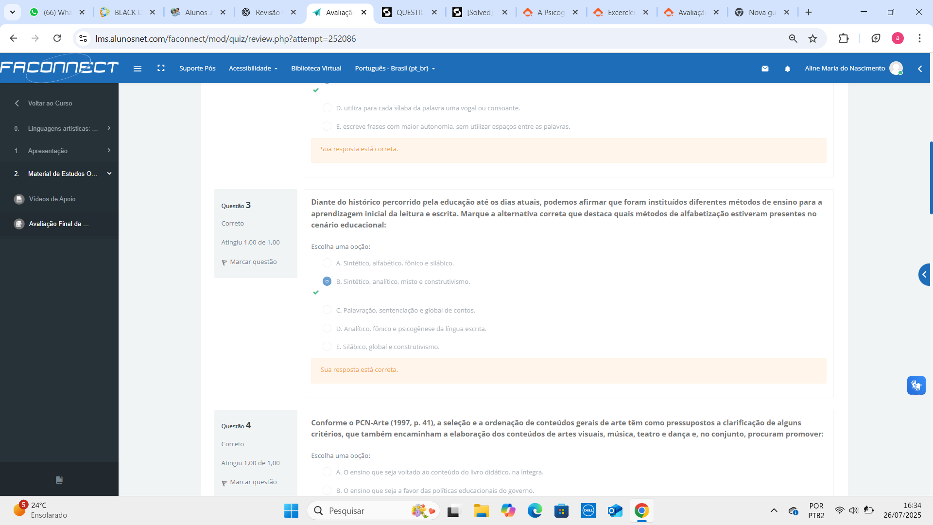 (66) Wha BLACK Alunos Revisão Avaliaçã QUESTIC [Solved] A Excercíc Avaliaçã Nova gu + X 4 a FACONNECT Suporte Pós Acessibilidade Biblioteca Virtual Português Brasil (pt_br) Aline Maria do Nascimento Voltar ao Curso D. utiliza para cada sílaba da palavra uma vogal ou consoante. 0. Linguagens artísticas: > E. escreve frases com maior autonomia, sem utilizar espaços entre as palavras. 1. Apresentação > Sua resposta está correta. 2. Material de Estudos Vídeos de Apoio Questão 3 Diante do histórico percorrido pela educação até os dias atuais, podemos afirmar que foram instituídos diferentes métodos de ensino para a aprendizagem inicial da leitura e escrita. Marque a alternativa correta que destaca quais métodos de alfabetização estiveram presentes no Avaliação Final da Correto cenário educacional: Atingiu 1,00 de 1,00 Escolha uma opção: Marcar questão A. Sintético, alfabético, fônico e silábico.