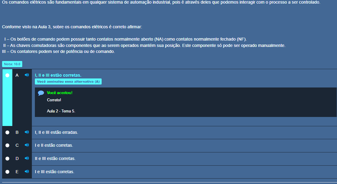 Os comandos elétricos são fundamentais em qualquer sistema de automação industrial, pois é através deles que podemos interagir com 0 processo a ser controlado. Conforme visto na Aula 3, sobre os comandos elétricos é correto afirmar: I - Os botões de comando podem possuir tanto contatos normalmente aberto (NA) como contatos normalmente fechado (NF). II - As chaves comutadoras são componentes que ao serem operados mantém sua posição. Este componente só pode ser operado manualmente. III - Os contatores podem ser de potência ou de comando. Nota: 10.0 A I, II e III estão corretas. Você assinalou essa alternativa (A) Você acertou! Correto! B I, II e III estão erradas. C I e II estão corretas. D II e III estão corretas. E le III estão corretas.