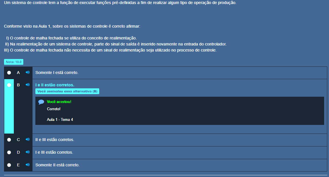Um sistema de controle tem a função de executar funções pré-definidas a fim de realizar algum tipo de operação de produção. Conforme visto na Aula 1, sobre os sistemas de controle é correto afirmar: I) O controle de malha fechada se utiliza do conceito de realimentação. II) Na realimentação de um sistema de controle, parte do sinal de saída é inserido novamente na entrada do controlador. III) O controle de malha fechada não necessita de um sinal de realimentação seja utilizado no processo de controle. Nota: 10.0 A Somente I está correto. B I e II estão corretos. Você assinalou essa alternativa (B) Você acertou! Correto! Aula 1 Tema 4 C II e III estão corretos. D I e III estão corretos. E Somente II está correto.