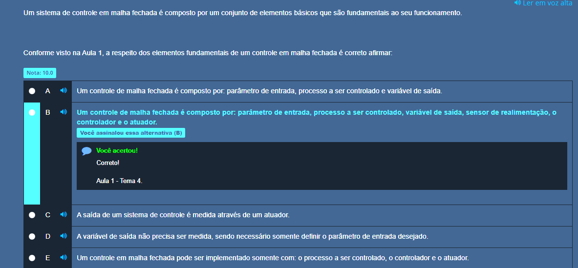 Ler em alta Um sistema de controle em malha fechada é composto por um conjunto de elementos básicos que são fundamentais ao seu funcionamento. Conforme visto na Aula 1, a respeito dos elementos fundamentais de um controle em malha fechada é correto afirmar: Nota: 10.0 A Um controle de malha fechada é composto parâmetro de entrada, processo a ser controlado e variável de saída. B Um controle de malha fechada é composto por: parâmetro de entrada, processo a ser controlado, variável de saída, sensor de realimentação, controlador e atuador. Você assinalou essa alternativa (B) Você acertou! Correto! Aula 1 Tema 4. C A saída de um sistema de controle é medida através de um atuador. D A variável de saída não precisa ser medida, sendo necessário somente definir 0 parâmetro de entrada desejado. E Um controle em malha fechada pode ser implementado somente com: 0 processo a ser controlado, 0 controlador e 0 atuador.