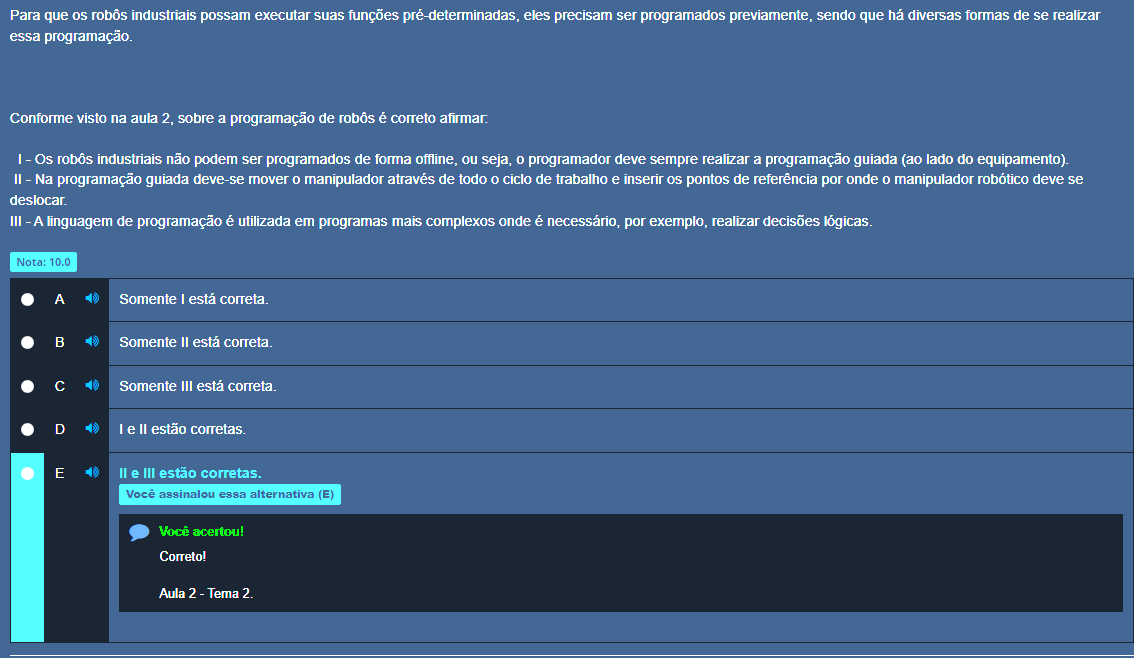 Para que robôs industriais possam executar suas funções pré-determinadas, eles precisam ser programados previamente, sendo que há diversas formas de se realizar essa programação. Conforme visto na aula 2, sobre a programação de robôs é correto Os robôs industriais não podem ser programados de forma offline, ou seja, 0 programador deve sempre realizar a programação guiada (ao lado do equipamento). II - Na programação guiada deve-se mover 0 manipulador através de todo ciclo de trabalho e inserir pontos de referência por onde 0 manipulador robótico deve se deslocar. III A linguagem de programação é utilizada em programas mais complexos onde é necessário, por exemplo, realizar decisões lógicas. Nota: 10.0 A Somente I está correta. B Somente II está correta. C Somente III está correta. D I e II estão corretas. E II e III estão corretas. Você assinalou essa alternativa (E) Você acertou! Correto! Aula 2 Tema 2.