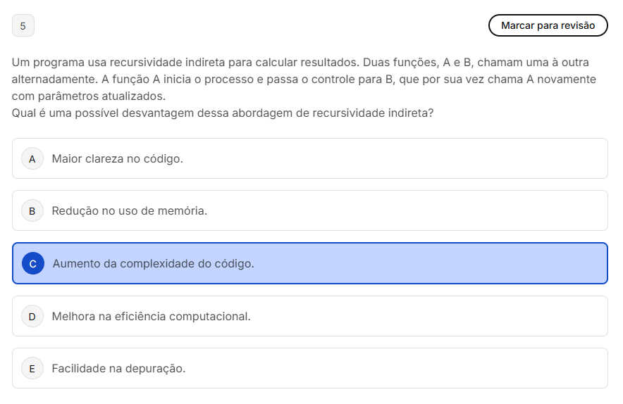 5 Marcar para revisão Um programa usa recursividade indireta para calcular resultados. Duas funções, A e B, chamam uma à outra alternadamente. A função A inicia processo e passa controle para B, que por sua vez chama A novamente com parâmetros atualizados. Qual é uma possível desvantagem dessa abordagem de recursividade indireta? A Maior clareza no código. B Redução no uso de memória. Aumento da complexidade do código. D Melhora na computacional. E Facilidade na depuração.