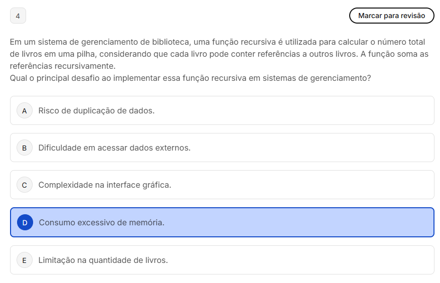 4 Marcar para revisão Em um sistema de gerenciamento de biblioteca, uma função recursiva é utilizada para calcular número total de livros em uma pilha, considerando que cada livro pode conter referências a outros livros. A função soma as referências recursivamente. Qual O principal desafio ao implementar essa função recursiva em sistemas de gerenciamento? A Risco de duplicação de dados. B Dificuldade em acessar dados externos. C Complexidade na interface gráfica. D Consumo excessivo de memória. E Limitação na quantidade de livros.