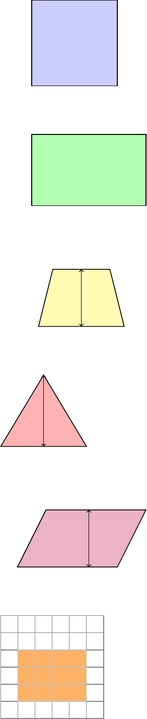 1) Determine a área (em m2) e o perímetro (em m) do quadrado abaixo: 6 cm 6 cm 2) Determine a área (em dm2) e o perímetro (em dm) do retângulo abaixo: 8 cm 5 cm 3) Determine a área (em cm2) e o perímetro (em cm) do trapézio abaixo: 6 cm 4 cm 4.12 cm 4.12 cm4 cm 4) Determine a área (em mm2) do triângulo abaixo: 6 cm 5 cm 5) Determine a área (em m2) e o perímetro (em m) do paralelogramo abaixo: 7 cm 7 cm 4 cm 4 cm4 cm 6) Determine a área e o perímetro das figuras em quadradinhos: 1 7) Shimeni tem um terreno similar ao desenho abaixo. Se ela desejar cercar esse terreno, com a cerca contendo 4 arames, quantos metros de arame seriam necessários? 35 m 9 m 29 m 15 m 8) Uma piscina em formato de L (deitado) tem as dimensões indicadas na figura: 18 m 7 m 10 m 13 m 3 m 5 m Responda: 1. Determine o perímetro da piscina em cm. 2. Determine a área total da piscina em cm2. 9) Determine o volume da caixa retangular abaixo: 4 m 3 m 2 m Responda: 1. Qual é o volume da caixa em m³? 2. Se cada cubinho dentro da caixa tivesse 1 m³, quantos caberiam dentro? 2 10) Uma caixa em L foi construída com cubos de 1 m³. Determine o volume total: 5 m 3 m 2 m 2 m 2 m 1.5 m Responda: 1. Determine o volume total da caixa em L. 2. Quantos cubinhos de 1 m³ são necessários para preenchê-la? 11) Dadas as figuras abaixo, determine a área de cada uma delas: 12) Dadas as figuras abaixo, determine a área e perímetro de cada uma delas: 13) Determine a área (em m2) e o perímetro (em m) do quadrado abaixo: 5 cm 5 cm 14) Determine a área (em cm2) e o perímetro (em m) do retângulo abaixo: 3 10 cm 3 cm 15) Determine a área (em m2) e o perímetro (em cm) do trapézio abaixo: 8 cm 4 cm 3 cm3.16 cm 2.83 cm 16) Determine a área (em m2) e o perímetro (em m) do triângulo abaixo: 8 cm 3 cm 5.0 cm5.0 cm 17) Determine a área (em cm2) e o perímetro (em cm) do paralelogramo abaixo: 7 cm 4 cm 18) Na malha abaixo, determine a área (em quadradinhos) e o perímetro (em unidades de lado): 19) Determine o perímetro do polígono abaixo: 12 m 6 m 4 m 2 m 4 m 2 m 4 m 6 m 20) Uma piscina retangular tem 12m por 5m. Determine a área (em m2) e o perímetro (em m). 12 m 5 m 4 21) Um quadrado com lado 200 cm. Determine a área em m2 e o perímetro em metros. 200 cm 200 cm 22) Um terreno retangular mede 60m× 40m. Determine a área em m2. 60 m 40 m 23) Trapézio com bases b1 = 9 cm, b2 = 5 cm e altura h = 4 cm. Determine a área. A = (b1 + b2) · h 2 24) Calcule a área do Triângulo (7 cm) e altura (4 cm). 25) Um paralelogramo tem base 9m e altura relativa 4m. Determine área e o perímetro se o lado oblíquo mede 7m. 4 m 9 m 7 m 26) Na malha abaixo, calcule área e perímetro da figura formada: 27) Determine o perímetro e a área do polígono constituído por um retângulo 7m× 3m ao qual foi anexado um quadrado 2m× 2m em uma das faces. 7 m 3 m 2 m 28) Uma caixa retangular mede 3m× 2m× 1.5m. Determine o volume em m3 e em litros. 29) Uma caixa em L é composta por dois blocos/paralelepípedos: A: 4m × 3m × 2m m e B: 2m× 2m× 1m m. Determine o volume total. 30) Triângulo retângulo com base 6 cm e altura 8 cm. Determine área e perímetro. 5 6 cm 8 cm 31) Na malha quadriculada abaixo, determine a aréa do trapézio: 32) Paralelogramo com lados 9 cm e 5 cm. Determine o perímetro e a área se a altura relativa à base 9 cm é 4 cm. 4 cm 33) Compare área e perímetro das duas figuras abaixo (malha): 34) Um quarto 6m× 4m terá um tapete 2m× 1, 5m central. Determine a área descoberta. tapete 35) Trapézio isósceles com bases 10 e 6 e altura 4. Determine a área. 4 cm 10 cm 6 cm 36) Um quadrado 10m× 10m tem um quadrado 3m× 3m recortado no canto. Determine a área restante e o perímetro do contorno. 6 37) Determine o perímetro do polígono abaixo: 6 m 2 m 2 m 2 m 2 m 2 m 2 m 2 m 38) Na malha abaixo, conte as células azuis e determine área (em quadradinhos) e perí- metro (em unidades de lado): 39) Um terreno tem a forma de trapézio com bases 20 m e 12 m e altura 8 m. Determine área em cm². 20 m 12 m 8 m 40) Uma caixa mede 120 cm× 80 cm× 60 cm. Determine o volume em cm3. 41) Triângulo com base 10 cm e altura 6 cm e lados 8 cm e 10 cm. Determine área em m² e perímetro em dm. 6 cm 10 cm 8 cm 10 cm 42) A, B, C e D abaixo representam arranjos de quadradinhos. Indique qual tem maior área e qual tem maior perímetro: 7 AAAA BB C DDD 43) Retângulo 12 × 6 com um retângulo 4 × 2 recortado interiormente (não no canto). Determine a área restante e o perímetro do contorno. 44) Trapézio com bases 14 dm e 8 dm e altura 3 dm. Determine a área em dm2 e em m2. 45) Uma figura é formada por um retângulo 6 × 4 e sobre ele um triângulo de base 6 e altura 2 (telhado). Determine a área total. 46) Na malha quadriculada abaixo, determine a área e perímetro. 47) Um pentágono regular (onde todos os lados são iguais) tem lado 4 cm. Calcule o perímetro em dam. 48) Uma caixa sem tampa tem base 1, 2m× 0, 8m e altura 0, 6m. Determine volume e área da superfície (sem tampa). 49) Uma piscina é composta de uma parte rasa 2m×3m com profundidade 0,8m e de uma parte profunda de 4m × 3m com profundidade 1,8m. Determine o volume total da piscina em m3. 8 50) Um quadrado 10cm× 10cm tem um retângulo 4cm× 6cm removido. Determine a área restante (área pintada) em m2eopermetrodocontornoemdm. 9 km hm dam m dm cm mm 10 km2 hm2 dam2 m2 dm2 cm2 mm2 11