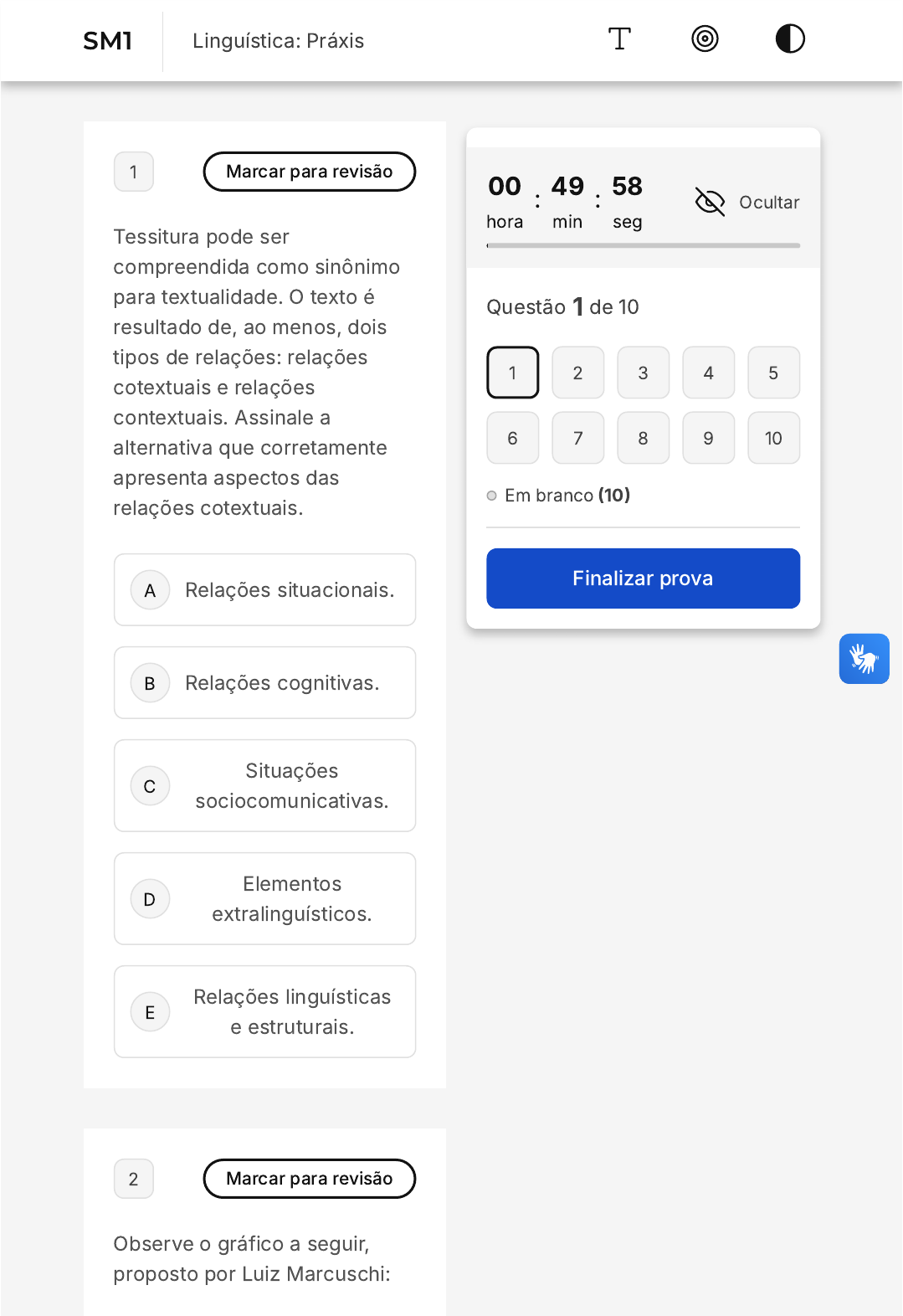 A B C D E 1 Marcar para revisão Tessitura pode ser compreendida como sinônimo para textualidade. O texto é resultado de, ao menos, dois tipos de relações: relações cotextuais e relações contextuais. Assinale a alternativa que corretamente apresenta aspectos das relações cotextuais. Relações situacionais. Relações cognitivas. Situações sociocomunicativas. Elementos extralinguísticos. Relações linguísticas e estruturais. 2 Marcar para revisão Observe o gráfico a seguir, proposto por Luiz Marcuschi: 00 hora : 49 min : 58 seg Ocultar Questão 1 de 10 Em branco (10) Finalizar prova 1 2 3 4 5 6 7 8 9 10 SM1 Linguística: Práxis A B C Fonte: MARCUSCHI, L. Da fala para a escrita: atividades de retextualização. São Paulo: Cortez, 2001, p. 38. O gráfico representa: o baixo grau de textualidade de textos orais. a divisão rígida entre língua falada e língua escrita. a sobreposição de características entre gêneros orais e escritos. D E A B a inadequação de aspectos de textualidade na produção de textos sinalizados. a inexistência de sobreposição de características entre gêneros orais e escritos. 3 Marcar para revisão É possível observarmos as questões culturais e ideológicas presentes nos discursos materializados em textos. Sobre essa questão, o que podem representar as expressões abaixo? Homem não chora / País de maricas Representam as relações de poder identificadas no racismo. Representam as relações de poder identificadas no machismo. C D E A B C Representam as relações de poder identificadas no discurso médico. Representam as relações de domínio identificadas apenas no machismo. Representam as relações de domínio identificadas no discurso educacional. 4 Marcar para revisão No grupo de fatores de configuração linguística que compõem o esquema de textualidade, estão os fatores cotextuais: a coesão e a coerência. O processo de textualização que observa as relações referenciais e sequenciais que geram a progressão textual baseada na forma chama-se: Intertextualidade. Intencionalidade. Situacionalidade. D E Coerência. Coesão. 5 Marcar para revisão Para que a construção da coerência possa ser melhor compreendida, é preciso conhecer as funções da linguagem, bem como de seus propósitos sociais e convencionais. Sobre o tema, analise as afirmativas a seguir e a relação de conclusão estabelecida entre elas: I. Os textos se materializam a partir das diferentes interações sociais, cumprindo com funcionalidades e sentidos relacionados aos seus gêneros e tipos textuais mais associados. PORQUE II. O conhecimento textual revelado no domínio das características tipológicas textuais e dos próprios gêneros discursivos está profundamente comprometido com a construção da coerência textual. Assinale a alternativa correta: A B C D E A afirmativa I é falsa, e a II é verdadeira. A afirmativa I é verdadeira, e a II é falsa. Ambas as afirmativas são verdadeiras, e a II é uma conclusão correta da I. Ambas as afirmativas são falsas. Ambas as afirmativas são verdadeiras, mas a II não é uma conclusão correta da I. 6 Marcar para revisão Na Linguística Cognitiva, encontramos a Teoria dos Protótipos, que está relacionada com processos cognitivos de domínio geral com a categorização e a analogia. O conceito de protótipos, nesse caso, corresponde A B C a características mínimas e suficientes que permitem afirmar que um elemento pertence a uma determinada classe e não a outra. a atributos inumeráveis e difusos que permitem afirmar que um elemento pertence a uma determinada classe e não a outra. aos traços mínimos, porém insuficientes, que permitem afirmar que um elemento pertence a uma determinada classe e não a outra. D E aos traços ilimitados e suficientes que permitem reconhecer um elemento pertencente a diferentes classes. às características comuns e, também, distintas que não permitem reconhecer um elemento pertencente a uma determinada classe e não a outra. 7 Marcar para revisão Os esquemas imagéticos fazem parte do modelo de descrição da Semântica Cognitiva. Eles partem da ideia de que, à medida em que se lida com as coisas do mundo, manipulando-as e se movendo temporal e espacialmente, direciona-se o foco perceptual para determinada situação, determinada entidade. Assim, é correto afirmar que esquemas imagéticos A B C não estão relacionados com a maneira como percebemos e interpretamos as coisas e emergem a partir das atividades sensório-motoras. estão relacionados com a maneira como percebemos e interpretamos as coisas e emergem a partir das atividades sensório-motoras. estão relacionados com a maneira como percebemos e interpretamos as coisas e emergem a partir das atividades formais de aprendizagem da língua. D E não estão relacionados com a maneira como percebemos e interpretamos as coisas e emergem a partir das atividades motoras. estão relacionados com a maneira como percebemos e interpretamos as coisas e emergem a partir de operações mentais que se dão pelo sentido da visão. 8 Marcar para revisão A Hipótese da Corporificação pode ser associada ao campo da semântica cognitiva. Sobre o tema, analise as afirmativas abaixo e a relação estabelecida entre elas. I - A Hipótese da Corporificação sustenta que os fenômenos estudados devem ser constantemente compreendidos através da forma pela qual o homem interage com o ambiente no qual está inserido. PORQUE II- É através do corpo que o ser humano, primariamente, estabelece sua experiência no mundo. A B C D E Assinale a alternativa correta: A afirmativa I é verdadeira e a afirmativa II é falsa. A afirmativa II é verdadeira e a afirmativa I é falsa. As afirmativas são falsas, por isso mesmo não há relação coerente entre elas. Ambas as afirmativas são verdadeiras, mas a II não é uma justificativa da I. Ambas as afirmativas são verdadeiras e a II é uma justificativa correta da I. 9 Marcar p