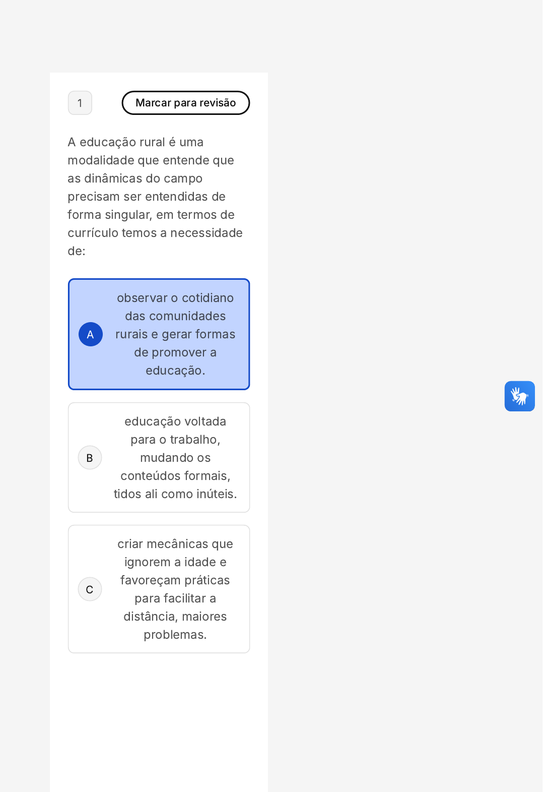 A B C 1 Marcar para revisão A educação rural é uma modalidade que entende que as dinâmicas do campo precisam ser entendidas de forma singular, em termos de currículo temos a necessidade de: observar o cotidiano das comunidades rurais e gerar formas de promover a educação. educação voltada para o trabalho, mudando os conteúdos formais, tidos ali como inúteis. criar mecânicas que ignorem a idade e favoreçam práticas para facilitar a distância, maiores problemas. D E não existe de fato, é somente um direcionamento genérico da LDB que o campo tem direito a educação. um currículo diferenciado em termos de temporalidade e conteúdos para ser mais rápida e liberar o jovem para o campo. 2 Marcar para revisão É particularmente importante compreender a influência dos diferentes cenários escolares sobre os currículos quando o tema a abordar são as diferentes modalidades de educação, já que as especificidades delas aparecem desde a legislação até cada uma das realidades escolares nas quais cada modalidade é localmente implementada. Assim sendo, para estudar esses currículos, é: I. Preciso nos debruçarmos sobre diferentes modalidades de educação, suas especificidades e exigências, além de percebermos que as diferenças, adaptações, alterações e configurações A B C D E variam, também, no interior de cada modalidade, de cada espaço educativo. II. Vamos estudar os currículos por projetos, já que na origem desses está a preocupação com a adequação do trabalho pedagógico à realidade de cada escola, ou seja, com a construção de um currículo já por meio do diálogo entre as normas gerais e as especificidades locais. III. Estudar o papel dos saberes docentes na construção curricular cotidiana já que o modo de atuar, as abordagens dos conteúdos e as propostas que levam à frente dependem de quem são, do que sabem, da formação e da experiência que têm os professores atuando em cada nível, modalidade e localidade. As afirmativas corretas são: I e II somente I e III somente II e III somente I, II e III estão corretas. Somente a I A B C 3 Marcar para revisão Leia as duas afirmativas a seguir: I. Em termos formais, a política curricular diz respeito ao conjunto de leis e regulamentações que versam sobre o que deve ser ensinado nas escolas. II. A política curricular precisa ser entendida como sendo toda decisão ou todo condicionamento dos conteúdos e do desenvolvimento do currículo a partir das instâncias em que essas políticas acontecerão. Sobre as afirmativas acima é correto afirmar que: As duas são verdadeiras, e a segunda é uma justificativa correta da primeira. As duas são verdadeiras, mas não estão relacionadas. A primeira é uma afirmativa falsa e a segunda, verdadeira. D E A B A primeira é uma afirmativa verdadeira e a segunda, falsa. As duas são falsas e não estão relacionadas. 4 Marcar para revisão (IDHTEC - 2019 - Professor) O currículo escolar se apresenta como elemento central do projeto pedagógico, por isso, é preciso considerar em sua construção a complexidade dos saberes e das diferentes áreas presentes no contexto atual. Nesse sentido, pensar a organização do currículo escolar implica: Construir um currículo que prevaleça a hierarquia das disciplinas, uma vez que facilitará o processo de ensino. Dar ênfase aos conceitos em detrimento das habilidades e competências. C D E Desenvolver práticas que priorizem as disciplinas de primeira grandeza, como linguagens e matemática. Refletir sobre a neutralidade inerente ao processo de construção da proposta da escola. Construir uma proposta fundamentada na interdisciplinaridade e na contextualização de modo a assegurar um maior diálogo entre as áreas do saber. 5 Marcar para revisão A BNCC é um documento norteador para a formulação dos currículos da educação brasileira, entretanto, esse ponto de vista é uma imensa controvérsia para alguns especialistas. Há uma crítica quanto ao fato de a BNCC seguir uma matriz de currículo por competências. Assinale a alternativa que diz respeito à crítica à adoção desse modelo. A B O conceito de competência, adotado pela BNCC, marca a discussão pedagógica e social das últimas décadas e pode ser inferido no texto da LDB, especialmente quando se estabelecem as finalidades gerais do ensino fundamental e do ensino médio. A BNCC é a indicação clara do que os alunos devem 'saber' - considerando a constituição de conhecimentos, habilidades, atitudes e valores - e, sobretudo, do que devem 'saber fazer' - considerando a mobilização desses conhecimentos, habilidades, atitudes e valores para resolver demandas complexas da vida cotidiana e do mundo do trabalho. SM2 Curriculo Escolar C D E A explicitação das competências oferece referências para o fortalecimento de ações que assegurem as aprendizagens essenciais definidas na BNCC. A adoção da escola integral é mais importante que a escola de tempo integral, o que pode promover o desenvolvimento de mais competências. A BNCC, quando assume uma posição mais próxima do atendimento ao mercado de trabalho, focada em mecanismos de gestão, acaba por limitar a formação do sujeito à sua dimensão econômica. 6 Marcar para revisão Considerando as críticas sobre a Base Nacional Comum Curricular (BNCC), podemos afirmar que ela propõe: I. Ênfase na regulação e no controle do sistema 00 hora : 35 min : 35 seg Ocultar Questão 10 de 10 Respondidas (10) Em branco (0) Finalizar prova 1 2 3 4 5 6 7 8 9 10 A B C educacional, do trabalho dos professores e das escolas, contribuindo, paradoxalmente, para secundarizar e/ou desqualificar o trabalho docente e para responsabilizar os professores pelo desempenho dos estudantes. II. Entendimento extenso em termos de conteúdo, visto como currículo base nacional, com relação de conteúdos mínimos prescritivos (competências e habilidades). III. Avaliação considerando resultados regionais e, 