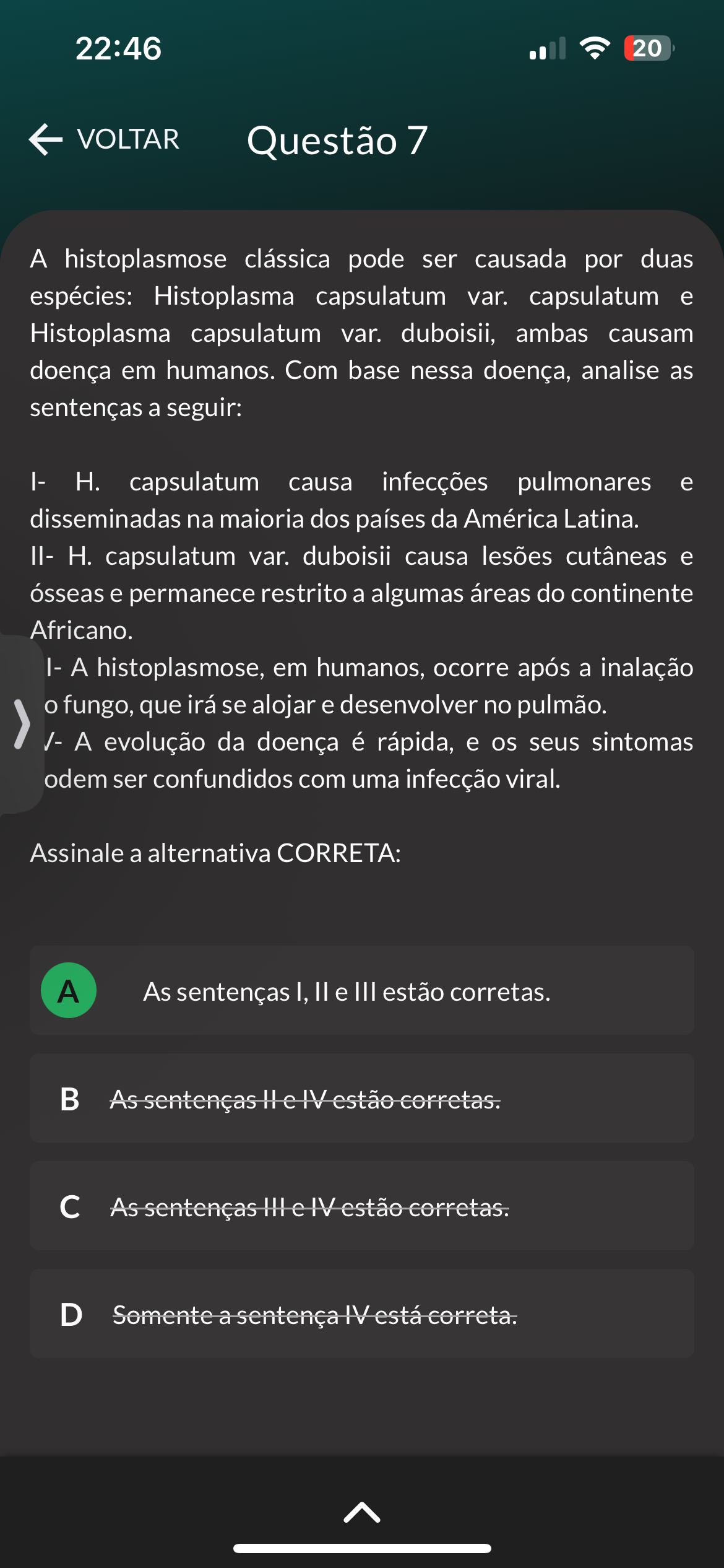 22:46 20 VOLTAR Questão 7 A histoplasmose clássica pode ser causada por duas espécies: Histoplasma capsulatum var. capsulatum e Histoplasma capsulatum var. duboisii, ambas causam doença em humanos. Com base nessa doença, analise as sentenças a seguir: I- capsulatum causa infecções pulmonares e disseminadas na maioria dos países da América Latina. II- H. capsulatum var. duboisii causa lesões cutâneas e ósseas e permanece restrito a algumas áreas do continente Africano. I- A histoplasmose, em humanos, ocorre após a inalação fungo, que irá se alojar e desenvolver no pulmão. - A evolução da doença é rápida, e os seus sintomas odem ser confundidos com uma infecção viral. Assinale a alternativa CORRETA: A As sentenças I, e III estão corretas. As sentenças IV estão corretas. c As sentenças III e IV estão corretas. D Somente a sentença IV está correta.