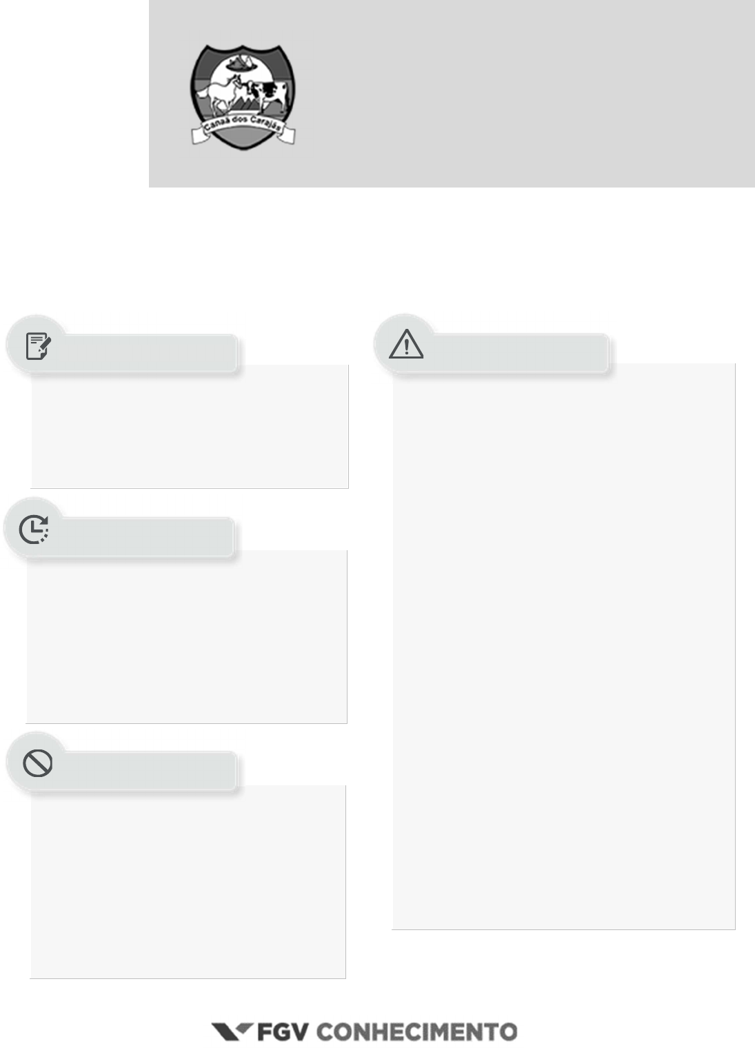 PREFEITURA MUNICIPAL DE CANAÃ DOS CARAJÁS CONCURSO PÚBLICO – EDITAL 01/2024 PROVA OBJETIVA – TARDE AGENTE DE SERVIÇOS DE SEGURANÇA PATRIMONIAL NÍVEL FUNDAMENTAL INCOMPLETO TIPO 1 – BRANCA Além deste caderno contendo 30 (trinta) questões objetivas, você receberá do fiscal de prova o cartão de respostas; As questões objetivas têm 5 (cinco) opções de resposta (A, B, C, D e E) e somente uma delas está correta. Verifique se seu caderno de questões está completo, sem repetição de questões ou falhas. Caso contrário, notifique imediatamente o fiscal da sala, para que sejam tomadas as devidas providências; Confira seus dados pessoais, especialmente nome, número de inscrição e documento de identidade e leia atentamente as instruções para preencher o cartão de respostas; Para o preenchimento do cartão de respostas, use somente caneta esferográfica, fabricada em material transparente, com tinta preta ou azul; Assine seu nome apenas no(s) espaço(s) reservado(s) no cartão de respostas; Confira seu cargo, cor e tipo do caderno de questões. Caso tenha recebido caderno de cargo ou cor ou tipo diferente do impresso em seu cartão de respostas, o fiscal deve ser obrigatoriamente informado para o devido registro na ata da sala; Reserve tempo suficiente para o preenchimento do seu cartão de respostas. O preenchimento é de sua responsabilidade e não será permitida a troca do cartão de respostas em caso de erro cometido pelo candidato; Para fins de avaliação, serão levadas em consideração apenas as marcações realizadas no cartão de respostas; A FGV coletará as impressões digitais dos candidatos na lista de presença; Os candidatos serão submetidos ao sistema de detecção de metais quando do ingresso e da saída de sanitários durante a realização das provas. Boa sorte! Você dispõe de 3 (três) horas para a realização da prova, já incluído o tempo para a marcação do cartão de respostas; 2 (duas) horas após o início da prova, é possível retirar-se da sala, sem levar o caderno de questões; A partir dos 30 (trinta) minutos anteriores ao término da prova é possível retirar-se da sala levando o caderno de questões. Qualquer tipo de comunicação entre os candidatos durante a aplicação da prova; Anotar informações relativas às respostas em qualquer outro meio que não seja o caderno de questões; Levantar da cadeira sem autorização do fiscal de sala; Usar o sanitário ao término da prova, após deixar a sala. SUA PROVA TEMPO NÃO SERÁ PERMITIDO INFORMAÇÕES GERAIS PREFEITURA MUNICIPAL DE CANAÃ DOS CARAJÁS FGV CONHECIMENTO Agente de Serviços de Segurança Patrimonial – TARDE TIPO BRANCA – PÁGINA 3 Módulo I – Conhecimentos Básicos Língua Portuguesa 1 As palavras sublinhadas na frase a seguir são antônimas. Os homens nunca são tão bons nem tão maus quanto suas opiniões. Assinale a opção que apresenta corretamente um exemplo de antônimo. (A) alto X magro. (B) pobre X carente. (C) caro X barato. (D) novo X moderno. (E) sujo X organizado. 2 O anúncio de um azeite dizia: Compre azeite X, é português e mais barato! Para vender o produto, o anunciante apelou para (A) a origem e o preço. (B) o preço e a pureza. (C) a pureza e o sabor. (D) o sabor e a beleza. (E) a beleza e a origem. 3 Assinale a afirmativa em que o pronome possessivo não indica posse de algo. (A) Meu carro está com defeito. (B) Meu pai viajou ontem. (C) Meu caderno caiu na poça. (D) Meu terno está amarrotado. (E) Meu relógio está atrasado. 4 Assinale a opção em que a pergunta é respondida com sim ou não. (A) Quando você chega? (B) Onde você mora? (C) Como você vem à festa? (D) Quem é aquele professor? (E) Você mora aqui? 5 Assinale a afirmativa em que o adjetivo sublinhado mostra uma opinião do autor da frase. (A) Minha camisa azul é muito bonita. (B) Os carros importados são mais caros. (C) O discurso papal foi longo e demorado. (D) Aquele livro interessante chegou ontem. (E) As férias regulares começam em dezembro. 6 Assinale a palavra a seguir que mostra um erro de ortografia, porque deveria ser grafada com G e não com J. (A) Jeitoso. (B) Majestade. (C) Pájina. (D) Jiló. (E) Laje. 7 Assinale a única palavra que está corretamente acentuada. (A) Lâmpada. (B) Corredôr. (C) Professôra. (D) Camundóngo. (E) Fôrça. 8 Assinale a palavra que se refere a uma coisa concreta e não a uma realidade abstrata. (A) Biblioteca. (B) Amizade. (C) Orgulho. (D) Saudade. (E) Amor. 9 Assinale a opção em que a segunda palavra tem valor mais intenso que a primeira. (A) minúsculo / pequeno. (B) enorme / grande. (C) milionário / rico. (D) sujo / imundo. (E) lindo / bonito. 10 Nas opções a seguir há um substantivo e um adjetivo que tiveram sua posição trocada. Assinale a opção em que a troca de posição mudou o sentido. (A) caminho extenso / extenso caminho. (B) folhas verdes / verdes folhas. (C) homem pobre / pobre homem. (D) casa bonita / bonita casa. (E) livro interessante / interessante livro. 11 Leia a frase a seguir. A pessoa altamente intelectualizada estuda bastante e reflete sobre ideias novas. Nessa frase, o advérbio altamente se refere a: (A) pessoa. (B) intelectualizada. (C) bastante. (D) ideias. (E) novas. 12 As frases a seguir falam bem do livro, com exceção de uma. Assinale-a. (A) Os livros são a bendita anestesia da mente. (B) Os livros são amigos frios e seguros. (C) Um país se faz com homens e livros. (D) Os livros são os melhores amigos da inteligência. (E) Alguns livros nos impedem de raciocinar. PREFEITURA MUNICIPAL DE CANAÃ DOS CARAJÁS FGV CONHECIMENTO Agente de Serviços de Segurança Patrimonial – TARDE TIPO BRANCA – PÁGINA 4 13 Assinale a opção em que a frase de propaganda tenta vender as “camisas X” apelando para a vaidade do comprador. (A) Camisas X: as mais baratas do mercado! (B) As camisas X têm tecido forte e resistente. (C) Fique elegante com as camisas X! (D) Camisas X: de to