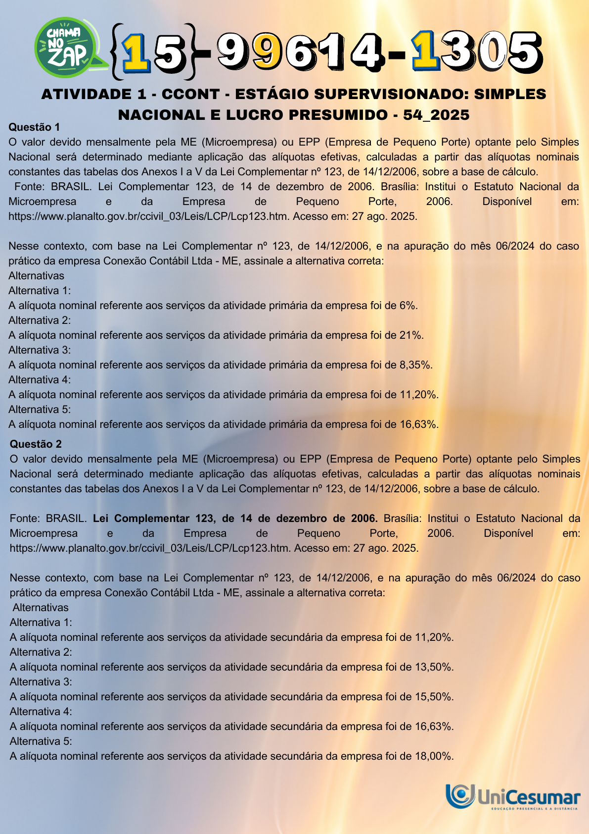 Questão 1 O valor devido mensalmente pela ME (Microempresa) ou EPP (Empresa de Pequeno Porte) optante pelo Simples Nacional será determinado mediante aplicação das alíquotas efetivas, calculadas a partir das alíquotas nominais constantes das tabelas dos Anexos I a V da Lei Complementar nº 123, de 14/12/2006, sobre a base de cálculo. Fonte: BRASIL. Lei Complementar 123, de 14 de dezembro de 2006. Brasília: Institui o Estatuto Nacional da Microempresa e da Empresa de Pequeno Porte, 2006. Disponível em: https://www.planalto.gov.br/ccivil_03/Leis/LCP/Lcp123.htm. Acesso em: 27 ago. 2025. Nesse contexto, com base na Lei Complementar nº 123, de 14/12/2006, e na apuração do mês 06/2024 do caso prático da empresa Conexão Contábil Ltda - ME, assinale a alternativa correta: Alternativas Alternativa 1: A alíquota nominal referente aos serviços da atividade primária da empresa foi de 6%. Alternativa 2: A alíquota nominal referente aos serviços da atividade primária da empresa foi de 21%. Alternativa 3: A alíquota nominal referente aos serviços da atividade primária da empresa foi de 8,35%. Alternativa 4: A alíquota nominal referente aos serviços da atividade primária da empresa foi de 11,20%. Alternativa 5: A alíquota nominal referente aos serviços da atividade primária da empresa foi de 16,63%. ATIVIDADE 1 - CCONT - ESTÁGIO SUPERVISIONADO: SIMPLES NACIONAL E LUCRO PRESUMIDO - 54_2025 Questão 2 O valor devido mensalmente pela ME (Microempresa) ou EPP (Empresa de Pequeno Porte) optante pelo Simples Nacional será determinado mediante aplicação das alíquotas efetivas, calculadas a partir das alíquotas nominais constantes das tabelas dos Anexos I a V da Lei Complementar nº 123, de 14/12/2006, sobre a base de cálculo. Fonte: BRASIL. Lei Complementar 123, de 14 de dezembro de 2006. Brasília: Institui o Estatuto Nacional da Microempresa e da Empresa de Pequeno Porte, 2006. Disponível em: https://www.planalto.gov.br/ccivil_03/Leis/LCP/Lcp123.htm. Acesso em: 27 ago. 2025. Nesse contexto, com base na Lei Complementar nº 123, de 14/12/2006, e na apuração do mês 06/2024 do caso prático da empresa Conexão Contábil Ltda - ME, assinale a alternativa correta: Alternativas Alternativa 1: A alíquota nominal referente aos serviços da atividade secundária da empresa foi de 11,20%. Alternativa 2: A alíquota nominal referente aos serviços da atividade secundária da empresa foi de 13,50%. Alternativa 3: A alíquota nominal referente aos serviços da atividade secundária da empresa foi de 15,50%. Alternativa 4: A alíquota nominal referente aos serviços da atividade secundária da empresa foi de 16,63%. Alternativa 5: A alíquota nominal referente aos serviços da atividade secundária da empresa foi de 18,00%. - - https://www.instagram.com/excellenceeducacional/p/DG1XaOaREOS/ https://www.instagram.com/excellenceeducacional/p/DG1XaOaREOS/