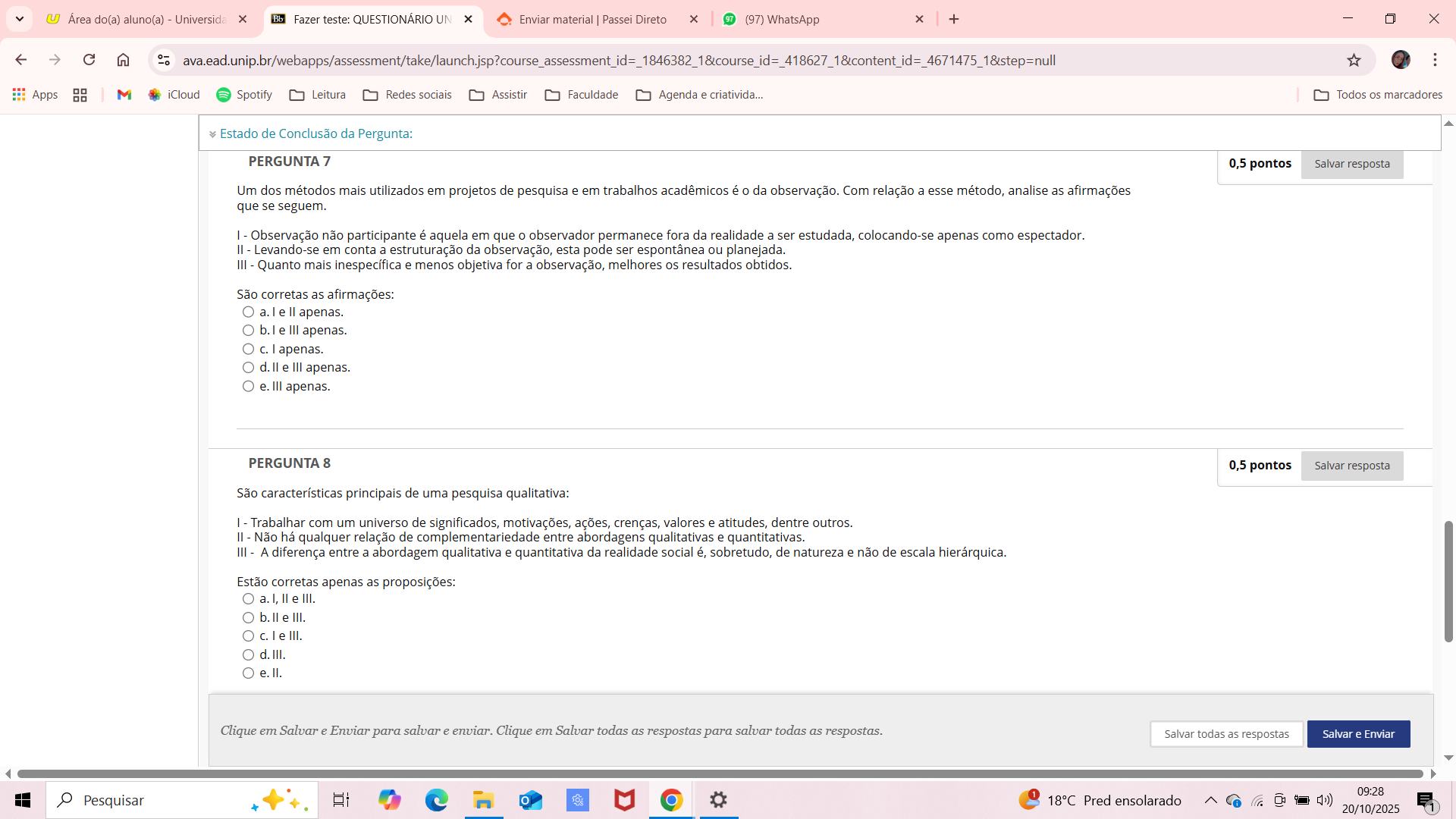 Área do(a) aluno(a) Universida Fazer teste: QUESTIONÁRIO UN Enviar material Passei Direto (97) WhatsApp + X Apps 00 iCloud Spotify Leitura Redes sociais Assistir Faculdade Agenda e criativida... Todos os marcadores 00 Estado de Conclusão da Pergunta: PERGUNTA 7 0,5 pontos Salvar resposta Um dos métodos mais utilizados em projetos de pesquisa e em trabalhos acadêmicos é da observação. Com relação a esse método, analise as afirmações que se seguem. I Observação não participante é aquela em que observador permanece fora da realidade a ser estudada, colocando-se apenas como espectador. II Levando-se em conta a estruturação da observação, esta pode ser espontânea ou planejada. III Quanto mais inespecífica e menos objetiva for a observação, melhores os resultados obtidos. São corretas as afirmações: a.l e apenas. b. e III apenas. C. apenas. d. e III apenas. e. III apenas. PERGUNTA 8 0,5 pontos Salvar resposta São características principais de uma pesquisa qualitativa: I Trabalhar com um universo de significados, motivações, ações, crenças, valores e atitudes, dentre outros. Não há qualquer relação de complementariedade entre abordagens qualitativas e quantitativas. III A diferença entre a abordagem qualitativa e quantitativa da realidade social é, sobretudo, de natureza e não de escala hierárquica. Estão corretas apenas as proposições: a. I, II e III. b. III. C. III. Clique em Salvar e Enviar para salvar e enviar. Clique em Salvar todas as respostas para salvar todas as respostas. Salvar todas as respostas Salvar e Enviar 09:28 Pesquisar Pred ensolarado 20/10/2025