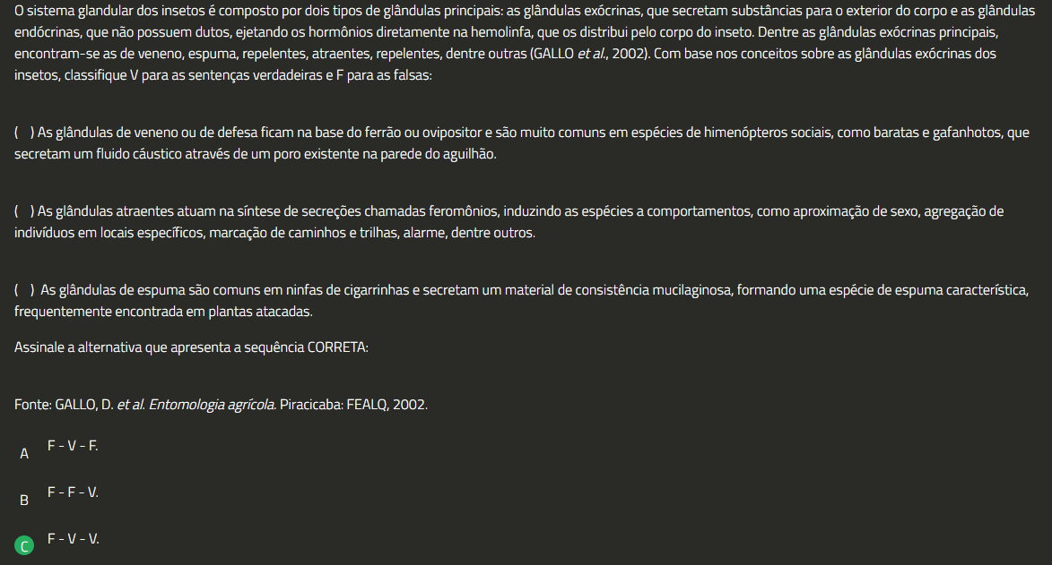 0 sistema glandular dos insetos é composto por dois tipos de glândulas principais: as glândulas exócrinas, que secretam substâncias para 0 exterior do corpo e as glândulas endócrinas, que não possuem dutos, ejetando hormônios diretamente na hemolinfa, que distribui pelo corpo do inseto. Dentre as glândulas exócrinas principais, encontram-se as de veneno, espuma, repelentes, atraentes, repelentes, dentre outras (GALLO et al., 2002). Com base nos conceitos sobre as glândulas dos insetos, classifique V para as sentenças verdadeiras e F para as falsas: ( ) As glândulas de veneno ou de defesa ficam na base do ferrão ou ovipositor e são muito comuns em espécies de himenópteros sociais, como baratas e gafanhotos, que secretam um fluido cáustico através de um poro existente na parede do aguilhão. As glândulas atraentes atuam na de secreções chamadas feromônios, induzindo as espécies a comportamentos, como aproximação de sexo, agregação de indivíduos em locais específicos, marcação de caminhos e trilhas, alarme, dentre outros. As glândulas de espuma são comuns em ninfas de cigarrinhas e secretam um material de consistência mucilaginosa, formando uma espécie de espuma característica, frequentemente encontrada em plantas atacadas. Assinale a alternativa que apresenta a sequência CORRETA: Fonte: GALLO, D. et al. Entomologia agrícola. Piracicaba: FEALQ, 2002. A