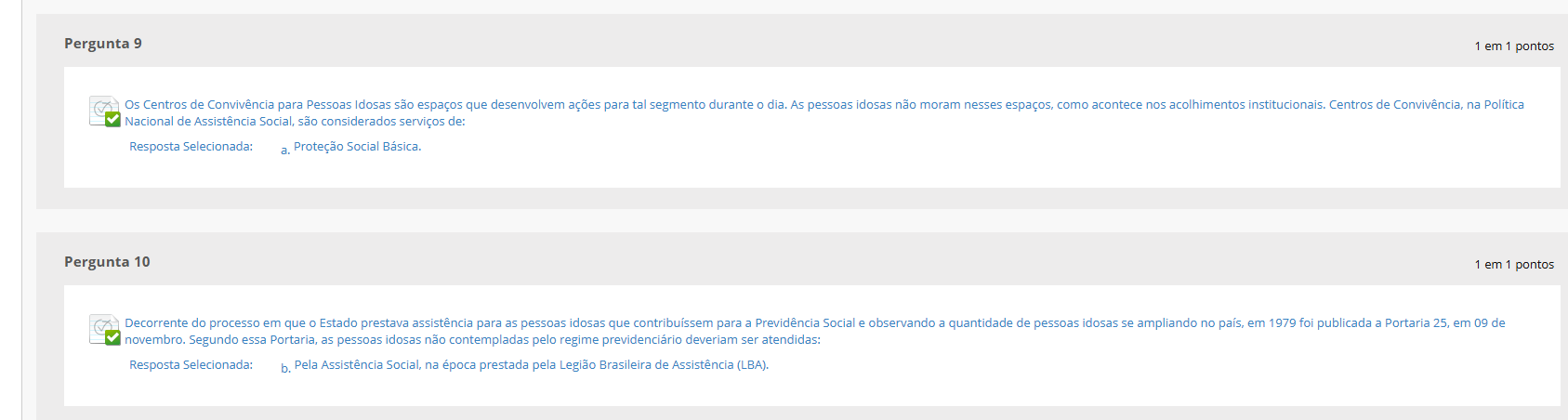 Pergunta 9 1 em 1 pontos Os Centros de Convivência para Pessoas Idosas são espaços que desenvolvem ações para tal segmento durante dia. As pessoas idosas não moram nesses espaços, como acontece nos acolhimentos institucionais. Centros de Convivência, na Política Nacional de Assistência Social, são considerados serviços de: Resposta Selecionada: a. Proteção Social Básica. Pergunta 10 1 em 1 pontos Decorrente do processo em que Estado prestava assistência para as pessoas idosas que para a Previdência Social e observando a quantidade de pessoas idosas se ampliando no em 1979 foi publicada a Portaria 25, em 09 de novembro. Segundo essa Portaria, as pessoas idosas não contempladas pelo regime previdenciário deveriam ser atendidas: Resposta Selecionada: b. Pela Assistência Social, na época prestada pela Legião Brasileira de Assistência (LBA).