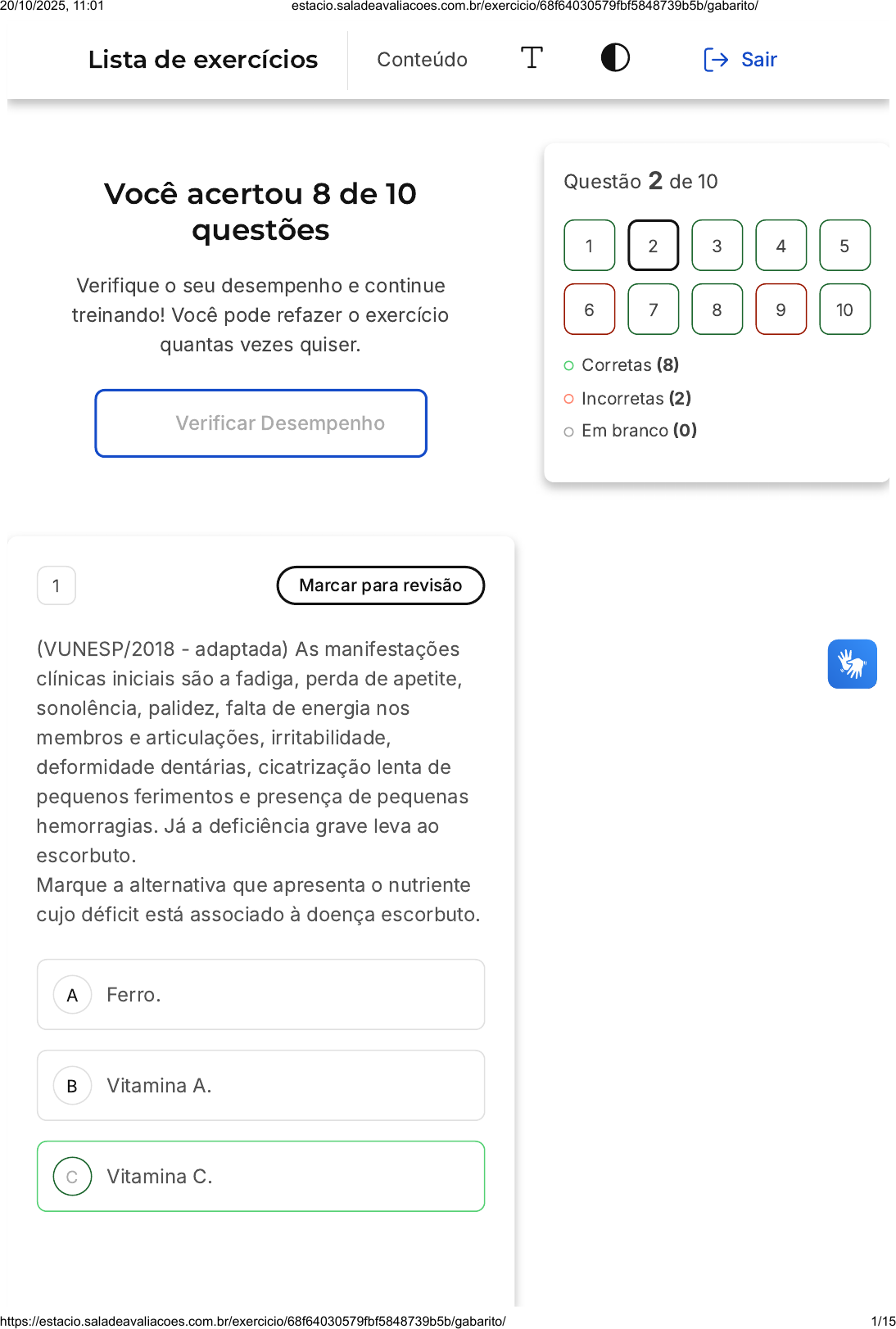 Você acertou 8 de 10 questões Verifique o seu desempenho e continue treinando! Você pode refazer o exercício quantas vezes quiser. Verificar Desempenho A B C 1 Marcar para revisão (VUNESP/2018 - adaptada) As manifestações clínicas iniciais são a fadiga, perda de apetite, sonolência, palidez, falta de energia nos membros e articulações, irritabilidade, deformidade dentárias, cicatrização lenta de pequenos ferimentos e presença de pequenas hemorragias. Já a deficiência grave leva ao escorbuto. Marque a alternativa que apresenta o nutriente cujo déficit está associado à doença escorbuto. Ferro. Vitamina A. Vitamina C. Questão 2 de 10 Corretas (8) Incorretas (2) Em branco (0) 1 2 3 4 5 6 7 8 9 10 Lista de exercícios Conteúdo Sair 20/10/2025, 11:01 estacio.saladeavaliacoes.com.br/exercicio/68f64030579fbf5848739b5b/gabarito/ https://estacio.saladeavaliacoes.com.br/exercicio/68f64030579fbf5848739b5b/gabarito/ 1/15 D E Vitamina B12. Biotina. Resposta correta Parabéns, você selecionou a alternativa correta. Confira o gabarito comentado! Gabarito Comentado O escorbuto é uma doença que foi primeiramente descrita na história como sendo causada por deficiência alimentar. A primeira menção a essa doença ocorreu no século XV, durante o período das expedições marítimas. Observou-se que os tripulantes que passavam longos períodos em alto mar, com uma alimentação pobre em frutas e verduras (ou seja, com déficit de vitamina C), apresentavam sintomas relacionados ao escorbuto. Portanto, a prevenção dessa doença era realizada através do consumo de alimentos frescos, principalmente o limão, que se mostrava mais resistente às longas travessias e às condições de calor, oxidação, armazenamento e processamento. Assim, a alternativa correta é a "C", que aponta a vitamina C como o nutriente cujo déficit está associado à doença escorbuto. 2 Marcar para revisão (ENADE 2004) Os glicídios presentes nos cereais, como o arroz, estão, em sua maior 20/10/2025, 11:01 estacio.saladeavaliacoes.com.br/exercicio/68f64030579fbf5848739b5b/gabarito/ https://estacio.saladeavaliacoes.com.br/exercicio/68f64030579fbf5848739b5b/gabarito/ 2/15 A B C D E parte, na forma de amido. Quando sofre cocção em meio úmido a uma temperatura de 61 a 78oC, o arroz manifesta uma mudança típica, em função do teor de amido que contém. A mudança observada e o nome do processo que a determina, respectivamente, são: Cor caramelo pela dextrinização do amido. Cor leitosa pela decomposição do amido em lactose e glicose. Consistência dura e resistente pela desidratação do amido. Consistência gelatinosa pela gelatinização do amido. Redução de volume pela desidratação do amido. Resposta correta Parabéns, você selecionou a alternativa correta. Confira o gabarito comentado! Gabarito Comentado A alternativa correta é a D, que afirma que o arroz adquire uma consistência gelatinosa devido à gelatinização do amido. Este é um processo que ocorre quando o amido é aquecido em presença de água, levando ao inchamento dos grãos de amido e resultando em uma textura gelatinosa. As demais alternativas estão incorretas: a dextrinização do amido (alternativa A) 20/10/2025, 11:01 estacio.saladeavaliacoes.com.br/exercicio/68f64030579fbf5848739b5b/gabarito/ https://estacio.saladeavaliacoes.com.br/exercicio/68f64030579fbf5848739b5b/gabarito/ 3/15 A B resulta em uma cor caramelo, mas não é o processo que ocorre na cocção do arroz; a decomposição do amido em lactose e glicose (alternativa B) não é um processo que ocorre no arroz e não resulta em uma cor leitosa; a desidratação do amido (alternativas C e E) não ocorre na cocção do arroz e não resulta em uma consistência dura e resistente nem em uma redução de volume. 3 Marcar para revisão (ADM&TEC Prefeitura de Gravatá - 2020 - adaptada) Fibras são polissacarídeos, entre as principais fibras temos a celulose, lignina hemicelulose e pectinas. Sobre as fibras analise as afirmativas a seguir: I. As fibras hidrosolúveis são resistentes à hidrólise por meio de enzimas digestivas do trato intestinal. II. O processo de digestão das fibras se inicia na boca com ação da amilase salivar. III. As fibras alimentares são distinguidas pela sua capacidade de solubilização em água, sendo classificadas em insolúveis e solúveis. O consumo adequado de fibras na alimentação diária tem sido associado ao agravamento de doenças, como câncer de cólon, diverticulite, obesidade, diabetes e dislipidemias. Marque a alternativa que apresenta a(s) afirmativa(s) correta(s). Apenas a afirmativa I está correta. Apenas a afirmativa II está correta. 20/10/2025, 11:01 estacio.saladeavaliacoes.com.br/exercicio/68f64030579fbf5848739b5b/gabarito/ https://estacio.saladeavaliacoes.com.br/exercicio/68f64030579fbf5848739b5b/gabarito/ 4/15 C D E Apenas as afirmativas I e III estão corretas. Apenas as afirmativas II e III estão corretas. Apenas a afirmativa III está correta. Resposta correta Parabéns, você selecionou a alternativa correta. Confira o gabarito comentado! Gabarito Comentado A afirmativa II está incorreta pois o processo de digestão de carboidratos que se inicia na boca com ação da amilase salivar. Fibras não podem ser digeridas pelo organismo humano. A afirmativa III está incorreta pois o consumo adequado de fibras na alimentação não pode ser associado ao agravamento de doenças, como câncer de cólon, diverticulite, obesidade, diabetes e dislipidemias. O consumo de fibras é benéfico ao organismo humano em especial ao trato gastrointestinal, auxiliando na motilidade intestinal, facilitando a mobilização do bolo fecal. 4 Marcar para revisão (2019 - IDHTEC - nutricionista) Assinale a alternativa que indica um polissacarídeo. 20/10/2025, 11:01 estacio.saladeavaliacoes.com.br/exercicio/68f64030579fbf5848739b5b/gabarito/ https://estacio.saladeavaliacoes.com.br/exercicio/68f64030579fbf5848739b5b/gabarito/ 5/1