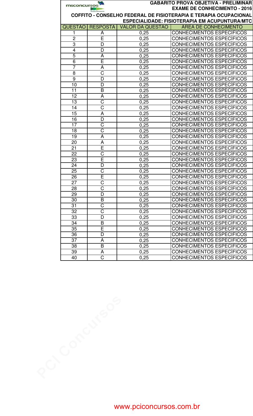 pcimarkpci MjgwNDo4YjljOmNhZjg6YWZjMDpjNTMwOmY2MWM6ZWM0ZTpiYWZj:V2VkLCAwMSBPY3QgMjAyNSAxNzo0MjozOCAtMDMwMA== www.pciconcursos.com.br QUESTÃO RESPOSTA VALOR DA QUESTÃO ÁREA DE CONHECIMENTO 1 A 0,25 CONHECIMENTOS ESPECÍFICOS 2 E 0,25 CONHECIMENTOS ESPECÍFICOS 3 D 0,25 CONHECIMENTOS ESPECÍFICOS 4 D 0,25 CONHECIMENTOS ESPECÍFICOS 5 A 0,25 CONHECIMENTOS ESPECÍFICOS 6 E 0,25 CONHECIMENTOS ESPECÍFICOS 7 A 0,25 CONHECIMENTOS ESPECÍFICOS 8 C 0,25 CONHECIMENTOS ESPECÍFICOS 9 D 0,25 CONHECIMENTOS ESPECÍFICOS 10 D 0,25 CONHECIMENTOS ESPECÍFICOS 11 B 0,25 CONHECIMENTOS ESPECÍFICOS 12 A 0,25 CONHECIMENTOS ESPECÍFICOS 13 C 0,25 CONHECIMENTOS ESPECÍFICOS 14 C 0,25 CONHECIMENTOS ESPECÍFICOS 15 A 0,25 CONHECIMENTOS ESPECÍFICOS 16 D 0,25 CONHECIMENTOS ESPECÍFICOS 17 C 0,25 CONHECIMENTOS ESPECÍFICOS 18 C 0,25 CONHECIMENTOS ESPECÍFICOS 19 A 0,25 CONHECIMENTOS ESPECÍFICOS 20 A 0,25 CONHECIMENTOS ESPECÍFICOS 21 E 0,25 CONHECIMENTOS ESPECÍFICOS 22 C 0,25 CONHECIMENTOS ESPECÍFICOS 23 E 0,25 CONHECIMENTOS ESPECÍFICOS 24 D 0,25 CONHECIMENTOS ESPECÍFICOS 25 C 0,25 CONHECIMENTOS ESPECÍFICOS 26 E 0,25 CONHECIMENTOS ESPECÍFICOS 27 C 0,25 CONHECIMENTOS ESPECÍFICOS 28 C 0,25 CONHECIMENTOS ESPECÍFICOS 29 D 0,25 CONHECIMENTOS ESPECÍFICOS 30 B 0,25 CONHECIMENTOS ESPECÍFICOS GABARITO PROVA OBJETIVA - PRELIMINAR COFFITO - CONSELHO FEDERAL DE FISIOTERAPIA E TERAPIA OCUPACIONAL ESPECIALIDADE: FISIOTERAPIA EM ACUPUNTURA/MTC EXAME DE CONHECIMENTO - 2016 30 B 0,25 CONHECIMENTOS ESPECÍFICOS 31 C 0,25 CONHECIMENTOS ESPECÍFICOS 32 C 0,25 CONHECIMENTOS ESPECÍFICOS 33 D 0,25 CONHECIMENTOS ESPECÍFICOS 34 B 0,25 CONHECIMENTOS ESPECÍFICOS 35 E 0,25 CONHECIMENTOS ESPECÍFICOS 36 D 0,25 CONHECIMENTOS ESPECÍFICOS 37 A 0,25 CONHECIMENTOS ESPECÍFICOS 38 B 0,25 CONHECIMENTOS ESPECÍFICOS 39 A 0,25 CONHECIMENTOS ESPECÍFICOS 40 C 0,25 CONHECIMENTOS ESPECÍFICOS www.pciconcursos.com.br pcimarkpci MjgwNDo4YjljOmNhZjg6YWZjMDpjNTMwOmY2MWM6ZWM0ZTpiYWZj:V2VkLCAwMSBPY3QgMjAyNSAxNzo0MjozOCAtMDMwMA== www.pciconcursos.com.br QUESTÃO RESPOSTA VALOR DA QUESTÃO ÁREA DE CONHECIMENTO 1 C 0,25 CONHECIMENTOS ESPECÍFICOS 2 B 0,25 CONHECIMENTOS ESPECÍFICOS 3 E 0,25 CONHECIMENTOS ESPECÍFICOS 4 E 0,25 CONHECIMENTOS ESPECÍFICOS 5 D 0,25 CONHECIMENTOS ESPECÍFICOS 6 A 0,25 CONHECIMENTOS ESPECÍFICOS 7 D 0,25 CONHECIMENTOS ESPECÍFICOS 8 B 0,25 CONHECIMENTOS ESPECÍFICOS 9 C 0,25 CONHECIMENTOS ESPECÍFICOS 10 A 0,25 CONHECIMENTOS ESPECÍFICOS 11 D 0,25 CONHECIMENTOS ESPECÍFICOS 12 B 0,25 CONHECIMENTOS ESPECÍFICOS 13 D 0,25 CONHECIMENTOS ESPECÍFICOS 14 C 0,25 CONHECIMENTOS ESPECÍFICOS 15 D 0,25 CONHECIMENTOS ESPECÍFICOS 16 B 0,25 CONHECIMENTOS ESPECÍFICOS 17 E 0,25 CONHECIMENTOS ESPECÍFICOS 18 E 0,25 CONHECIMENTOS ESPECÍFICOS 19 C 0,25 CONHECIMENTOS ESPECÍFICOS 20 A 0,25 CONHECIMENTOS ESPECÍFICOS 21 A 0,25 CONHECIMENTOS ESPECÍFICOS 22 D 0,25 CONHECIMENTOS ESPECÍFICOS 23 E 0,25 CONHECIMENTOS ESPECÍFICOS 24 C 0,25 CONHECIMENTOS ESPECÍFICOS 25 B 0,25 CONHECIMENTOS ESPECÍFICOS 26 E 0,25 CONHECIMENTOS ESPECÍFICOS 27 A 0,25 CONHECIMENTOS ESPECÍFICOS 28 C 0,25 CONHECIMENTOS ESPECÍFICOS 29 A 0,25 CONHECIMENTOS ESPECÍFICOS 30 D 0,25 CONHECIMENTOS ESPECÍFICOS GABARITO PROVA OBJETIVA - PRELIMINAR COFFITO - CONSELHO FEDERAL DE FISIOTERAPIA E TERAPIA OCUPACIONAL ESPECIALIDADE: FISIOTERAPIA EM TERAPIA INTENSIVA - ADULTO EXAME DE CONHECIMENTO - 2016 30 D 0,25 CONHECIMENTOS ESPECÍFICOS 31 C 0,25 CONHECIMENTOS ESPECÍFICOS 32 D 0,25 CONHECIMENTOS ESPECÍFICOS 33 D 0,25 CONHECIMENTOS ESPECÍFICOS 34 A 0,25 CONHECIMENTOS ESPECÍFICOS 35 B 0,25 CONHECIMENTOS ESPECÍFICOS 36 C 0,25 CONHECIMENTOS ESPECÍFICOS 37 E 0,25 CONHECIMENTOS ESPECÍFICOS 38 B 0,25 CONHECIMENTOS ESPECÍFICOS 39 E 0,25 CONHECIMENTOS ESPECÍFICOS 40 A 0,25 CONHECIMENTOS ESPECÍFICOS www.pciconcursos.com.br pcimarkpci MjgwNDo4YjljOmNhZjg6YWZjMDpjNTMwOmY2MWM6ZWM0ZTpiYWZj:V2VkLCAwMSBPY3QgMjAyNSAxNzo0MjozOCAtMDMwMA== www.pciconcursos.com.br NEONATOLOGIA E PEDIATRIA QUESTÃO RESPOSTA VALOR DA QUESTÃO ÁREA DE CONHECIMENTO 1 D 0,25 CONHECIMENTOS ESPECÍFICOS 2 E 0,25 CONHECIMENTOS ESPECÍFICOS 3 B 0,25 CONHECIMENTOS ESPECÍFICOS 4 A 0,25 CONHECIMENTOS ESPECÍFICOS 5 D 0,25 CONHECIMENTOS ESPECÍFICOS 6 E 0,25 CONHECIMENTOS ESPECÍFICOS 7 D 0,25 CONHECIMENTOS ESPECÍFICOS 8 A 0,25 CONHECIMENTOS ESPECÍFICOS 9 B 0,25 CONHECIMENTOS ESPECÍFICOS 10 D 0,25 CONHECIMENTOS ESPECÍFICOS 11 E 0,25 CONHECIMENTOS ESPECÍFICOS 12 D 0,25 CONHECIMENTOS ESPECÍFICOS 13 E 0,25 CONHECIMENTOS ESPECÍFICOS 14 D 0,25 CONHECIMENTOS ESPECÍFICOS 15 C 0,25 CONHECIMENTOS ESPECÍFICOS 16 E 0,25 CONHECIMENTOS ESPECÍFICOS 17 E 0,25 CONHECIMENTOS ESPECÍFICOS 18 B 0,25 CONHECIMENTOS ESPECÍFICOS 19 B 0,25 CONHECIMENTOS ESPECÍFICOS 20 A 0,25 CONHECIMENTOS ESPECÍFICOS 21 A 0,25 CONHECIMENTOS ESPECÍFICOS 22 A 0,25 CONHECIMENTOS ESPECÍFICOS 23 A 0,25 CONHECIMENTOS ESPECÍFICOS 24 A 0,25 CONHECIMENTOS ESPECÍFICOS 25 A 0,25 CONHECIMENTOS ESPECÍFICOS 26 A 0,25 CONHECIMENTOS ESPECÍFICOS 27 A 0,25 CONHECIMENTOS ESPECÍFICOS 28 A 0,25 CONHECIMENTOS ESPECÍFICOS 29 A 0,25 CONHECIMENTOS ESPECÍFICOS GABARITO PROVA OBJETIVA - PRELIMINAR COFFITO - CONSELHO FEDERAL DE FISIOTERAPIA E TERAPIA OCUPACIONAL ESPECIALIDADE: FISIOTERAPIA EM TERAPIA INTENSIVA - EXAME DE CONHECIMENTO - 2016 29 A 0,25 CONHECIMENTOS ESPECÍFICOS 30 A 0,25 CONHECIMENTOS ESPECÍFICOS 31 A 0,25 CONHECIMENTOS ESPECÍFICOS 32 B 0,25 CONHECIMENTOS ESPECÍFICOS 33 A 0,25 CONHECIMENTOS ESPECÍFICOS 34 C 0,25 CONHECIMENTOS ESPECÍFICOS 35 E 0,25 CONHECIMENTOS ESPECÍFICOS 36 B 0,25 CONHECIMENTOS ESPECÍFICOS 37 B 0,25 CONHECIMENTOS ESPECÍFICOS 38 B 0,25 CONHECIMENTOS ESPECÍFICOS 39 D 0,25 CONHECIMENTOS ESPECÍFICOS 40 A 0,25 CONHECIMENTOS ESPECÍFICOS www.pciconcursos.com.br pcimarkpci MjgwNDo4YjljOmNhZjg6YWZjMDpjNTMwOmY2MWM6ZWM0ZTpiYWZj:V2VkLCAwMSBPY3QgMjAyNSAxNzo0MjozOCAtMDMwMA== www.pciconcursos.com.br QUESTÃO RESPOSTA VALOR DA QUESTÃO ÁREA DE CONHECIMENTO 1 A 0,25 CONHECIMENTOS ESPECÍFICOS 2 B 0,25 CONHECIMENTOS ESPECÍF