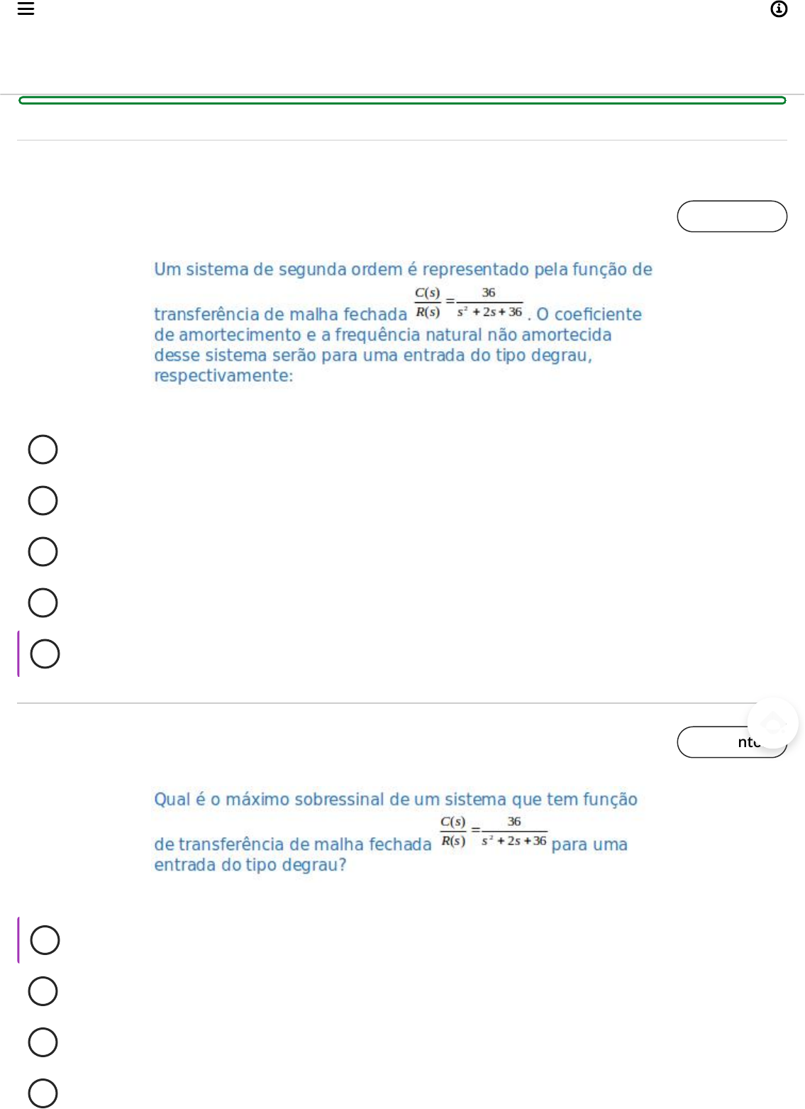 Teste Atividade de Sistematização – Unidade V 0 DE 4 QUESTÕES RESTANTES Conteúdo do teste Pergunta 1 0,2 Pontos A 0,166 rad/s e 6. B 36 rad/s e 6; C 6 rad/s e 36; D 6 rad/s e 0,166; E 0,166 e 6 rad/s; Pergunta 2 0,2 Pontos A 59% B 70% C 16,6% D 35% E 60% Pergunta 3 0,2 Pontos A O sistema é dito subamortecido; B A resposta transitória não decai; C O sistema é superamortecido; D O sistema não é decai acentuadamente; E A sistema é dito criticamente amortecido; Pergunta 4 0,2 Pontos A 2,85 s B 4,25 s C 5,71 s D 10,0 s E 3,75 s Salvo pela última vez 11:42:09 Salvar e fechar Enviar Filtro de questões (4)