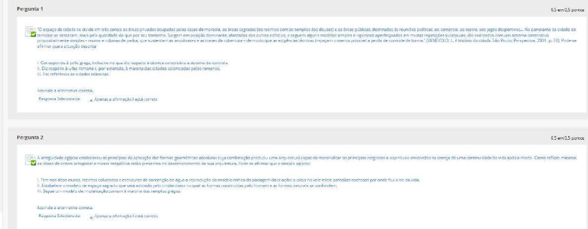 Pergunta 1 0,5 em 0,5 pontos espaço da cidade se divide em três as áreas privadas ocupadas pelas casas de as áreas sagradas (os recintos com os templos dos deuses) e as áreas públicas, destinadas às reuniões ao DO aos jogos desportivos... No panorama da cidade os templos mais qualidade do que por seu Surgem posição dos outros seguem alguns modelos simples em muitas são com um construtivo propositalmente simples muros de que sustentam as as traves de cobertura de que as exigências técnicas impeçam menos perde de controle de LA história São 2001 P. 78). Pode-se afirmar que a situação descrita Corresponde grega, inclusive no que diz à técnica e sistema de controle Diz à urbe romana e por a das cidades colonizadas pelos Faz referência adades correta. Resposta Apenas a afirmação correta Pergunta 2 0,5 em 0,5 pontos A antiguidade estabeleceu da aplicação das formas geométricas absolutas cuja combinação produziu uma arquitetura capaz de materializar religiosos e envolvidos na crença de uma continuidade vida após a morte Como ideias de ordem e massa megalitica estão presentes no de sua Pode se afirmar que Tem nos alsos recintos colunados estruturas de contenção de agua reprodução do modelo do paisagem 0 no vale entre rochosos por onde flui no da vida Estabelece modelo de segrado que será pelo cristienismo no qual formas pelo homem e as formas naturals se Segue um modelo de implantação comum maloria dos templos gregos Assinale a alternativa Resposta a. Apenas a afirmação estáPergunta 3 em pontos A antiguidade principios aplicação formas geométricas no Pode se que: LA criou tecnologia do de A se fundamentava em elxos cujas referências eram direção do Nilo (elxo Norte-Sul) caminho do sol A utilizava 0 sistema estrutural Assinale a alternativa Resposta d. Apenas as III estão Pergunta 4 0,5 0,5 pontos A organização política grega ligada à estrutura da que na concepção de um pequena suficiente para todos falarem e serem ouvidos e grande para entrar em guerra com as pólis Pode se afirmar 1.0 desenvolvimento da cúpula permitiu a estruturação da pólis em da basilica que se tornou 0 seu centro. 11. A vida politica materialização no um que como 0 centro civil Ds edifícios se longo das que ligavam diferentes mostrando as limitações de filosofia Assinale a alternativa correta Resposta Apenas estáPergunta 5 0,5 em 0,5 Na cultura cada modalidade regras e valor de cada obra consiste na beleza harmonia com que obedecem essas regras Na e na essa denominada No caso da são as Sobre elas possível afirmar que: Implicam diferentes tipos de capitel e espaçamento entre colunas utilizados construção de code Constituem sistema de que garante a manutenção da linguagem clássica de São todos 05 de que constituem a referência da arquitetura clássica Assinale a Resposta b. afirmações estão Pergunta 6 0,5 em 0,5 Império era fundado sendo que as relações entre e implicavam em ajustamentos, conflitos, A identidade um discurso em locals Os espaços reinterpretações dos costumes locals conquista romana deuses locals que não eram mas deuses romanos e reinterpretados). havia cidades romanas de fala grega, entre outras, e não havia conquistadas pelo Império nos modos de sepultamento de construção de habitações No adades de fundação um esquema quase que Implantação em terreno elevado por questões de distribuição das edificações em configuração irregular e de modo a confundir qualquer exército invasor com uma central que servia como sede e urbano com principais implantados no cruzamento de dois (cardo e habitações quadras regulares muralha Divisão do urbano em dois diferentes sendo que as principais parte mais alta demais se de forms irregular dentro de um sistema de de Assinale Selecionada Apenas a afirmaçãoPergunta 7 0,5 em 0,5 sistema de controle de arquitetura está diretamente com aplicação equilibrade justa de três fatores que constituem a triade Desse modo, pode-se afirmar que: Uma obra com no resulta uma de tendência H. Uma na a utilização do sistema de estrutura arquitravada. III. Uma acentuação no venustas indica edificios relacionados à função Assinale a alternativa Apenas está Pergunta 8 0,5 em 0,5 pontos Uma forma de habitação aparece por do século IV a.C. e consiste em construções de vários pavimentos com unidades voltadas para 0 exterior com Janelas e andares térreos são destinados lojas habitações de melhor qualidade (com acesso a os andares superiores são divididos unidades de vários tomanhos para menos descrição que eram implantadas em corno na polis 11. basilicas que ocupavam os locais mais altos urbe. III. As que ocupavam das cidades Assinale alternative Resposta Selecionada: B Apenas afirmação estoPergunta 9 0,5 pontos quando se em a referência to A propunha proporções conforme onundos do pensamento mas cm seu sofreu nos modos de articulação = flexibilização des formas Podese que estilo Colunas Sistema estrutural arquitravado. Assinale Resposta b. Apenas os itens estão corretos Pergunta 10 0,5 em pontos são as casas tipicas das cidades com ou fechadas na parte e abertas para as compreendem de de destinação do do são as mais ricas, que por um terreno LA história do São Paulo: 2001. Pode-se afirmar que a Corresponde especificamente no que diz respeito as formas de Descreve as domus romanas em suas principals habitação do cidade configuração Resposta Apenas afirmação está