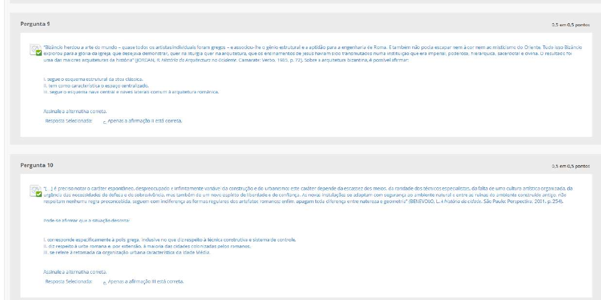 Pergunta 9 em 0,5 pontos herdou a arte do mundo quase todos os artistas individuals foram gregos associou-lhe gênio estrutural ea aptidão para a engenharia de E também não podia escapar nem à cor nem ao misticismo do Oriente Tudo isso Bizâncio explorou para a glória da que desejava demonstrar, quer na liturgia quer na arquitetura, que os ensinamentos de haviam sido transmutados numa instituição que era sacerdotal e resultado foi uma das arquiteturas da (JORDAN, R. História Arquitectura no 72). Sobre a arquitetura é segue esquema estrutural da stoa clássica. tem como característica espaço segue esquema central e naves laterais comum à arquitetura Assinale a alternativa Resposta Apenas a afirmação está correta. Pergunta 10 0,5 em 0,5 pontos preciso notar caráter despreocupado e variável da construção e do urbanismo: este caráter depende da escassez dos da dos técnicos especialistas. da falta de uma cultura organizada. da urgência das necessidades de defesa e de mas também de um novo de liberdade e de As novas instalações se adaptam com segurança ao ambiente natural e entre as do ambiente construído não respeitam nenhuma regra seguem com indiferença as formas regulares dos artefatos apagam toda diferença entre natureza e LA históna cidade. São Paulo: 2001. 254). Pode se afirmar que a situação corresponde especificamente à polis inclusive no que diz respeito à técnica construtiva e sistema de controle. diz respeito urbe romana por à maioria das cidades colonizadas pelos se refere retomada da organização urbana caracteristica da Assinale a alternativa Resposta Apenas a afirmação III está correta.Pergunta 6 0,5 am pontos que Românico 4 a do por uma unidade que para da por toda afirmar sistema estrutural adoção de solução pera coberture presença de contrafortes alternative As III Pergunta 7 05 em 0.5 depende do campo para um ou menos da cidade não concede paridade dos uma suas a nacional ou mas sua restritos população (BENEVOLO, LA do Paulo: 2001: configuração das cidade Apenas esta 8 0.5 em as pontos regularidade em grande cidades e não existe menos administração municipal As de veres cobertas que des mat não permitem de as comerciantes não são agrupadas em uma em uma ou formando (BENEVOLO L A do São 2001 226) refere a inclusive no técnica sistema configuração da cidade organização urbana característica da alternation3 0.5 Além = de de - de não do rigidamente de transição pode-se As dimensões das que um simbólico de humans 1.0 papel da per meio des nas 0 predominio a alternativa correts Resposta Apenas a está Pergunta 4 em XI no Orience a no as soluções como referência as abobadadas com de dos antigos do Pode que DO histórico social de materials um sistema estrutural de construção comprovada da construtives que de poder alternative As estão Pergunta 5 0.5 0.5 maior grejas cristão ongem no se escala cristão para do plants e como um Pode = que cristão central espaço Assinate AsPergunta 1 0,5 em 0,5 pontos A Escolástica (do lotim isto "pertencente nasceu nos mosteiros posteriormente universidades medievais como parte do do século Bucidar a teologia com auxilio sem prejuizo do cristã implicava a apreensão dos conhecimentos referentes as artes liberais retórica quadrivium música) por estudo Sagradas Escrituras de textos e As ligações entre a góticas estão apogeu de que capaz de produzir uma nova arquicetura a partir do do arco. 11. ao da sociedade que as condições necessárias para a construção das grandes catedrais à abertura ao conheamento não exclusivamente religioso, que provocou desenvolvimento do cálculo estrutural como fator importante para a transformação da arquitetura da Baixa Idade Assinale elternativa Apenas a afirmação está Pergunta 2 0,5 em 0,5 A necessidade de desenvolver soluções acother É correto afirmer A de San Vitale (em Ravena) segue 0 tipo basilica presente durante code a Alta Idade 11. de Santa Constanza Roma) segue G esquema de circular e cúpula presente A orquiteture em Ravena e apresentam espaço centralizado coberto por cúpulo como Assinale a Resposta Selecionada As afirmações e III estãoPergunta 7 0,5 em 0,5 sistema de controle de arquitetura está diretamente com aplicação equilibrade justa de três fatores que constituem a triade Desse modo, pode-se afirmar que: Uma obra com no resulta uma de tendência H. Uma na a utilização do sistema de estrutura arquitravada. III. Uma acentuação no venustas indica edificios relacionados à função Assinale a alternativa Apenas está Pergunta 8 0,5 em 0,5 pontos Uma forma de habitação aparece por do século IV a.C. e consiste em construções de vários pavimentos com unidades voltadas para 0 exterior com Janelas e andares térreos são destinados lojas habitações de melhor qualidade (com acesso a os andares superiores são divididos unidades de vários tomanhos para menos descrição que eram implantadas em corno na polis 11. basilicas que ocupavam os locais mais altos urbe. III. As que ocupavam das cidades Assinale alternative Resposta Selecionada: B Apenas afirmação esto