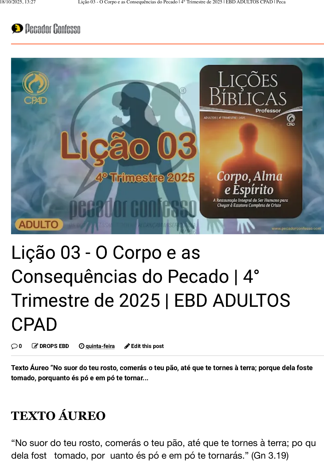 18/10/2025, 13:27 Lição 03 - O Corpo e as Consequências do Pecado | 4° Trimestre de 2025 | EBD ADULTOS CPAD | Pecador Confesso