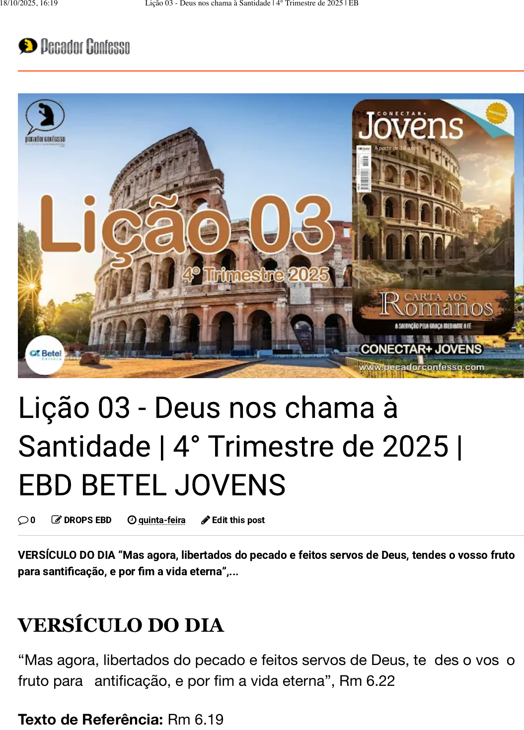 Lição 03 - Deus nos chama à Santidade | 4° Trimestre de 2025 | EBD BETEL JOVENS 0 DROPS EBD quinta-feira Edit this post VERSÍCULO DO DIA “Mas agora, libertados do pecado e feitos servos de Deus, tendes o vosso fruto para santificação, e por fim a vida eterna”,... VERSÍCULO DO DIA “Mas agora, libertados do pecado e feitos servos de Deus, tendes o vosso fruto para santificação, e por fim a vida eterna”, Rm 6.22 Texto de Referência: Rm 6.19 18/10/2025, 16:19 Lição 03 - Deus nos chama à Santidade | 4° Trimestre de 2025 | EBD BETEL JOVENS | Pecador Confesso https://www.pecadorconfesso.com/2025/10/licao-03-deus-nos-chama-santidade-4.html 1/19 https://www.blogger.com/profile/10212213761090847691 https://www.pecadorconfesso.com/2025/10/licao-03-deus-nos-chama-santidade-4.html https://www.blogger.com/post-edit.g?blogID=4561833377599058991&postID=8150543367866333456&from=pencil https://www.pecadorconfesso.com/ https://www.pecadorconfesso.com/ Comentário de Hubner Braz COMENTARIO EXTRA Romanos 6:22 apresenta uma transição teológica significativa na carta de Paulo aos Romanos, destacando a libertação do pecado e a subsequente santificação que conduz à vida eterna. Este versículo sintetiza a transformação operada pela graça divina na vida do crente, que, ao ser libertado do domínio do pecado, torna-se servo de Deus, produzindo frutos que resultam em santificação e culminam na vida eterna. 📜 Análise Exegética e Teológica Texto Original (Romanos 6:22): "Mas agora, libertados do pecado, e feitos servos de Deus, tendes o vosso fruto para santificação, e por fim a vida eterna." Palavras-chave no grego koiné: Λυθέντες (lythentes): Particípio aoristo passivo de "λύω" (lýō), significando "libertados" ou "desligados". Indica uma ação completa e definitiva. Δούλοι (dúloi): Substantivo plural de "δοῦλος" (doulos), significando "escravos" ou "servos". Refere-se a uma nova condição de servidão, agora dedicada a Deus. Ἀκαρπίαν (akarpian): Substantivo feminino, significando "fruto" ou "resultado". Neste contexto, refere-se aos frutos espirituais produzidos pela vida em santidade. Ἁγιασμὸν (hagiasmón): Substantivo masculino, significando "santificação". Refere-se ao processo contínuo de separação para Deus e transformação moral. Ζωὴν αἰώνιον (zōēn aiōnion): Frase que significa "vida eterna". Refere-se à qualidade de vida que começa no presente e se estende para a eternidade, caracterizada pela comunhão com Deus. 📚 Comentário Teológico A libertação do pecado não implica em uma erradicação instantânea da presença do pecado na vida do crente, mas sim na quebra do seu domínio e poder. A partir dessa libertação, o crente é capacitado a viver uma nova vida, marcada pela obediência a Deus. Essa obediência resulta na produção de frutos espirituais que conduzem à santificação, um processo contínuo de transformação à semelhança de Cristo, e culmina na vida eterna, que é tanto uma qualidade de vida no presente quanto uma promessa futura de comunhão plena com Deus. Comentadores como David Brown destacam que o "fruto para santificação" refere-se ao caráter e à conduta moral do crente, que, ao se submeter à vontade de Deus, experimenta uma transformação interna que se reflete em ações externas. Essa transformação é evidência da ação do Espírito Santo na vida do crente, que o capacita a viver de acordo com os padrões divinos. 🧭 Aplicação Pessoal Para o cristão contemporâneo, Romanos 6:22 oferece uma reflexão profunda sobre a identidade em Cristo e a responsabilidade que dela decorre. A libertação do pecado não é apenas uma mudança de status, mas um chamado para viver de maneira que reflita a santidade de Deus. Isso implica em escolhas diárias que busquem agradar a Deus, afastando-se das práticas que antes dominavam a vida e abraçando uma nova vida de serviço e obediência. A promessa da vida eterna não se limita a uma expectativa futura, mas é uma realidade presente que se manifesta na comunhão contínua com Deus e na transformação progressiva do caráter do crente. Portanto, viver de acordo com os princípios estabelecidos em Romanos 6:22 é testemunhar da obra redentora de Cristo no presente e antecipar a plenitude dessa obra na eternidade. 📊 Tabela Expositiva Aspecto Descrição Libertação do pecado Quebra do domínio do pecado na vida do crente. Servidão a Deus Compromisso voluntário de viver em obediência a Deus. Fruto para santificação Produção de frutos espirituais que refletem a transformação interna. Vida eterna Comunhão contínua com Deus, iniciada no presente e consumada na eternidade. Em resumo, Romanos 6:22 destaca a transformação radical operada pela graça de Deus na vida do crente, que, ao ser libertado do pecado, torna-se servo de Deus, produzindo frutos que conduzem à santificação e culminam na vida eterna. Essa passagem serve como um chamado para viver de maneira que reflita essa transformação, buscando agradar a Deus em todas as áreas da vida. 18/10/2025, 16:19 Lição 03 - Deus nos chama à Santidade | 4° Trimestre de 2025 | EBD BETEL JOVENS | Pecador Confesso https://www.pecadorconfesso.com/2025/10/licao-03-deus-nos-chama-santidade-4.html 2/19 OBJETIVOS DA LIÇÃO Compreender que a santificação é um processo progressivo; Ressaltar que é o Espírito Santo que nos santifica, Saber que o Senhor nos chama à santificação. VERDADE APLICADA Ao sermos libertos do domínio do pecado por meio de Cristo, devemos viver como servos de Deus, em santificação, para alcançar a Vida Eterna. Este blog foi feito com muito carinho 💝 para você. Ajude-nos 🙏 Envie uma oferta pelo Pix/e-mail: pecadorconfesso@hotmail.com de qualquer valor e você estará colaborando para que esse blog continue trazendo conteúdo exclusivo e de edificação para a sua vida. CLIQUE NA IMAGEM E CONFIRA AS REVISTAS EM PDF 