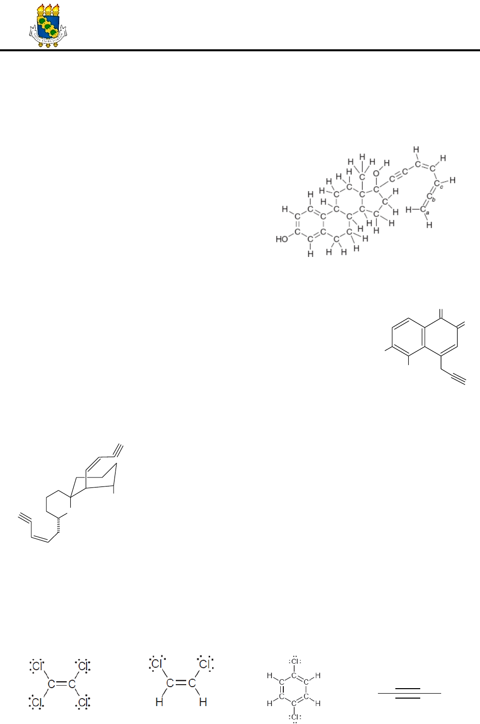 Universidade Federal do Ceará Departamento de Q. Orgânica e Inorgânica Disciplina: CE0802 Química Orgânica I – Prof.: Geraldo Barbosa 1ª LISTA DE EXERCÍCIOS COMPLEMENTARES 1- Considerando-se todos os isômeros constitucionais (ou estruturais) possíveis, mostre as fórmulas estruturais de linhas para os compostos de FM C4H10O e C4H8O; C5H10O e C5H8O. 2- O composto mostrado abaixo é um derivado do estradiol, que apresenta potencial anticancerígeno. Com relação a este composto, mostre a estrutura em linhas e responda os itens abaixo. a) Determine o estado de hibridização de Ca, Cb e Cc. b) Determine o ângulo de ligação H—Ca—Cb. c) Determine o ângulo de ligação Ca—Cb—Cc. 3- O composto abaixo pode ser utilizado como um dos precursores sintéticos na síntese da morfina. Com relação a este composto responda os itens abaixo. a) Qual o número de carbonos sp3, sp2 e sp presentes? b) Qual o número de oxigênios sp3 e sp2 presentes? c) Qual o número de ligações σ e existentes na molécula? d) Qual o estado de hibridização do átomo de nitrogênio presente? e) Qual a geometria dos carbonos assinalados pelas letras a, b e c? O O H3CO OCH3 N a b c 4- A histrionicotoxina, cuja fórmula estrutural é mostrada abaixo, é uma toxina de sapos usada para envenenar flechas indígenas. Com relação à estrutura mostrada, sabe-se que ela apresenta erros. Desta forma, represente a estrutura corrigindo os erros e responda os itens a seguir. a) Qual a fórmula molecular da histrionicotoxina? b) Qual o número de carbonos sp3, sp2 e sp presentes? c) Quais os estados de hibridização dos átomos de oxigênio e nitrogênio presentes? 5- Proponha a fórmula estrutural de linhas para um composto hipotético que apresente um anel aromático heterocíclico com 1 N sp2 e 3 ligações . Além disso, o composto deve apresentar: 1 O sp2; 1 O sp3; 1 C sp3; 6 C sp2 e 2 C sp. 6- Dadas as estruturas abaixo, faça uma análise dos vetores de polaridade e classifique os compostos em polar ou apolar. BrBr: : : : : : NH OH Histrionicotoxina 7- Dados experimentais de cinética reacional revelam que o cátion 1-metil-1-feniletila é mais estável que o cátion terc-butila. Justifique esta diferença de estabilidade com base nos efeitos eletrônicos. C + CH3 CH3 CH3 C + CH3 CH3 Cátion terc-butila Cátion 1-metil-1-feniletila 8- Determine se a relação entre as estruturas abaixo é de duas estruturas de ressonância ou de dois isômeros constitucionais. 9- Mostre todas as estruturas de ressonância possíveis para as espécies químicas abaixo. + a) b) . c) O O :_ d) e) f) 10- O sal orgânico abaixo, que é gerado a partir do ácido esquárico, apresenta ligações C-C e C- O com o mesmo comprimento médio. Utilize estruturas de ressonância para justificar esta evidência experimental. O O O - O - : : :: :: : : : : 11- Classifique os substituintes -NO2, -OCH3 e –OH com relação aos efeitos (indutivos e mesoméricos) doadores ou retiradores de elétrons. O2N OCH3 a) O2N OH b) 12- As antocianidinas são pigmentos naturais altamente conjugados, encontrados em flores roxas e avermelhadas. Dada a estrutura da antocianidina abaixo, mostre 5 estruturas de ressonância que contribuiriam para a dispersão da carga positiva na molécula. O + OH 13- Classifique as espécies químicas abaixo como: aromática, antiaromática ou não aromática. Justifique sua resposta. + a) b) N N : : _: c) d) + NH : azonina e) f) 14- A figura abaixo mostra uma movimentação eletrônica que não é possível para o composto piridina. Justifique este fato. 15- É observado que o composto abaixo apresenta um significativo momento dipolar. Utilizando seus conhecimentos de aromaticidade, justifique essa evidência experimental. 16- A remoção de um próton do composto abaixo é bastante favorecida e leva à formação de uma espécie iônica conforme mostrado abaixo. Justifique o porquê deste fato. 17- Associe corretamente os valores dos pontos de ebulição (p.e.) 58, 69, 76, 117 e 164 oC com os compostos A-E abaixo. Justifique sua resposta. H O A B OH O C OH D E 18- Dadas as aminas abaixo, relacione corretamente o p.e. 65, 84 e 97 oC, com a respectiva estrutura. Justifique. I II III 19- Metanol e etanol são miscíveis em água em todas as proporções. Do ponto de vista molecular isto pode ser justificado, através das ligações de hidrogênio entre as moléculas destas substâncias. Mostre as ligações de hidrogênio para cada caso. 20- A vitamina C e a vitamina A, cujas, estruturas são mostradas abaixo apresentam solubilidades completamente distintas em água. Discuta este fato. O OH OH O OHOH Ác. ascórbico ou vitamina C Retinol ou Vitamina A OH NH CH3 NH2 N CH3
