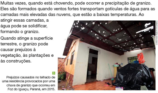 Muitas vezes, quando está chovendo, pode ocorrer a precipitação de granizo. Eles são formados quando ventos fortes transportam gotículas de água para as camadas mais elevadas das nuvens, que estão a baixas temperaturas. Ao atingir essas camadas, a água pode se solidificar, formando O granizo. Quando atinge a superfície CHRISTIAN terrestre, O granizo pode causar prejuízos à vegetação, às plantações e às construções. Prejuízos causados no telhado de uma residencia provocados por uma chuva de granizo que ocorreu em Foz do Parana, em 2015.