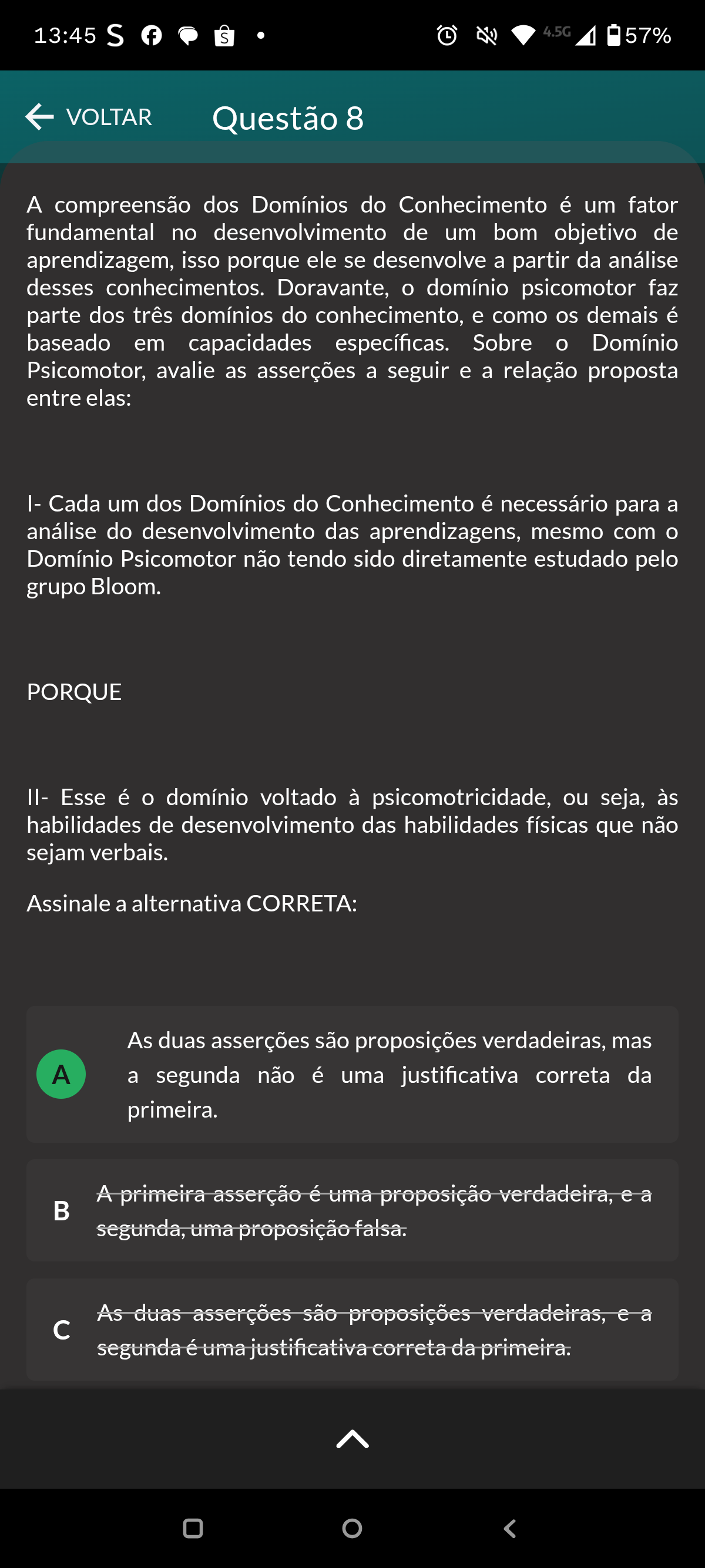 13:45 S f S L 4.5G 57% VOLTAR Questão 8 compreensão dos Domínios do Conhecimento é um fator fundamental no desenvolvimento de um bom objetivo de aprendizagem, isso porque ele se desenvolve a partir da análise desses conhecimentos. Doravante, domínio psicomotor faz parte dos três domínios do conhecimento, e como os demais é baseado em capacidades específicas. Sobre Domínio Psicomotor, avalie as asserções a seguir e a relação proposta entre elas: I- Cada um dos Domínios do Conhecimento é necessário para análise do desenvolvimento das aprendizagens, mesmo com Domínio Psicomotor não tendo sido diretamente estudado pelo grupo Bloom. PORQUE II- Esse é domínio voltado à psicomotricidade, ou seja, às habilidades de desenvolvimento das habilidades físicas que não sejam verbais. Assinale a alternativa CORRETA: As duas asserções são proposições verdadeiras, mas A a segunda não é uma justificativa correta da primeira. A primeira asserção é uma proposição verdadeira, e a segunda, uma proposição falsa. As duas asserções são proposições verdadeiras, e a c segunda é uma justificativa correta da primeira.