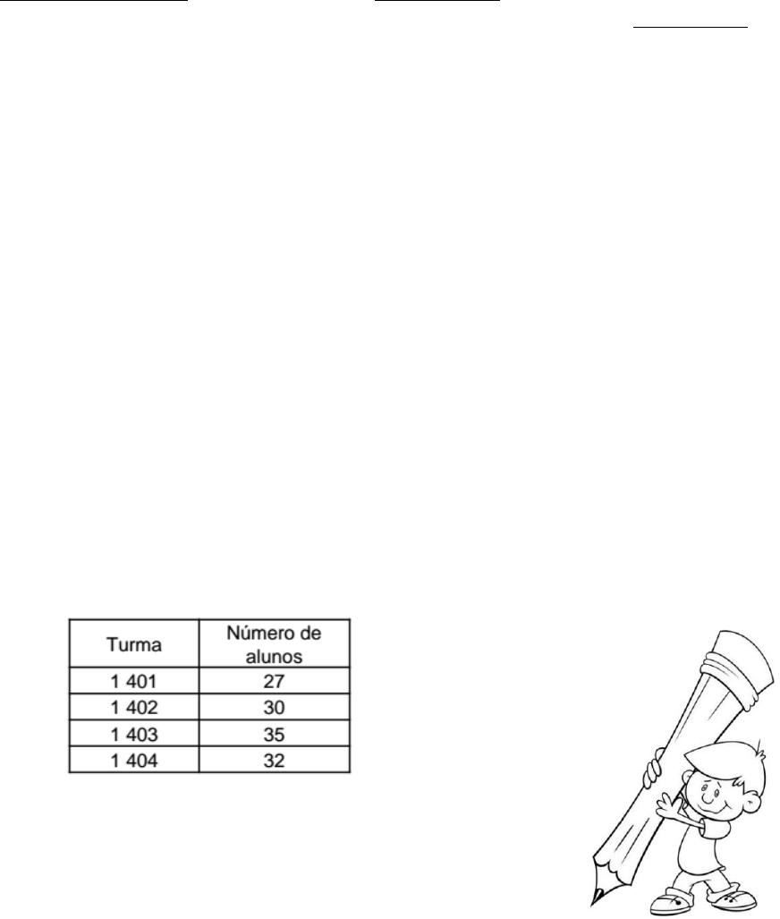 ESCOLA MUNICIPAL PROFESSORA IRENE CÂNDIDA DE JESUS Profª.: Jezaine Teodoro Série: 4º Ano “B” Data: ____ /____ /2017 Aluno(a): _____________________________________ Valor: (4,0) . Obteve: ________ 1ª AVALIAÇÃO DE MATEMÁTICA DO 1º BIMESTRE • Leia com atenção e depois responde as questões abaixo: 1) A professora de Gabriel ditou o número cinco mil, quatrocentos e quinze. Qual das alternativas abaixo corresponde ao número ditado? (0,2) (a) 1000410015 (c) 100040015 (b) 1000415 (d) 1.415 2) A Professora de Kamilly passou um desafio para seus alunos. Queria que eles descobrissem que número possui 3 unidades de milhar, 5 centenas, 8 dezenas e 4 unidades. Este número é: (0,2) (a) 3.558. (c) 2.584. (b) 3.684. (d) 3.584. 3) Na tabela abaixo, temos o número de alunos do 4º Ano de uma Escola Municipal. A turma, com o menor número de alunos, é: (0,2) (a) 1 401. (c) 1 402. (b) 1 403. (d) 1 404. • Agora, escreva esse número por extenso. _______________________________________________________________ 4) Wanderson está colecionando bolinhas de gude. Hoje, ele completou 1.960 bolinhas de gude em sua coleção. Este número é composto por: (0,2) (a) 1 unidade de milhar, 9 dezenas e 6 unidades. (b) 1 unidade de milhar, 9 centenas, 6 dezenas e 0 unidade. (c) 1 unidade de milhar, 60 unidades. (d) 1 unidade de milhar, 90 unidades. 5) O pai de Maria Gabriela tinha 1.845 bois. Comprou mais 691 bois e logo em seguida vendeu 185 deles para o frigorífico. Quantos bois o pai de Maria Gabriela tem agora? (0,4) (a) 3.551 (c) 2.451 (b) 2.351 (d) 2.691 6) No ábaco abaixo, Amanda representou um número. Qual foi o número? (0,2) (a) 1.314 (b) 4.131 (c) 10.314 (d) 41.301 7) Um número é composto de: (0,2) • Esse número é: (a) 987. (b) 871. (c) 1 789. (d) 9 871. 8) Adair Henrique está organizando uma torcida para os jogos da Copa do Mundo. Ele comprou 1.256 camisas para adultos e 927 camisas para crianças. Adair Henrique comprou: (0,2) (a) 2.384 camisas. (b) 2.383 camisas. (c) 2.183 camisas. (d) 1.373 camisas. 9) Na fazenda que Ranielly mora tinha 3.420 galinhas para abater. Já abateu 1.750. Quantas ainda faltam para abater? (0,2) Cálculo Resposta _________________________________________ _________________________________________ Na representação decimal dos números, cada ordem tem um nome. A palavra ordem é utilizada nos textos de matemática para se referir ao lugar que cada algarismo ocupa. 10) Observe a figura: (0,4) Agora com base na placa do veículo, faça o que se pede: a) Quantas ordens tem o número que identifica o ônibus? ______ b) Qual é o algarismo que ocupa a ordem das dezenas de milhar? ____________________ c) Qual é o nome da ordem ocupada pelo número 5? ______________________________ d) Qual é o número que ocupa a ordem das dezenas simples? _______________________ 11) Num estacionamento há 3.150 automóveis e 632 motocicletas. a) Quantos veículos há ao todo nesse estacionamento? (0,3) Cálculo Resposta _________________________ _________________________ b) Se do total de veículos que estão no estacionamento saírem 632 automóveis, quantos veículos sobrarão? (0,3) Cálculo Resposta _________________________________________ _________________________________________ 12) Resolva as operações e verifique se estão corretas, tirando a prova real. (1,0)
