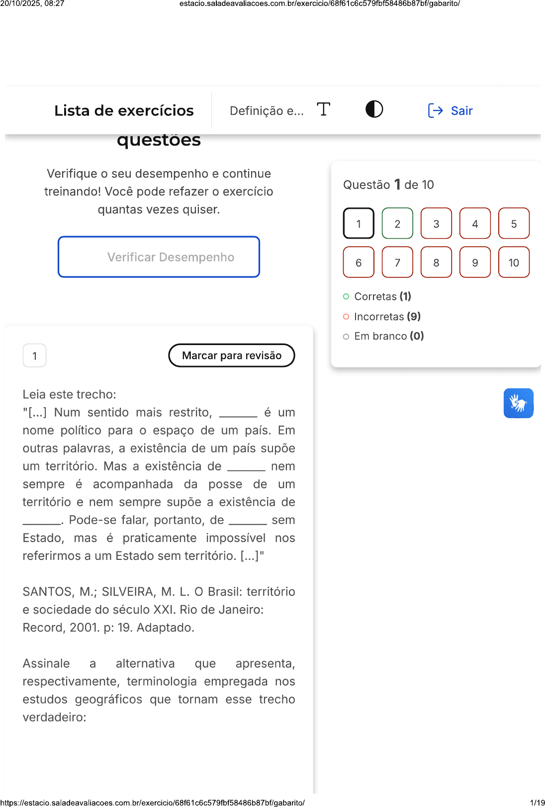 20/10/2025, 08:27 estacio.saladeavaliacoes.com.br/exercicio/68f61c6c579fbf58486b87bf/gabarito/ Lista de exercícios Definição e... T Sair questões Verifique seu desempenho e continue Questão 1 de 10 treinando! Você pode refazer exercício quantas vezes quiser. 1 2 3 4 5 Verificar Desempenho 6 7 8 9 10 Corretas (1) Incorretas (9) Em branco (0) 1 Marcar para revisão Leia este trecho: "[...] Num sentido mais restrito, é um nome político para espaço de um país. Em outras palavras, a existência de um país supõe um território. Mas a existência de nem sempre é acompanhada da posse de um território e nem sempre supõe a existência de Pode-se falar, portanto, de sem Estado, mas é praticamente impossível nos referirmos a um Estado sem território. [...]" SANTOS, M.; SILVEIRA, M. L. Brasil: território e sociedade do século XXI. Rio de Janeiro: Record, 2001. p: 19. Adaptado. Assinale a alternativa que apresenta, respectivamente, terminologia empregada nos estudos geográficos que tornam esse trecho verdadeiro: 1/1920/10/2025, 08:27 estacio.saladeavaliacoes.com.br/exercicio/68f61c6c579fbf58486b87bf/gabarito/ Território; uma nação; um Estado; A territorialidade. Territorialidade; um Estado; uma nação; território. Um Estado; territorialidade; uma c nação; território. Uma nação; territorialidade; um D Estado; território. E Território, Lugar; uma territorialidade. X Resposta incorreta Opa! A alternativa correta é a letra Confira gabarito comentado! Gabarito Comentado Território é um dos principais e mais utilizados termos da Geografia, pois está diretamente relacionado aos processos de construção e transformação do espaço geográfico. Sua definição varia conforme a corrente de pensamento ou a abordagem que se realiza. No passado, era descrito como um espaço delimitado por fronteiras, formando um Estado-Nação. Mas a conceituação mais comumente adotada relaciona ao espaço apropriado e delimitado a partir de uma relação de poder. 2/1920/10/2025, 08:27 estacio.saladeavaliacoes.com.br/exercicio/68f61c6c579fbf58486b87bf/gabarito/ 2 Marcar para revisão Adaptado de AMAUC 2019 Em setembro de 2015, representantes dos 193 Estados-membros da ONU se reuniram em Nova York e reconheceram que a erradicação da pobreza em todas as suas formas e dimensões, incluindo a pobreza extrema, é maior desafio global e um requisito indispensável para desenvolvimento sustentável. Ao adotarem documento "Transformando Nosso Mundo: A Agenda 2030 para Desenvolvimento Sustentável" (A/70/L.1), os países comprometeram-se a tomar medidas ousadas e transformadoras para promover o desenvolvimento sustentável nos próximos 15 anos sem deixar ninguém para trás. A Agenda 2030 é um plano de ação para as pessoas, planeta e a prosperidade, que busca fortalecer a paz universal. plano indica 17 Objetivos de Desenvolvimento Sustentável, os ODS, e 169 metas, para erradicar a pobreza e promover vida digna para todos, dentro dos limites do planeta. Nesse sentido, observe os itens abaixo: I Acabar com a pobreza em todas as suas formas, em todos os lugares; Acabar com a fome, alcançar a segurança alimentar e melhoria da nutrição e promover a agricultura sustentável; III Assegurar uma vida saudável e promover o bem-estar para todos, em todas as idades; IV Tornar as cidades e os assentamentos humanos inclusivos, seguros, resilientes e sustentáveis; V Reduzir a desigualdade dentro dos países e entre eles. 3/1920/10/2025, 08:27 estacio.saladeavaliacoes.com.br/exercicio/68f61c6c579fbf58486b87bf/gabarito/ Dos itens expostos acima, são, Objetivos de Desenvolvimento Sustentável, os ODS previstos na Agenda 2030: Apenas os itens I, II, III são ODS da A Agenda 2030. Apenas os itens I, II, III e IV são ODS da Agenda 2030. Todos os itens apresentados são ODS c da Agenda 2030. Apenas os itens e IV são ODS da D Agenda 2030. Todos os itens apresentados são ODS E da Agenda 2030, exceto item IV. Resposta correta Parabéns, você selecionou a alternativa correta. Confira gabarito comentado! Gabarito Comentado Os Objetivos de Desenvolvimento Sustentável (ODS) são um conjunto de metas propostas pela ONU para serem alcançadas até 2030. Esses objetivos abrangem diversas áreas, incluindo erradicação da pobreza, segurança alimentar, saúde e bem-estar, cidades sustentáveis e redução da desigualdade. Os itens I, II, III, IV e V apresentados na questão correspondem, respectivamente, aos Objetivos 1, 2, 3, 11 e 10 da Agenda 2030. Portanto, todos os itens 4/1920/10/2025, 08:27 apresentados são Objetivos de Desenvolvimento Sustentável previstos na Agenda 2030. 3 Marcar para revisão Adaptado de UNESC 2019 A Agenda 2030 consiste em uma Declaração da ONU, na qual se definiu 17 ODS (dezessete objetivos de desenvolvimento sustentável que deverão ser alcançados até ano de 2030). Os 17 Objetivos são integrados e indivisíveis, e mesclam, de forma equilibrada, as três dimensões do desenvolvimento sustentável: a econômica, a social e a ambiental. I. São como uma lista de tarefas a serem cumpridas pelos governos, a sociedade civil, o setor privado e todos os cidadãos na jornada coletiva para um 2030 sustentável. II. Nos próximos anos de implementação da Agenda 2030, os ODS e suas metas irão estimular e apoiar ações em áreas de importância crucial para a humanidade: Pessoas, Planeta, Prosperidade, Paz e Parcerias. III. Ao combinar os processos dos Objetivos do Milênio e os processos resultantes da Rio+20, a Agenda 2030 e os ODS inauguram uma nova fase para desenvolvimento dos países, que buscam integrar por completo todos os componentes do desenvolvimento sustentável e engajar todos os países na construção do futuro que queremos. IV. Os ODS têm no objetivo 4 a Educação de Qualidade que visa assegurar a educação inclusiva e equitativa de qualidade, e promover oportunidades de aprendizagem ao longo da vida para todos. 5/1920/10/2025, 08:27 Assinale a alternativa corret