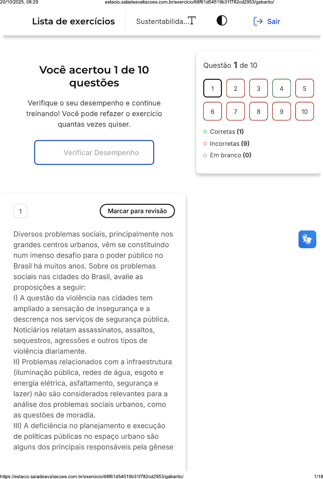 20/10/2025, 08:29 estacio.saladeavaliacoes.com.br/exercicio/68f61d54519b31f782cd2953/gabarito/ Lista de exercícios Sustentabilida T Sair Questão 1 de 10 Você acertou 1 de 10 questões 1 2 3 4 5 Verifique seu desempenho e continue treinando! Você pode refazer exercício 6 7 8 9 10 quantas vezes quiser. Corretas (1) Incorretas (9) Verificar Desempenho Em branco 1 Marcar para revisão Diversos problemas sociais, principalmente nos grandes centros urbanos, vêm se constituindo num imenso desafio para poder público no Brasil há muitos anos. Sobre os problemas sociais nas cidades do Brasil, avalie as proposições a seguir: I) A questão da violência nas cidades tem ampliado a sensação de insegurança e a descrença nos serviços de segurança pública. Noticiários relatam assassinatos, assaltos, sequestros, agressões e outros tipos de violência diariamente. II) Problemas relacionados com a infraestrutura (iluminação pública, redes de água, esgoto e energia elétrica, asfaltamento, segurança e lazer) não são considerados relevantes para a análise dos problemas sociais urbanos, como as questões de moradia. III) A deficiência no planejamento e execução de políticas públicas no espaço urbano são alguns dos principais responsáveis pela gênese 1/1820/10/2025, 08:29 estacio.saladeavaliacoes.com.br/exercicio/68f61d54519b31f782cd2953/gabarito/ e perpetuação dos problemas sociais nas cidades brasileiras. IV) A desigualdade social provoca agravamento dos problemas sociais. Uma distribuição de renda mais igualitária contribuiria para a diminuição dos problemas de saúde, moradia, educação e segurança nos espaços urbanos brasileiros. Assinale a alternativa correta: A As afirmativas I, e IV estão corretas. As afirmativas I, e IV estão corretas. c As afirmativas I, e III estão corretas. D As afirmativas II, III e IV estão corretas. As afirmativas I, II, III e IV estão E corretas. X Resposta incorreta A alternativa correta é a letra Confira gabarito comentado! Gabarito Comentado As afirmativas I, III e IV estão corretas, pois abordam corretamente os problemas sociais urbanos no Brasil. A afirmativa I destaca a violência e a sensação de insegurança nas cidades, a III ressalta a deficiência no planejamento e execução de políticas públicas como um dos principais responsáveis pelos problemas sociais, e a IV aponta a desigualdade social como um fator que agrava esses problemas. No 2/1820/10/2025, 08:29 entanto, a afirmativa está incorreta, pois os problemas relacionados à infraestrutura, como iluminação pública, redes de água, esgoto e energia elétrica, asfaltamento, segurança e lazer, são sim considerados relevantes para a análise dos problemas sociais urbanos, incluindo as questões de moradia. 2 Marcar para revisão É crime ambiental provocar, pela emissão de efluentes ou carreamento de materiais, perecimento de espécimes da fauna aquática existentes em rios, lagos, açudes, lagoas, baías ou águas jurisdicionais brasileiras, punível com pena de detenção, de um a três anos, ou multa, ou ambas cumulativamente. Incorre nas mesmas penas: I. Quem causa degradação em viveiros, açudes ou estações de aquicultura de domínio público. II. Quem explora campos naturais de invertebrados aquáticos e algas, sem licença, permissão ou autorização da autoridade competente. III. Quem fundeia embarcações ou lança detritos de qualquer natureza sobre bancos de moluscos ou corais, devidamente demarcados em carta náutica. Está(ão) correta(s) a(s) afirmativa(s): A I, e III. I, apenas 3/1820/10/2025, 08:29 estacio.saladeavaliacoes.com.br/exercicio/68f61d54519b31f782cd2953/gabarito/ c II, apenas D e III, apenas E III, apenas. X Resposta incorreta Opa! A alternativa correta é a letra Confira gabarito comentado! Gabarito Comentado Resposta correta: I, e III. artigo 33 da Lei de Crimes Ambientais (Lei n° 9.605/98) prevê que é crime ambiental provocar, pela emissão de efluentes ou carreamento de materiais, perecimento de espécimes da fauna aquática existentes em rios, lagos, açudes, lagoas, baías ou águas jurisdicionais brasileiras, punível com pena de detenção, de um a três anos, ou multa, ou ambas cumulativamente. artigo 34 da mesma lei prevê que incorre nas mesmas penas quem causa degradação em viveiros, açudes ou estações de aquicultura de domínio público; quem explora campos naturais de invertebrados aquáticos e algas, sem licença, permissão ou autorização da autoridade competente; e quem fundeia embarcações ou lança detritos de qualquer natureza sobre bancos de moluscos ou corais, devidamente demarcados em carta náutica. 4/1820/10/2025, 08:29 Portanto, as afirmativas I, e III estão corretas. 3 Marcar para revisão A Lei de Terras do Brasil, foi uma legislação pioneira que estabeleceu as bases para a organização fundiária do país. Esta lei foi um marco importante na história agrária brasileira, pois regulamentou a ocupação e a distribuição de terras no território nacional. Qual foi a primeira lei de terras do Brasil? A Lei n° 8.843/1911 Lei n° 4.504/1964 c Lei n° 6.453/1977 D Lei n° 601/1850 E Lei n° 6.938/1981 X Resposta incorreta Opa! A alternativa correta é a letra D. Confira gabarito comentado! Gabarito Comentado A Política Nacional de Meio Ambiente (PNMA) foi estabelecida pela Lei n° 6.938/1981. Esta legislação é considerada um marco na história ambiental do Brasil, 5/1820/10/2025, 08:29 estacio.saladeavaliacoes.com.br/exercicio/68f61d54519b31f782cd2953/gabarito/ pois instituiu os princípios e diretrizes para a gestão ambiental no país, promovendo a preservação, melhoria e recuperação da qualidade ambiental e do equilíbrio ecológico. 4 Marcar para revisão Os novos movimentos sociais, denominados coletivos, são diferentes das ações anteriores por politizarem a esfera privada e tornarem públicas as problemáticas das minorias sociais. Assim, dentre esses movimentos, des