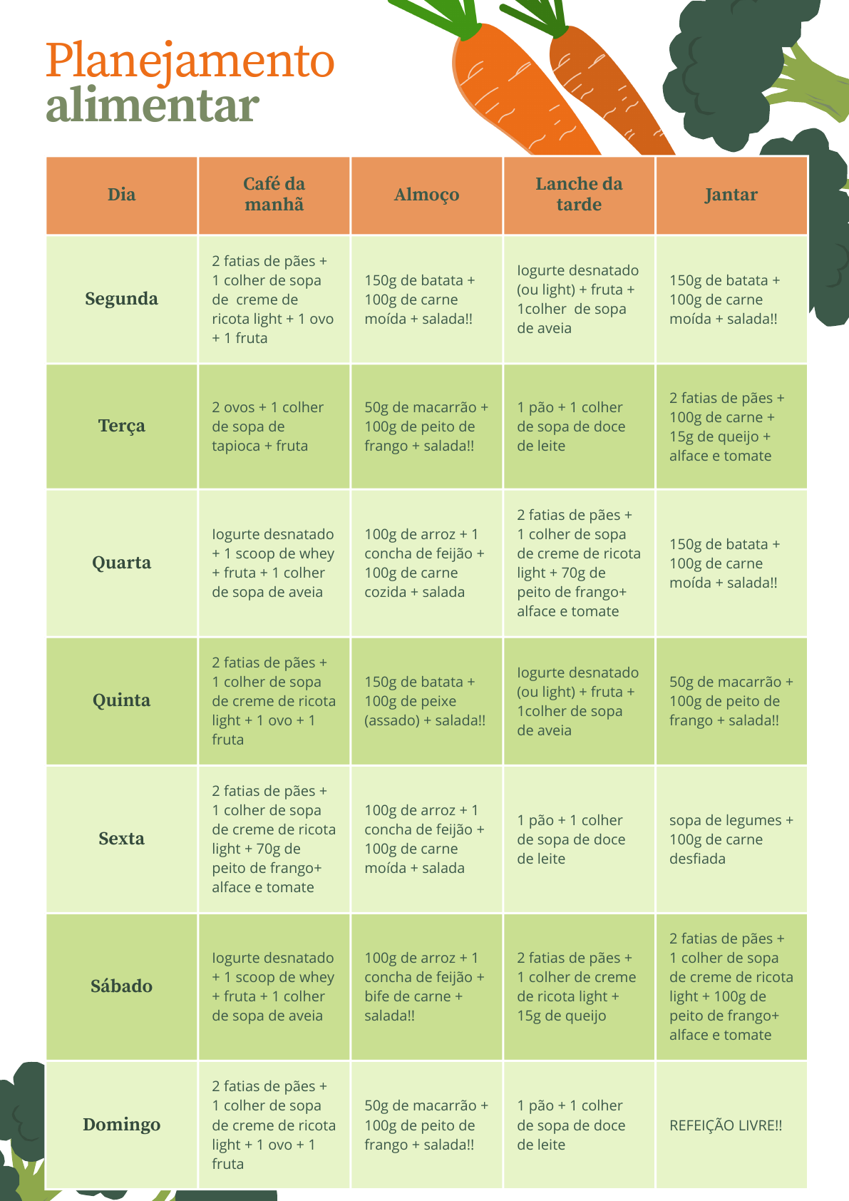 Dia Café da manhã Almoço Lanche da tarde Jantar Segunda 2 fatias de pães + 1 colher de sopa de creme de ricota light + 1 ovo + 1 fruta 150g de batata + 100g de carne moída + salada!! Iogurte desnatado (ou light) + fruta + 1colher de sopa de aveia 150g de batata + 100g de carne moída + salada!! Terça 2 ovos + 1 colher de sopa de tapioca + fruta 50g de macarrão + 100g de peito de frango + salada!! 1 pão + 1 colher de sopa de doce de leite 2 fatias de pães + 100g de carne + 15g de queijo + alface e tomate Quarta Iogurte desnatado + 1 scoop de whey + fruta + 1 colher de sopa de aveia 100g de arroz + 1 concha de feijão + 100g de carne cozida + salada 2 fatias de pães + 1 colher de sopa de creme de ricota light + 70g de peito de frango+ alface e tomate 150g de batata + 100g de carne moída + salada!! Quinta 2 fatias de pães + 1 colher de sopa de creme de ricota light + 1 ovo + 1 fruta 150g de batata + 100g de peixe (assado) + salada!! Iogurte desnatado (ou light) + fruta + 1colher de sopa de aveia 50g de macarrão + 100g de peito de frango + salada!! Sexta 2 fatias de pães + 1 colher de sopa de creme de ricota light + 70g de peito de frango+ alface e tomate 100g de arroz + 1 concha de feijão + 100g de carne moída + salada 1 pão + 1 colher de sopa de doce de leite sopa de legumes + 100g de carne desfiada Sábado Iogurte desnatado + 1 scoop de whey + fruta + 1 colher de sopa de aveia 100g de arroz + 1 concha de feijão + bife de carne + salada!! 2 fatias de pães + 1 colher de creme de ricota light + 15g de queijo 2 fatias de pães + 1 colher de sopa de creme de ricota light + 100g de peito de frango+ alface e tomate Domingo 2 fatias de pães + 1 colher de sopa de creme de ricota light + 1 ovo + 1 fruta 50g de macarrão + 100g de peito de frango + salada!! 1 pão + 1 colher de sopa de doce de leite REFEIÇÃO LIVRE!! Planejamento alimentar