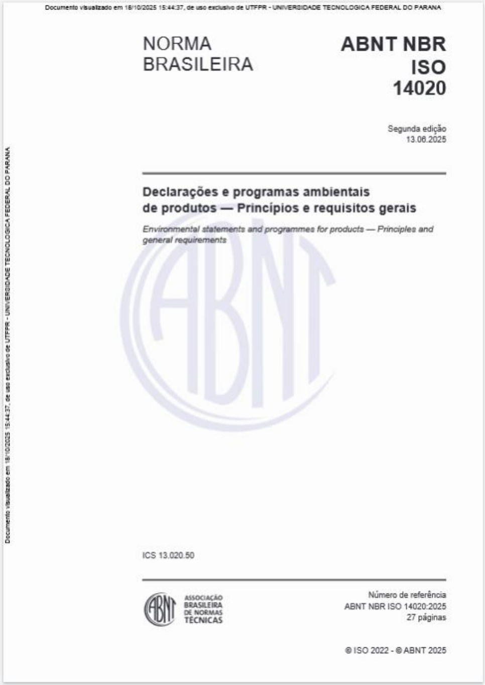Documento visualizado em 18/10/2025 de uso exclusivo de UTFPR - UNIVERSIDADE TECNOLOGICA FEDERAL DO PARANA NORMA ABNT NBR BRASILEIRA ISO 14020 Segunda edição 13.06.2025 Declarações e programas ambientais de produtos - Princípios e requisitos gerais Documento visualizado em 18/10/2025 de exclusivo de UTFPR UNIVERSIDADE TECNOLOGICA FEDERAL DO PARANA Environmental statements and programmes for products Principles and general requirements ICS ASSOCIAÇÃO Número de referência BRASILEIRA ABNT NBR ISO 14020:2025 DE NORMAS TECNICAS 27 páginas © ISO 2022 ABNT 2025Documento visualizado em 18/10/2025 de uso exclusivo de UTFPR UNIVERSIDADE TECNOLOGICA FEDERAL DO PARANA ABNT NBR ISO 14020:2025 Documento em 18/10/2025 de uso exclusivo de UNIVERSIDADE TECNOLOGICA FEDERAL DO PARANA ABNT © ISO 2022 Todos A menos que especificado de outro nenhuma parte desta publicação pode ser reproduzida ou utilizada por qualquer melo, eletrônico ou mecânico, fotocópia e sem permissão por escrito da ABNT, único representante da ISO no ABNT 2025 Todos direitos reservados A menos que especificado de outro modo, nenhuma parte desta publicação pode ser reproduzida ou utilizada por qualquer melo, eletrônico ou mecânico, e sem permissão por escrito da ABNT. ABNT Rua 1.131 01203-002 São Paulo SP Tel.: + 55 11 3017-3600 abnt@abnt.org.br www.abnt.org.br 2022 - ABNT 2025 Todos direitos reservadosDocumento visualizado em 18/10/2025 de uso exclusivo de UTFPR UNIVERSIDADE TECNOLOGICA FEDERAL DO PARANA ABNT NBR ISO 14020:2025 Sumário Página Prefácio Nacional Introdução vi 1 Escopo 1 2 Referências normativas 1 3 Termos e definições 1 4 8 4.1 Generalidades 8 4.2 Credibilidade 9 4.2.1 Principio 9 4.2.2 Fundamentação 9 Documento em 18/10/2025 de uso exclusivo de UNIVERSIDADE TECNOLOGICA FEDERAL DO PARANA 4.3 Metodologia com base em evidências 9 4.3.1 Principio 9 4.3.2 Fundamentação 9 4.4 e disponibilidade 9 4.4.1 Principio 9 4.4.2 Fundamentação 9 4.5 Confidencialidade 9 4.5.1 Principio 9 4.5.2 Fundamentação 10 4.6 Perspectiva do ciclo de vida 10 4.6.1 Principio 10 4.6.2 Fundamentação 10 4.7 Melhoria e inovação do desempenho ambiental 10 4.7.1 Principio 10 4.7.2 Fundamentação 10 4.8 Acessibilidade e evitação de informações e demandas administrativas desnecessárias 10 4.8.1 Principio 10 4.8.2 Fundamentação 11 4.9 Partes interessadas e consulta 11 4.9.1 11 4.9.2 Fundamentação 11 4.10 Voluntário 11 4.10.1 Principio 11 4.10.2 Fundamentação 11 4.11 Regionalidade 12 4.11.1 12 4.11.2 Fundamentação 12 5 Tipos de declarações ambientais 12 5.1 Generalidades 12 5.2 Autodeclaração ambiental 12 © IBO 2022 ABNT 2025 Todos reservados iiiDocumento visualizado em 18/10/2025 15:44:37 de uso exclusivo de UTFPR UNIVERSIDADE TECNOLOGICA FEDERAL DO PARANA ABNT NBR ISO 14020:2025 5.3 Rótulo ecológico 12 5.5 Comunicação de pegada 13 6 Requisitos gerais para programas de declaração ambiental 13 6.1 Programa de declaração ambiental 13 6.2 Proprietário e operador de programa de declaração ambiental 15 6.3 Envolvimento das partes interessadas 16 6.4 Escopo do programa, partes responsáveis e público pretendido 16 6.5 Requisitos e critérios especificados 17 6.6 Metodologias de quantificação, qualidade dos dados e elaboração de relatórios 17 6.7 Avaliação da conformidade 18 6.8 Formato de declarações ambientais, elaboração de relatórios e publicações 18 6.9 Alterações ou revisões dos programas de declaração ambiental, dos requisitos Documento em 18/10/2025 de exclusivo de UNIVERSIDADE TECNOLOGICA FEDERAL DO PARANA e dos critérios especificados e das declarações ambientais 19 7 Requisitos gerais para declarações ambientais 20 7.1 Generalidades 20 7.2 Declarações vagas ou não especificas 21 7.3 Declarações de sustentabilidade 21 7.4 Declarações ambientais comparativas 21 7.5 Uso de informações de apoio 22 7.6 Uso de simbolos e gráficos em declarações ambientais 22 7.7 Outras informações ou declarações 23 Anexo A (informativo) Exemplo de um programa de declaração ambiental simples para uma autodeclaração ambiental 24 Bibliografia 26 Figuras Figura 1 Estrutura da familia ABNT NBR ISO 14020 vii Tabelas Tabela 1 Elementos de um programa de declaração ambiental aplicável a diferentes tipos de declaração ambiental 14 Tabela A.1 Exemplo de um programa de declaração ambiental simples para uma autodeclaração ambiental 24 iv 2022 - ABNT 2025 Todos direitos reservadosDocumento visualizado em 18/10/2025 de uso exclusivo de UTFPR UNIVERSIDADE TECNOLOGICA FEDERAL DO PARANA ABNT NBR ISO 14020:2025 Prefácio Nacional Brasileira de Normas Técnicas (ABNT) é 0 Foro Nacional de Normalização. As Normas Brasileiras, cujo conteúdo é de responsabilidade dos Brasileiros dos Organismos de Normalização Setorial (ABNT/ONS) e das Comissões de Estudo Especiais são elaboradas por Comissões de Estudo (CE), formadas pelas partes interessadas no tema objeto da Os Documentos Técnicos internacionais adotados são elaborados conforme as regras da ABNT Diretiva 3. AABNT chama atenção para que, apesar de ter sido solicitada manifestação sobre eventuais direitos de patentes durante Consulta Nacional, estes podem ocorrer e devem ser comunicados à ABNT Documento em 18/10/2025 de exclusivo de UNIVERSIDADE TECNOLOGICA FEDERAL DO PARANA qualquer momento (Lei de 14 de maio de 1996). Os Documentos Técnicos assim como 85 Normas Internacionais (ISO e IEC), são voluntários e não incluem requisitos legais ou estatutários. Os Documentos Técnicos ABNT não substituem Leis, Decretos ou BOS quais os usuários devem atender, tendo precedência sobre qualquer Documento Técnico ABNT. Ressalta-se que os Documentos Técnicos ABNT podem ser objeto de citação em Regulamentos Técnicos. Nestes casos, os órgãos responsáveis pelos Regulamentos Técnicos podem determinar as datas para exigência dos requisitos de quaisquer Documentos Técnicos ABNT. A ABNT NBR ISO 14020 foi el