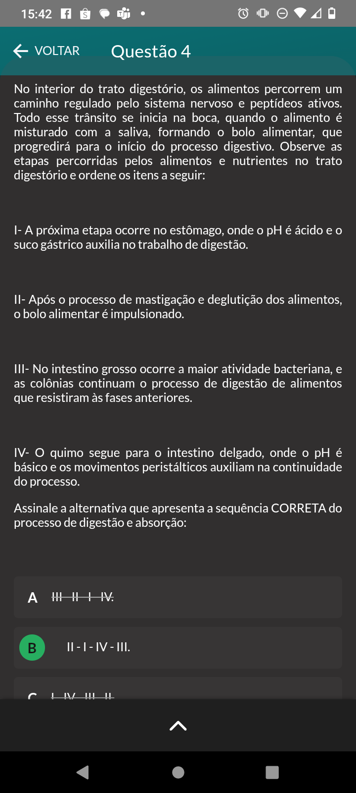15:42 f S VOLTAR Questão 4 No interior do trato digestório, os alimentos percorrem um caminho regulado pelo sistema nervoso e peptídeos ativos. Todo esse trânsito se inicia na boca, quando alimento é misturado com a saliva, formando bolo alimentar, que progredirá para o início do processo digestivo. Observe as etapas percorridas pelos alimentos e nutrientes no trato digestório e ordene os itens a seguir: I- A próxima etapa ocorre no estômago, onde pH é ácido e suco gástrico auxilia no trabalho de digestão. II- Após o processo de mastigação e deglutição dos alimentos, o bolo alimentar é impulsionado. III- No intestino grosso ocorre a maior atividade bacteriana, e as colônias continuam o processo de digestão de alimentos que resistiram às fases anteriores. IV- quimo segue para o intestino delgado, onde pH é básico e os movimentos peristálticos auxiliam na continuidade do processo. Assinale a alternativa que apresenta a sequência CORRETA do processo de digestão e absorção: A - - IV - III.