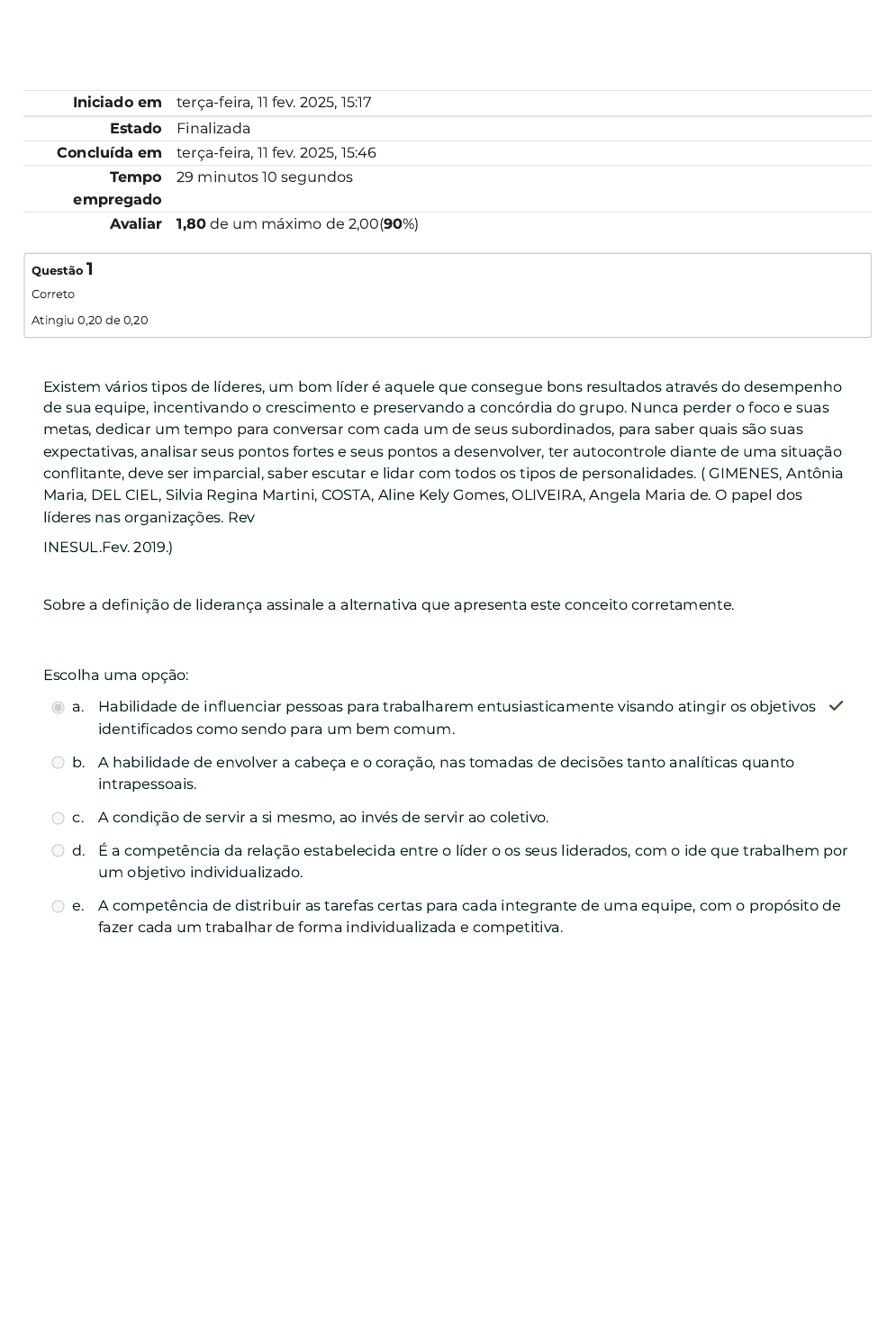 Iniciado em terça-feira, 11 fev. 2025, 15:17 Estado Finalizada Concluída em terça-feira, 11 fev. 2025, 15:46 Tempo empregado 29 minutos 10 segundos Avaliar 1,80 de um máximo de 2,00(90%) Questão 1 Correto Atingiu 0,20 de 0,20 Existem vários tipos de líderes, um bom líder é aquele que consegue bons resultados através do desempenho de sua equipe, incentivando o crescimento e preservando a concórdia do grupo. Nunca perder o foco e suas metas, dedicar um tempo para conversar com cada um de seus subordinados, para saber quais são suas expectativas, analisar seus pontos fortes e seus pontos a desenvolver, ter autocontrole diante de uma situação conflitante, deve ser imparcial, saber escutar e lidar com todos os tipos de personalidades. ( GIMENES, Antônia Maria, DEL CIEL, Silvia Regina Martini, COSTA, Aline Kely Gomes, OLIVEIRA, Angela Maria de. O papel dos líderes nas organizações. Rev INESUL.Fev. 2019.) Sobre a definição de liderança assinale a alternativa que apresenta este conceito corretamente. Escolha uma opção: a. Habilidade de influenciar pessoas para trabalharem entusiasticamente visando atingir os objetivos identificados como sendo para um bem comum. ✓ b. A habilidade de envolver a cabeça e o coração, nas tomadas de decisões tanto analíticas quanto intrapessoais. c. A condição de servir a si mesmo, ao invés de servir ao coletivo. d. É a competência da relação estabelecida entre o líder o os seus liderados, com o ide que trabalhem por um objetivo individualizado. e. A competência de distribuir as tarefas certas para cada integrante de uma equipe, com o propósito de fazer cada um trabalhar de forma individualizada e competitiva. Questão 2 Incorreto Atingiu 0,00 de 0,20 Hoje, mais do que nunca, o trabalho em equipe tem sido incentivado em praticamente todas as áreas da atividade humana. Isso porque torna um estímulo para o crescimento de cada indivíduo integrante. Antes de discutir as questões que envolvem o trabalho em equipe e a importância do mesmo para o sucesso da organização, vale destacar que equipe é diferente de grupo (AVILA, Robson Nery; COUTO, Sabrina Valverdade. A importância do trabalho em equipe: uma revisão de literatura. Faculdade Católica, 2013). Considerando essas diferenças sobre a definição entre grupos e equipes, leia as afirmativas abaixo e assinale a alternativa correta. I - O grupo assim é definido como um conjunto de pessoas que trabalham para alcançar um bem comum. II - Uma equipe é organizada através da realização de tarefas que sao relevantes para a missão da organização a qual pertencem. III - Uma equipe assim é definida como um conjunto de pessoas que trabalham para alcançar um bem comum. IV - Um grupo é organizado através da realização de tarefas que sao relevantes para a missão da organização a qual pertencem. Escolha uma opção: a. I e III estão corretos. × b. I e IV estão corretos. c. II e III estão corretos. d. II e IV estão corretos. e. I e II estão corretos. Questão 3 Correto Atingiu 0,20 de 0,20 No mundo contemporâneo do trabalho existem três fatores críticos segundo Muchinsky (2004): a grande quantidade de informações e opções de conhecimentos, a educação e treinamento dos gestores e as atividades de trabalho que estão mudando de forma rápida (AVILA, Robson Nery; COUTO, Sabrina Valverdade. A importância do trabalho em equipe: uma revisão de literatura. Faculdade Católica, 2013). Considerando os fatores, relacione eles com seus conceitos e depois assinale a alternativa correta. 1 - Grande quantidade de informações 2 - Educação e treinamento 3 - Mudança nas atividades de trabalho. ( ) Executivos mais qualificados e dispostos a atender as exigências do trabalho em equipe. ( ) as equipes recebe e adaptam as condições de trabalho que estão em mudanças. ( ) Informações de diversas pessoas que devem ser processadas a favor das questões do trabalho. Escolha uma opção: a. 1, 2, 3. b. 2, 3, 1. ✓ c. 3, 1, 2. d. 3, 2, 1. e. 2, 1, 3. Questão 4 Correto Atingiu 0,20 de 0,20 A liderança está relacionada na capacidade do líder ser prestativo para assim, refletir uma boa aparência para seus funcionários. Um bom líder deve ser observador para saber como está o comportamento da sua equipe para poder direcioná-los de forma que venham render dentro do ambiente de trabalho (CHIAVENATO, 2009 in GRANEZ, Carlos Roger Lemes, BORTOLUZZI, Citania Aparecida Pilatti, BISSANI, Niloar. O perfil da liderança como fator de sucesso nas organizações. Tecnológica. v 5, n 2, 2016). Sobre a função do líder, analise as sentenças abaixo e indique F para falso e V para verdadeiro, e depois assinale a alternativa correta. ( )O líder não deve tentar influenciar a personalidade dos liderados, mas sim direcioná-los mostrando o melhor caminho. ( ) O líder deve motivar os funcionários durante o trabalho em equipe, promovendo e garantindo o bom andamento e rendimento das empresas. ( )Ele é a peça chave para promover e acionar a motivação, garantindo que todos alcancem os objetivos propostos pela organização. ( ) A função do líder é de motivar seus liderados, uma vez que a motivação ocorre de forma externa. Escolha uma opção: a. V, F, V, F. ✓ b. V, F, V, V. c. V, V, V, V. d. V, V, V, F. e. F, F, V, V. Questão 5 Correto Atingiu 0,20 de 0,20 O estudo do Comportamento Organizacional é abrangente e também trata a respeito da Motivação, definida como “um estado interior que induz uma pessoa a assumir determinados tipos de comportamento” (SPECTOR, 2012, p. 284), e que motivar é: “ser capaz de influenciar pessoas de tal maneira que elas decidam esforçar-se mais para atingir um alvo estabelecido por você” (HAGGAI, 2004, p. 129). SPECTOR, P. Psicologia nas organizações. São Paulo: Saraiva, 2012. HAGGAI, J. E. Negócios & relacionamentos: os 7 segredos do poder da amizade nos negócios. 1. ed. Campinas: Instituto Haggai, 2004. A esse respeito,
