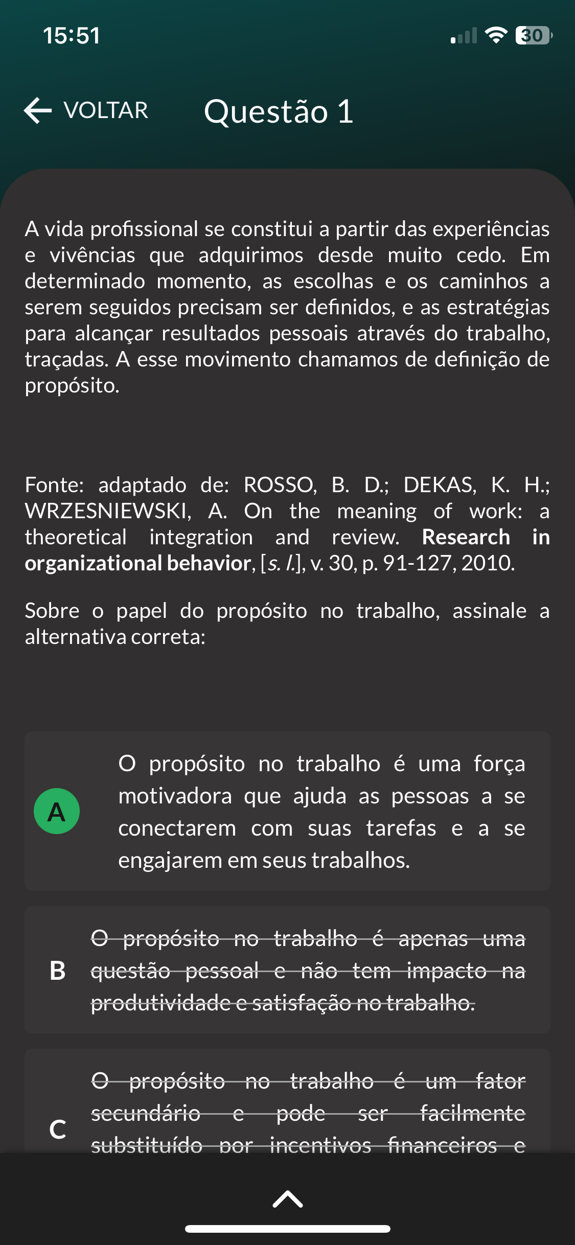 15:51 30 VOLTAR Questão 1 A vida profissional se constitui a partir das experiências e vivências que adquirimos desde muito cedo. Em determinado momento, as escolhas e os caminhos a serem seguidos precisam ser definidos, e as estratégias para alcançar resultados pessoais através do trabalho, traçadas. A esse movimento chamamos de definição de propósito. Fonte: adaptado de: ROSSO, B. D.; DEKAS, K. H.; WRZESNIEWSKI, A. On the meaning of work: a theoretical integration and review. Research in organizational behavior, [s. /.], V. 30, p. 91-127, 2010. Sobre papel do propósito no trabalho, assinale a alternativa correta: propósito no trabalho é uma força motivadora que ajuda as pessoas a se A conectarem com suas tarefas e a se engajarem em seus trabalhos. propósito no trabalho é apenas uma questão pessoal e não tem impacto na produtividade e satisfação no trabalho. propósito no trabalho é um fator secundário e pode ser facilmente c substituído por incentivos financeiros e