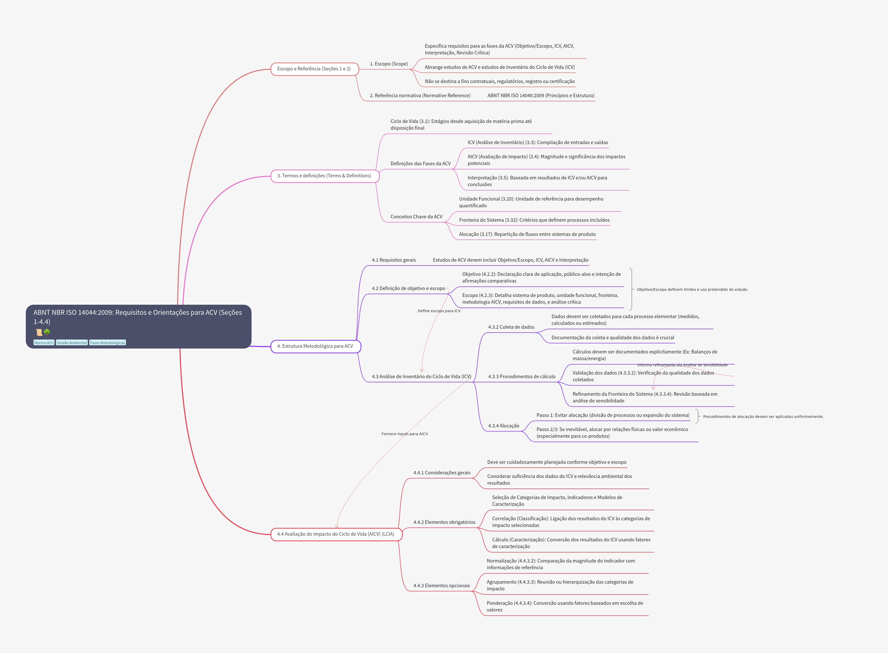 Especifica requisitos para as fases da ACV (Objetivo/Escopo, ICV, AICV, Interpretação, Revisão Crítica) 1. Escopo (Scope) Escopo Referência (Seções e 2) Abrange estudos de ACV estudos de Inventário do Ciclo de Vida (ICV) Não se destina a fins contratuais, regulatórios, registro ou certificação 2. Referência normativa (Normative Reference) ABNT NBR ISO 14040:2009 (Princípios e Estrutura) Ciclo de Vida (3.1): Estágios desde aquisição de matéria-prima até disposição final ICV (Análise de Inventário) (3.3): Compilação de entradas e saídas AICV (Avaliação de Impacto) (3.4): Magnitude e significância dos impactos Definições das Fases da ACV potenciais 3. Termos e definições (Terms & Definitions) Interpretação (3.5): Baseada em resultados de ICV e/ou AICV para conclusões Unidade Funcional (3.20): Unidade de referência para desempenho quantificado Conceitos Chave da ACV Fronteira do Sistema (3.32): Critérios que definem processos incluídos Alocação (3.17): Repartição de fluxos entre sistemas de produto 4.1 Requisitos gerais Estudos de ACV devem incluir Objetivo/Escopo, ICV, AICV e Interpretação Objetivo (4.2.2): Declaração clara de aplicação, público-alvo e intenção de afirmações comparativas 4.2 Definição de objetivo escopo Objetivo/Escopo definem limites uso pretendido do estudo. Escopo (4.2.3): Detalha sistema de produto, unidade funcional, fronteira, metodologia AICV, requisitos de dados, e análise crítica ABNT NBR ISO 14044:2009: Requisitos e Orientações para ACV (Seções Define escopo para ICV Dados devem ser coletados para cada processo elementar (medidos, 1-4.4) calculados ou estimados) 4.3.2 Coleta de dados Documentação da coleta qualidade dos dados é crucial Norma ACV Gestão Ambiental Fases Metodológicas 4. Estrutura Metodológica para ACV Cálculos devem ser documentados explicitamente (Ex: Balanços de massa/energia) refinamento Análise de Sensibilidade Validação dos dados (4.3.3.2): Verificação da qualidade dos dados 4.3 Análise de Inventário do Ciclo de Vida (ICV) 4.3.3 Procedimentos de cálculo coletados Refinamento da Fronteira do Sistema (4.3.3.4): Revisão baseada em análise de sensibilidade Passo 1: Evitar alocação (divisão de processos ou expansão do sistema) Procedimentos de alocação devem ser aplicados uniformemente 4.3.4 Alocação Passo 2/3: Se inevitável, alocar por relações físicas ou valor econômico Fornece inputs para AICV (especialmente para co-produtos) Deve ser cuidadosamente planejada conforme objetivo e escopo 4.4.1 Considerações gerais Considerar suficiência dos dados do ICV relevância ambiental dos resultados Seleção de Categorias de Impacto, Indicadores e Modelos de Caracterização Correlação (Classificação): Ligação dos resultados do ICV às categorias de 4.4.2 Elementos obrigatórios impacto selecionadas 4.4 Avaliação do Impacto do Ciclo de Vida (AICV) (LCIA) Cálculo (Caracterização): Conversão dos resultados do ICV usando fatores de caracterização Normalização (4.4.3.2): Comparação da magnitude do indicador com informações de referência Agrupamento (4.4.3.3): Reunião ou hierarquização das categorias de 4.4.3 Elementos opcionais impacto Ponderação (4.4.3.4): Conversão usando fatores baseados em escolha de valores