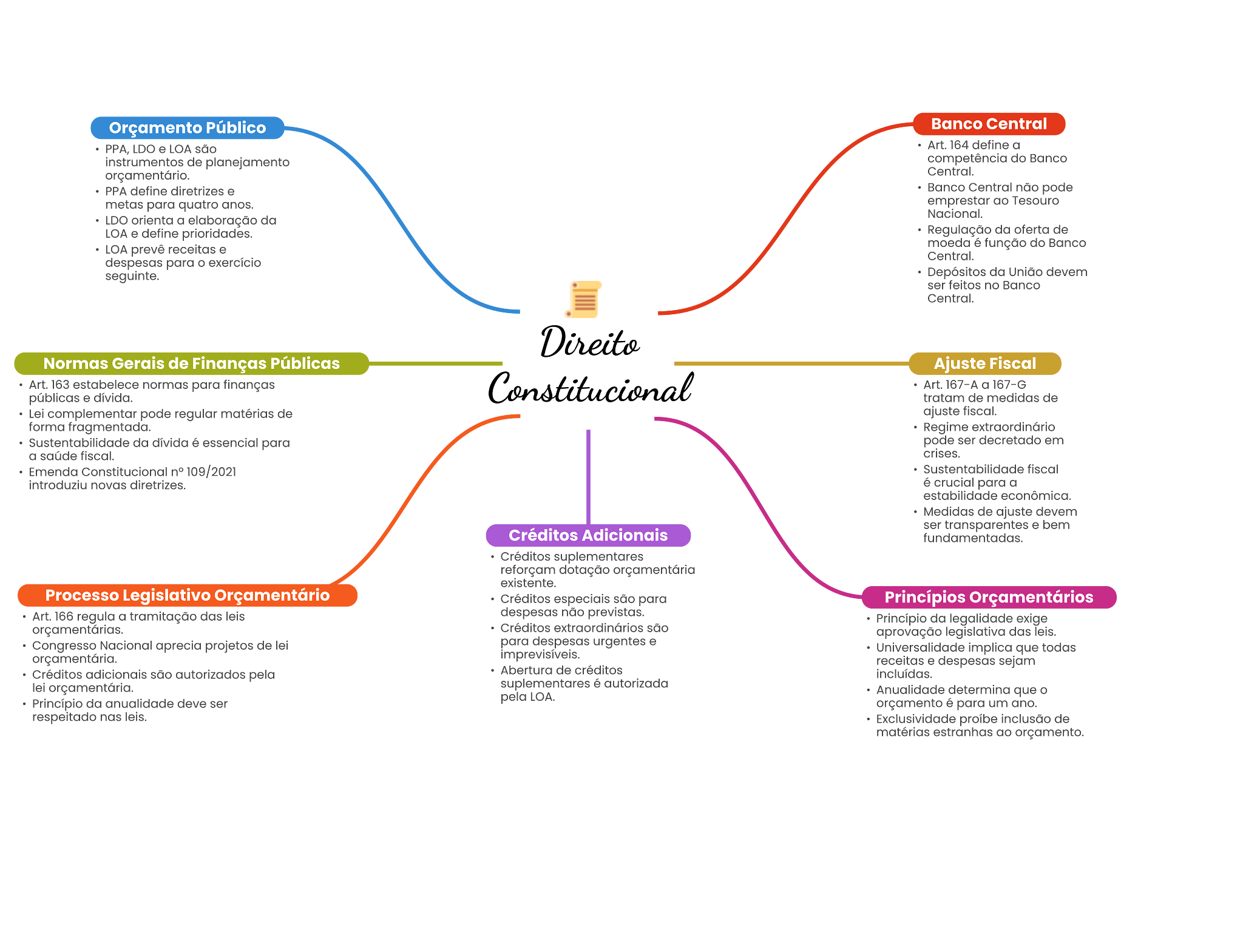 Orçamento Público Banco Central PPA, LDO . LOA são Art. 164 define a instrumentos de competência do Banco Central. PPA define Banco Central não pode metos para quatro emprestar Tescuro LDO a elaboração da LOA . define prioridades. Regulação da oferta de LOA mosda função do Banco Central. para exercício seguinte. da União devem feitos no Banco Central. Normas Gerais de Finanças Públicas Ajuste Fiscal Art. 163 estabelece normas para finanças Art. 167-A a 167-G públicas . tratam de de Lei complementor pode regular de forma fragmentada. Regime da é essencial para pode ser decretado em a Emenda Constitucional 109/2021 . fiscal novas diretrizes. é crucial para a estabilidade aconômica. de ajuste transparentes e bem Créditos Adicionais Créditos reforçam dotação orçamentária existente. Processo Legislativo Orçamentário Créditos são para Princípios Orçamentários Art. regula a tramitação dos não previstas. da legalidade exige Créditos extraordinários aprovação legislativa das leis. Congresso Nacional aprecia projetos de para . que todos receitas sejam Créditos são autorizados pela Abertura de créditos autorizada da deve ser pela LOA. Anualidade determina que o orçamento para um ano. nas Exclusividade de matérias estranhas orçamento.
